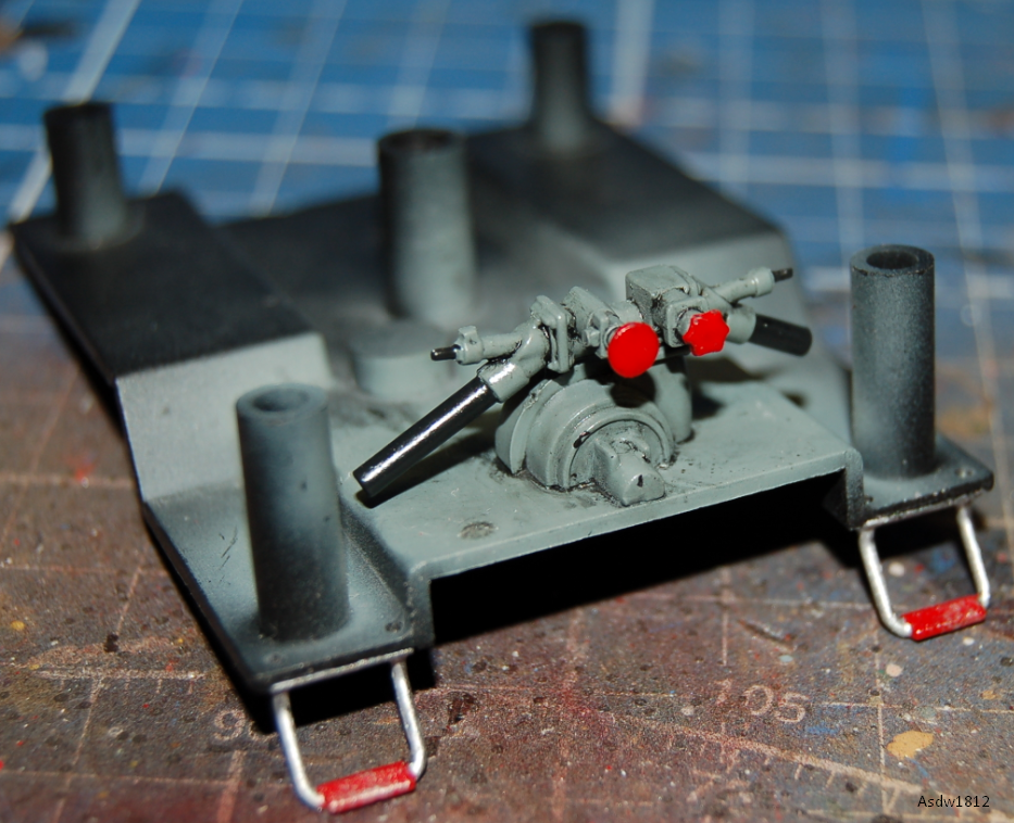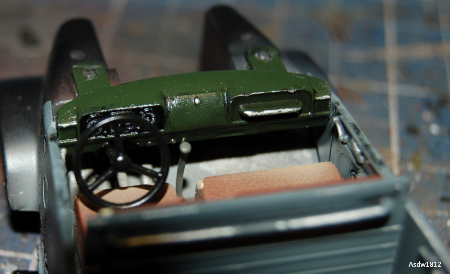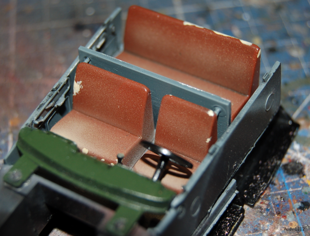 В огромные сколы на кабине проглядывает металл, из которого она изготовлена - долго с ней мучился - краска постоянно отлипала. Второй раз перекрашивать не стал, замаскировал как мог.