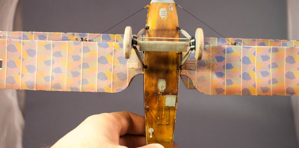 Когда я приступал к сборке, то больше всего боялся, что расчалки будут самым проблемным местом, все эти безумные ниточки вызывали нешуточное опасение, однако, как оказалось это, едва ли, не самая простая часть во всем процессе. В принципе все шло хорошо до момента нанесения декалей с лозенгом на крылья, декали оказались ломкими и толстоватыми,ложились плохо, к тому же я послушался производителя и по началу не приваривал и не размягчал их. Наконец, я плюнул на эти рекомендации и стал таки приваривать непослушный лозенг к поверхности-дело пошло веселее. Другая проблема вылезла уже на завершающем этапе: потные пальцы прожгли лак на бортах фюзеляжа, пришлось смывать отдельные панели и красить маслом и лаком заново, в чем причина такой засады я так и не понял.