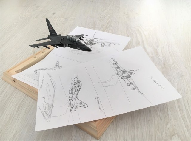 Модель снова выполнена в традиционной для меня полетной конфигурации. и традиционно сначала был сделан эскиз работы на бумаге. На зарисовке изобразил полет на больших углах атаки, поэтому жабры подпитки открыты и носки крыла отклонены. Жабры мне не очень удались, если честно, работать с такими мелкими ФТ деталями для меня ооочень сложно. пришлось повозиться и с отклоненными носками крыла, чтобы поставить их в положение вниз.