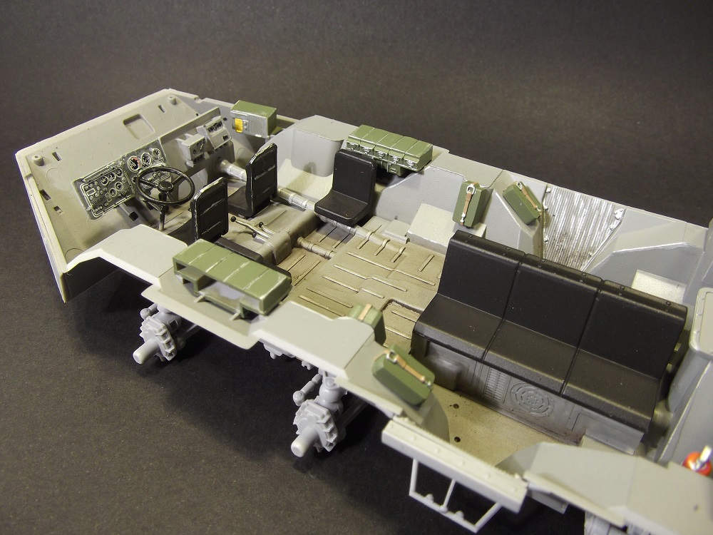 Теперь по самой модели. Качество самих деталей хорошее. Возможность проработать внутрянку. Корпус состоит из двух половин.Не обошлось без шпатлевки. Пришлось добавить сварные швы. Использовал травление. По сравнению с бтр 60 и 70 внутрянка мне показалась скучной.