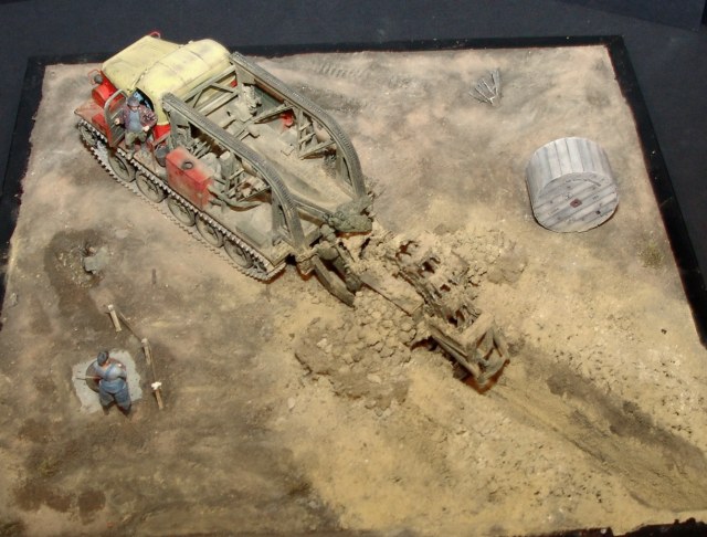 С основой диорамы решил не мудрить с разными новомодными рельефными пастами, а использовал мелкопросеянные землю песок со двора смешанный с густым ПВА. Подложка пенопласт, в котором прорезана траншея.