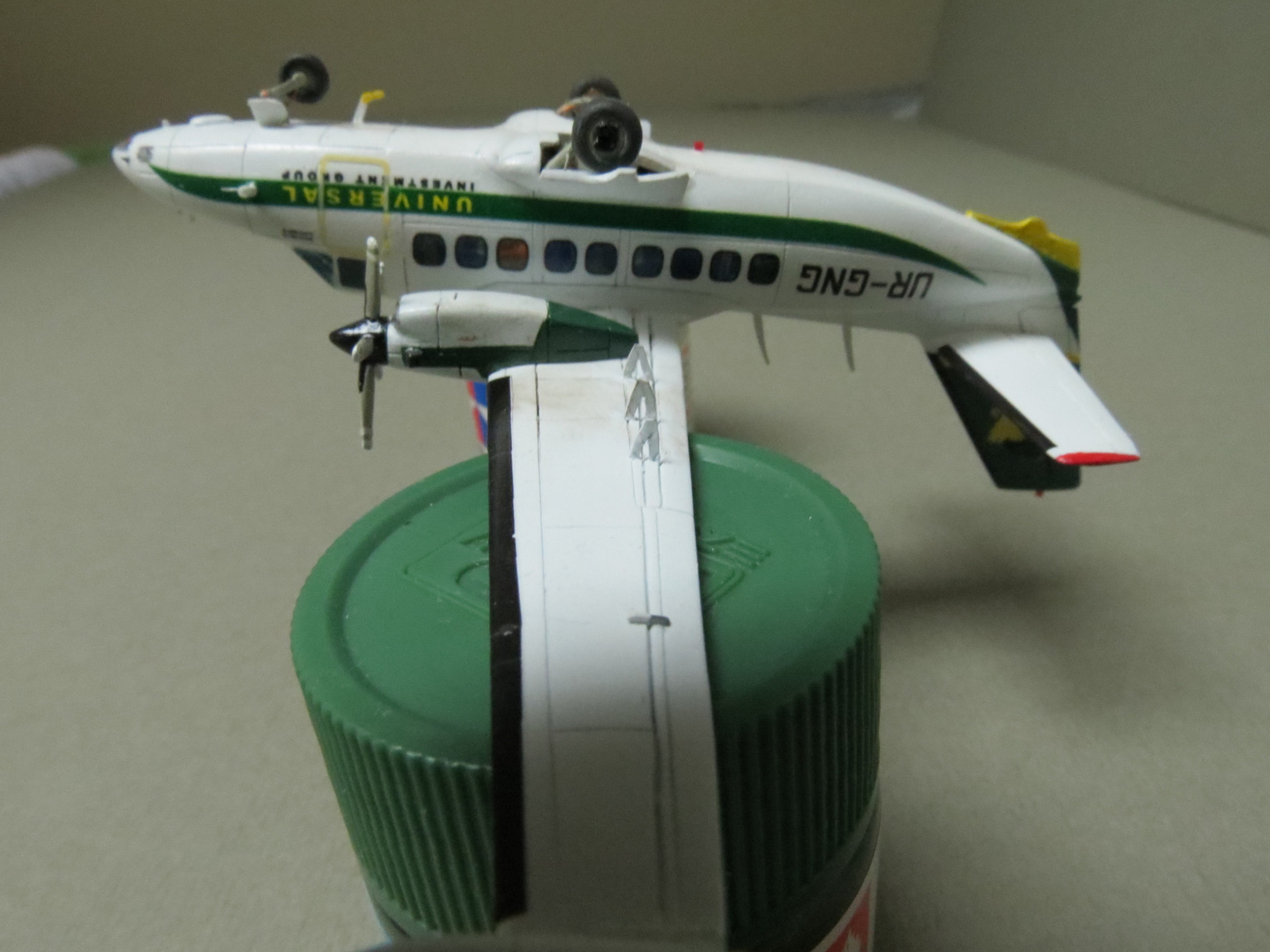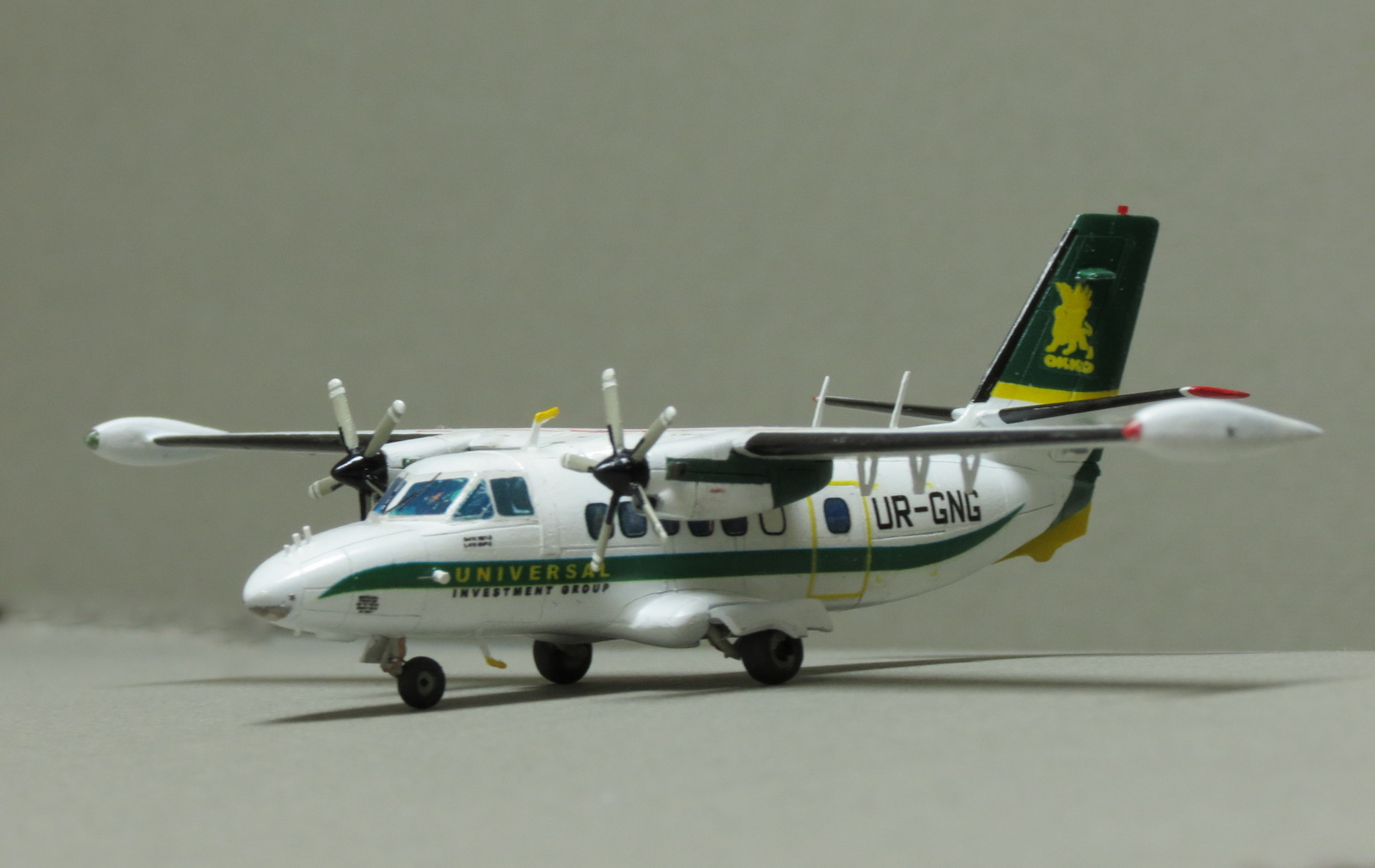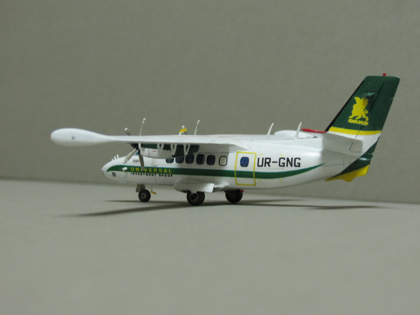 Тут есть одна проблема - все полосы ливреи на оригинале параллельны хорде самолёта, от фюзеляжа до хвоста. На модели же жёлтая полоса на киле вместе с надписью ОККО и львом с крыльями явно ушли на кабрирование, причём, очень сильно. Серьёзный непорядочек.