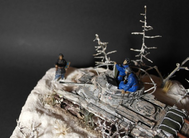 Николай, здравствуйте! В целом, работа не плоха. Снег у Вас получился на мой взгляд неплохо, Вашу идею с сосульками я позаимствую))) Могу посоветовать в будущих работах для имитации кустов и деревьев, особенно без листвы использовать корни растений- они более реалистично передают фактуру деревьев. Экипаж конечно лучше бы заменить, и правда уж дюже легко они одеты. Сама диорама дает ощущение довольно морозной зимы, тут более уместны люди в телогрейках, ушанках и ватниках (кажется у MiniArt есть такой набор танкистов). Снег немного неестественно лежит вокруг танка (как в капонире) и нет следов на снегу стоящего человека, хотя по идее он должен был натоптать снег вокруг. В общем, посоветую вам уделять больше внимания мелочам в работах, от них очень много зависит. Творческих успехов Вам в дальнейших работах! С уважением