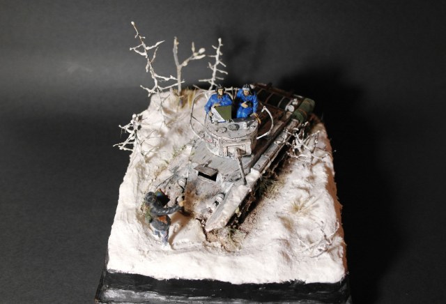 Уж больно глубоко Вы танк засадили, такое впечатление, что он уже на брюхе лежит, а значит вряд ли куда-то самостоятельно выберется. И пожалуй слишком яркие костюмчики у членов экипажа, тут надо было что-то блёклое, серо-синее подобрать.