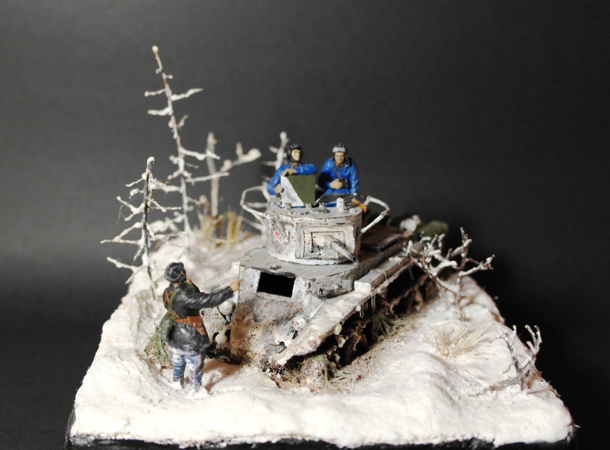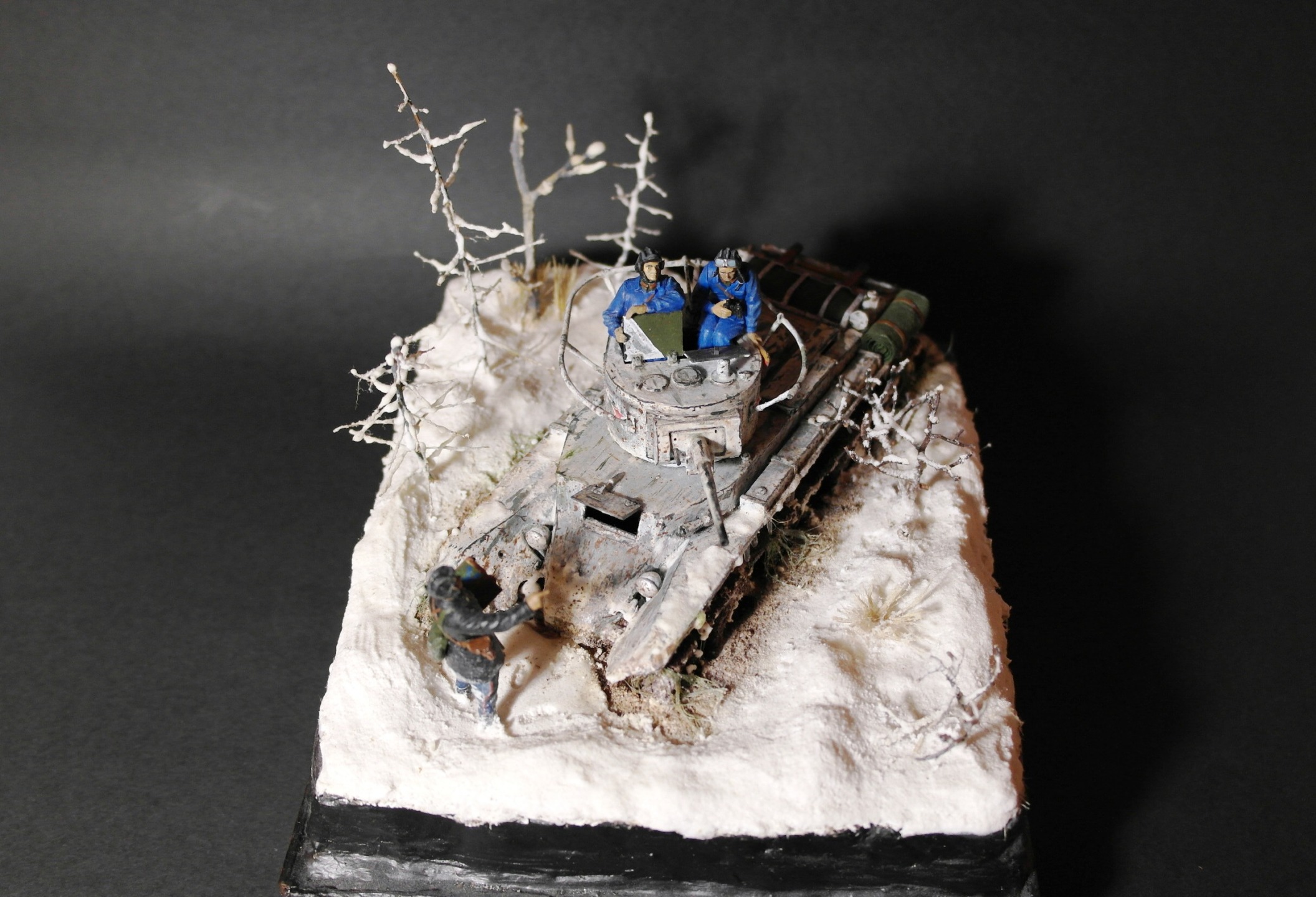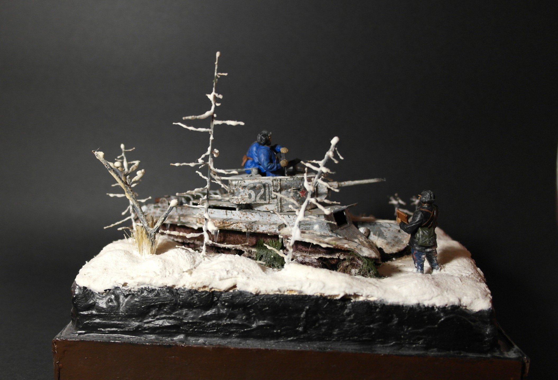 Доброго времени суток. Представляю свою очередную модель. Накопилось несколько диорам, все не было времени их разместить на сайте. Эта выполнена года два назад. Олицетворяет мой первый опыт в БТТ. Безнадежно испортил гусеницы, поэтому решил "закопать" танк в болоте. Зимний камуфляж наносил при помощи лака для волос. Тоже первый опыт. Фигурки из набора звезды. Модель полностью искоробочная, только скатка сделана из салфетки. Сосульки сделаны из литников. Основание гипс, кочки сантехнический лен покрытый гипсом. Трава и болотная трава также из льна. Куст - кисть рябины, сухие елки - сухие ветки аспарагуса Майера. Торф - спитый кофе.
