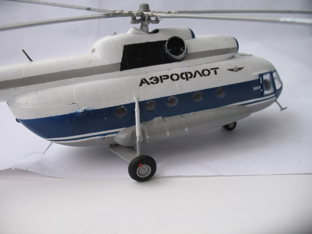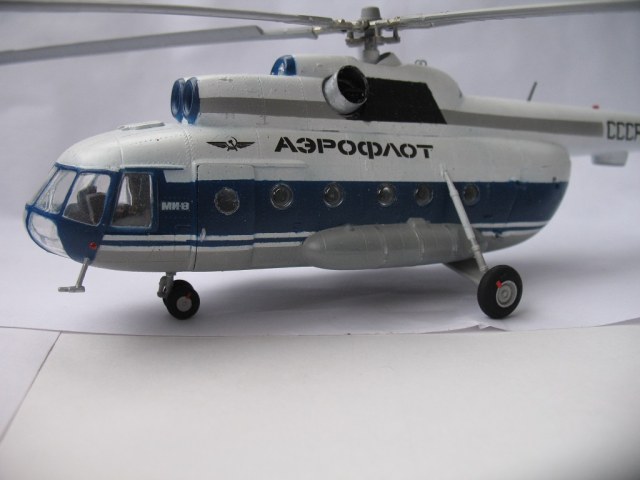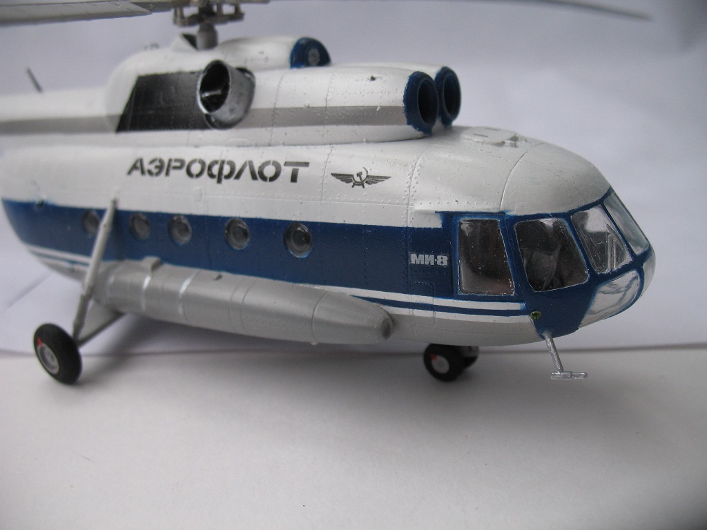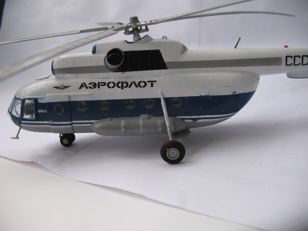 Модель Ми -8 от Звезды со всеми её косяками.Доработаны ручки створок-вновь изготовлены. Так же ручки гидроотсека.Сверху пилотской кабины добавлен люк выхода к силовой установке.Снизу добавлены обтекатели антенн АРК-9 и АРК- У2.Люк для подвески в полу грузовой кабины.Окраска Ганза Сверху лак Х-22. АНО колхозил из прозрачного литника-Фирменные кончились. Модель отправилась В Тобольск в дар однокашнику по училищу с авиационным уклоном.