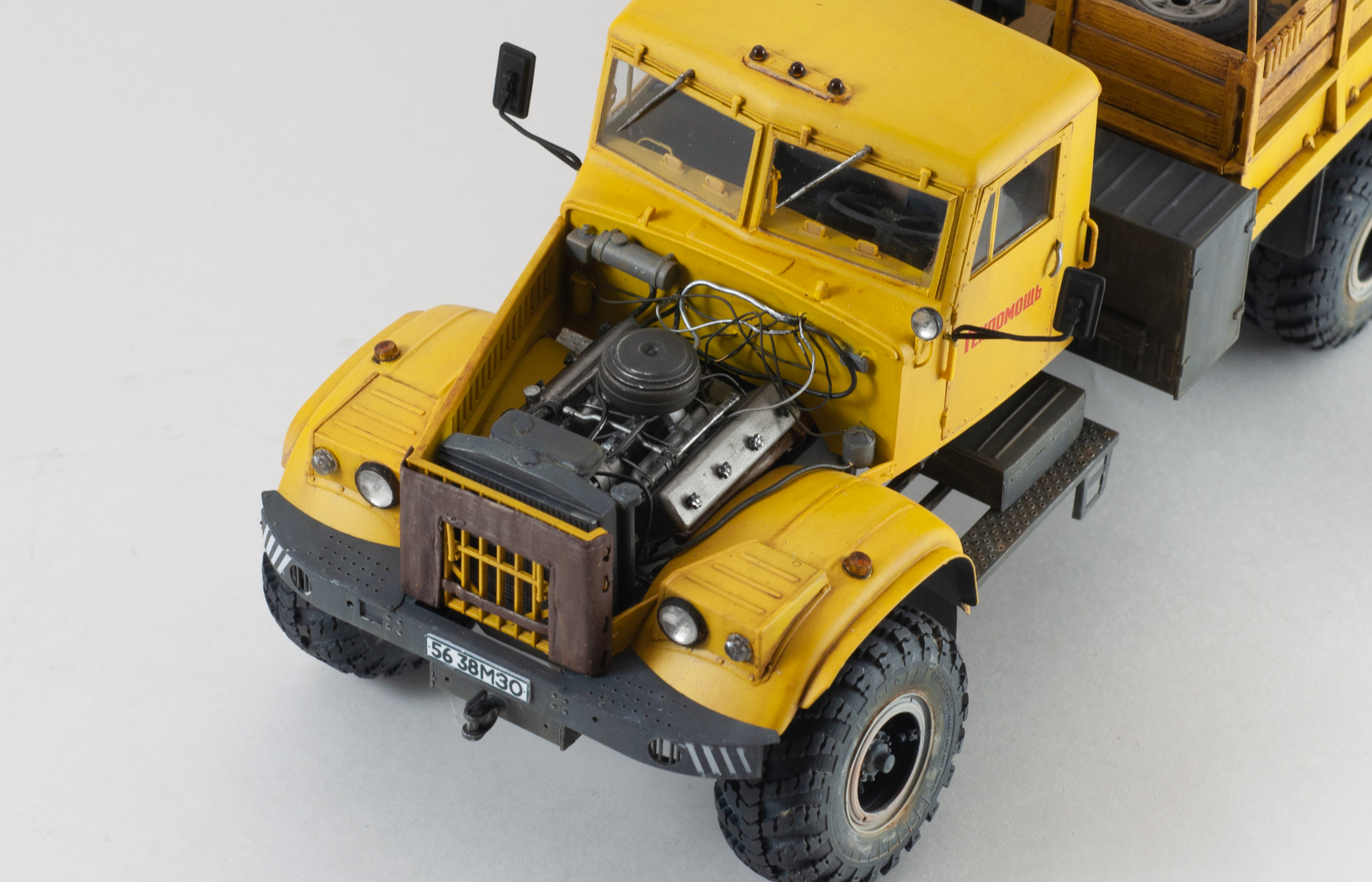 Получилось не совсем так, как хотел, но в целом результат мне нравится, хотя в конце работы уже смотреть на этот КрАЗ не мог. Как обычно попробовал разные новые техники. Обошёлся совсем без смывки, только масло, где-то жиже, где-то гуще. Жёлтый цвет довольно-таки тяжёлый, местами надул шагрень, пришлось шкурить. Поработал над ходовой, добавил проводку, топливопровод, трос, и по мелочи. Косяки набора не исправлял, не люблю, обычно доработки делаю ради зрелищности, а не в погоне за миллиметрами. Набор хорош, но есть несколько всем известных упрощений и лобовое стекло, которое можно сделать только открытым, хотя в анонсах обещали два варианта. Пришлось колхозить, чтобы закрыть стекло.