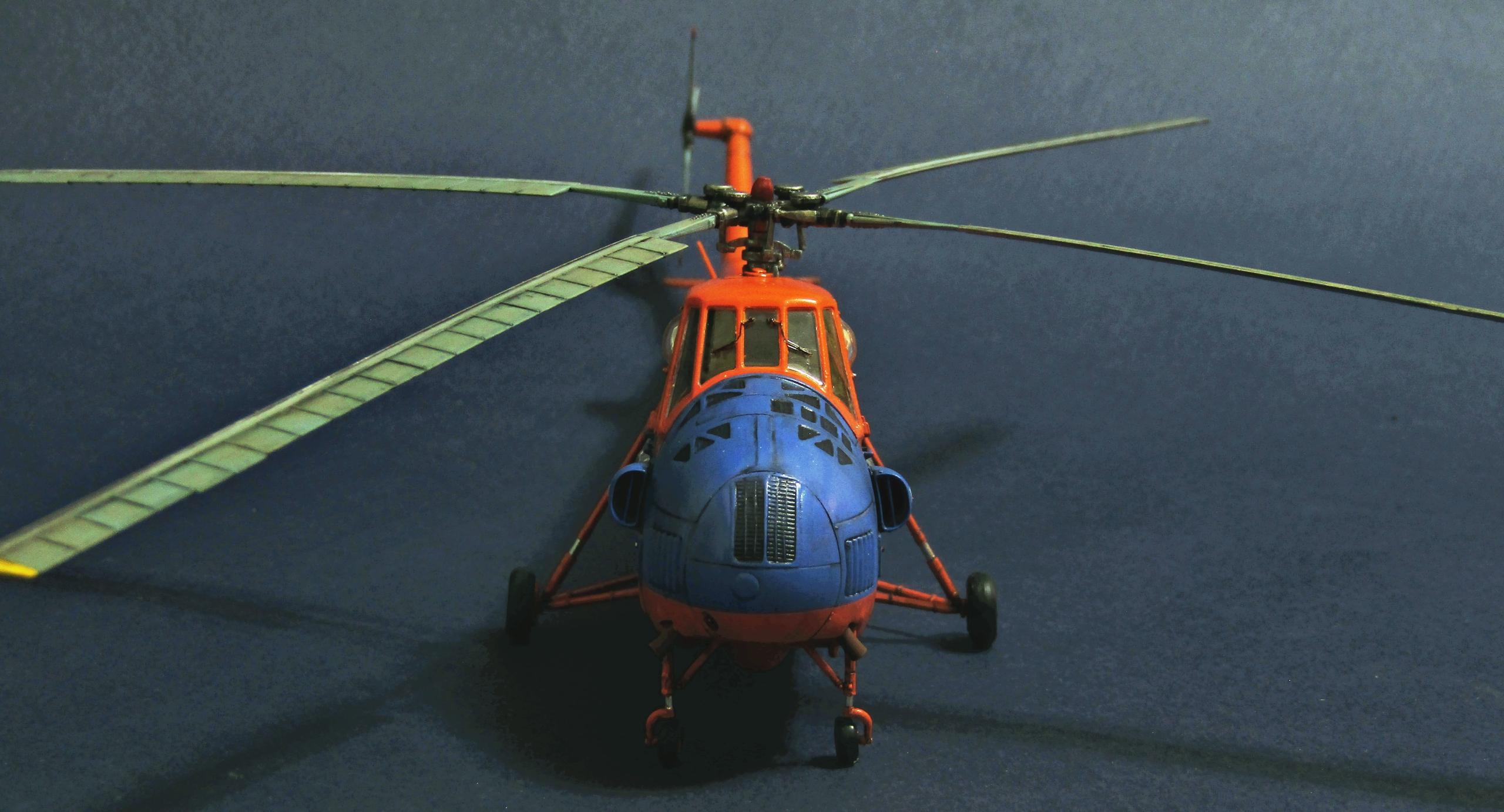 Хорошо собран.И покрашен.Такие машины приходили уже последние с ремзаводов.Андрей Виноградов правильно подсказал что можно подножки и добавить.Конечно в процессе сборки можно было вылепить и обтекатель.На своем Ми-4 я так сделал.Лепил из максипола.Неплохо получилось.А для съемки снизу можно лопасти установить на штифты.И для хранения и для транспортировки неплохо.Либо втулку НВ выполнить съемной.модель понравилась .Молодцом.