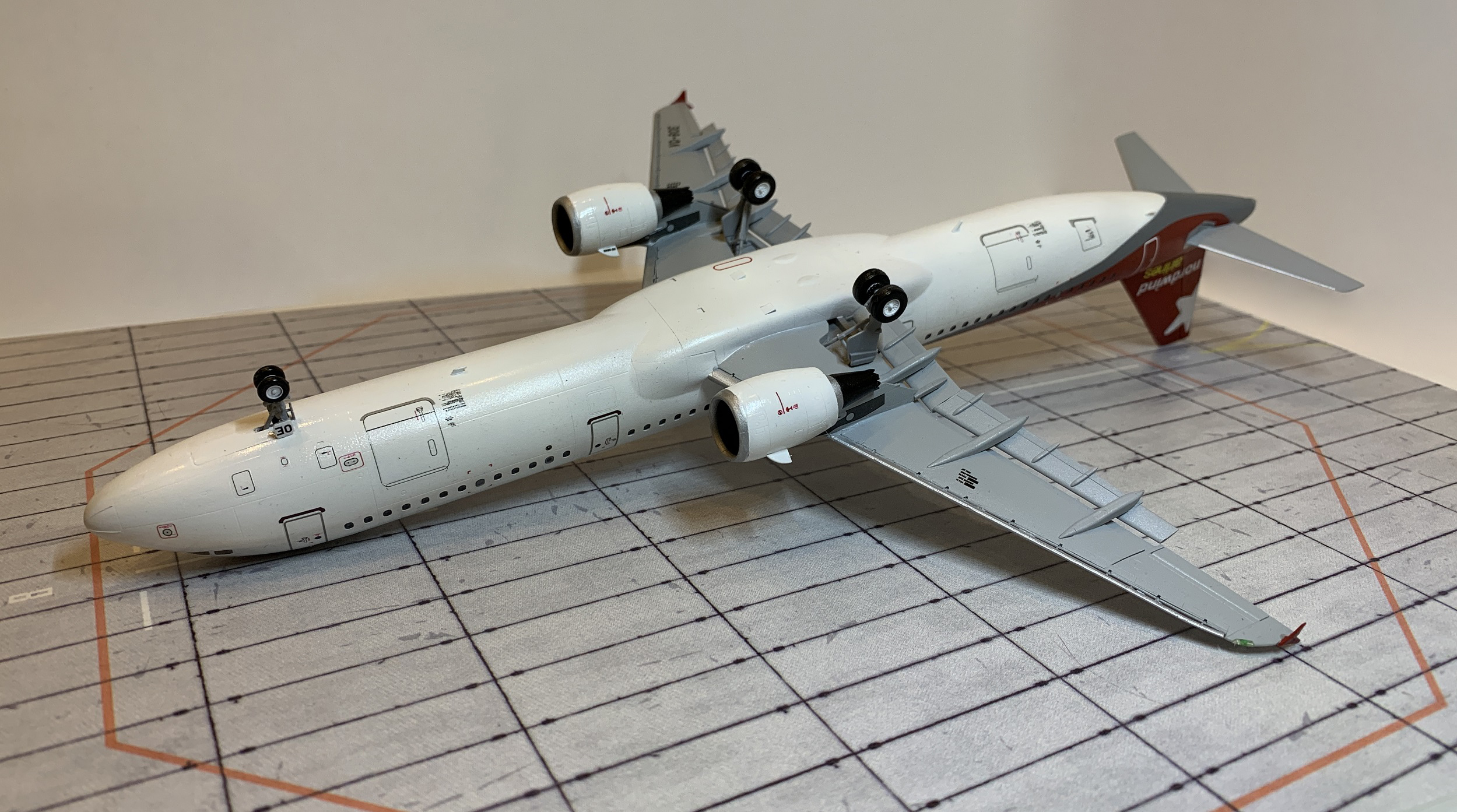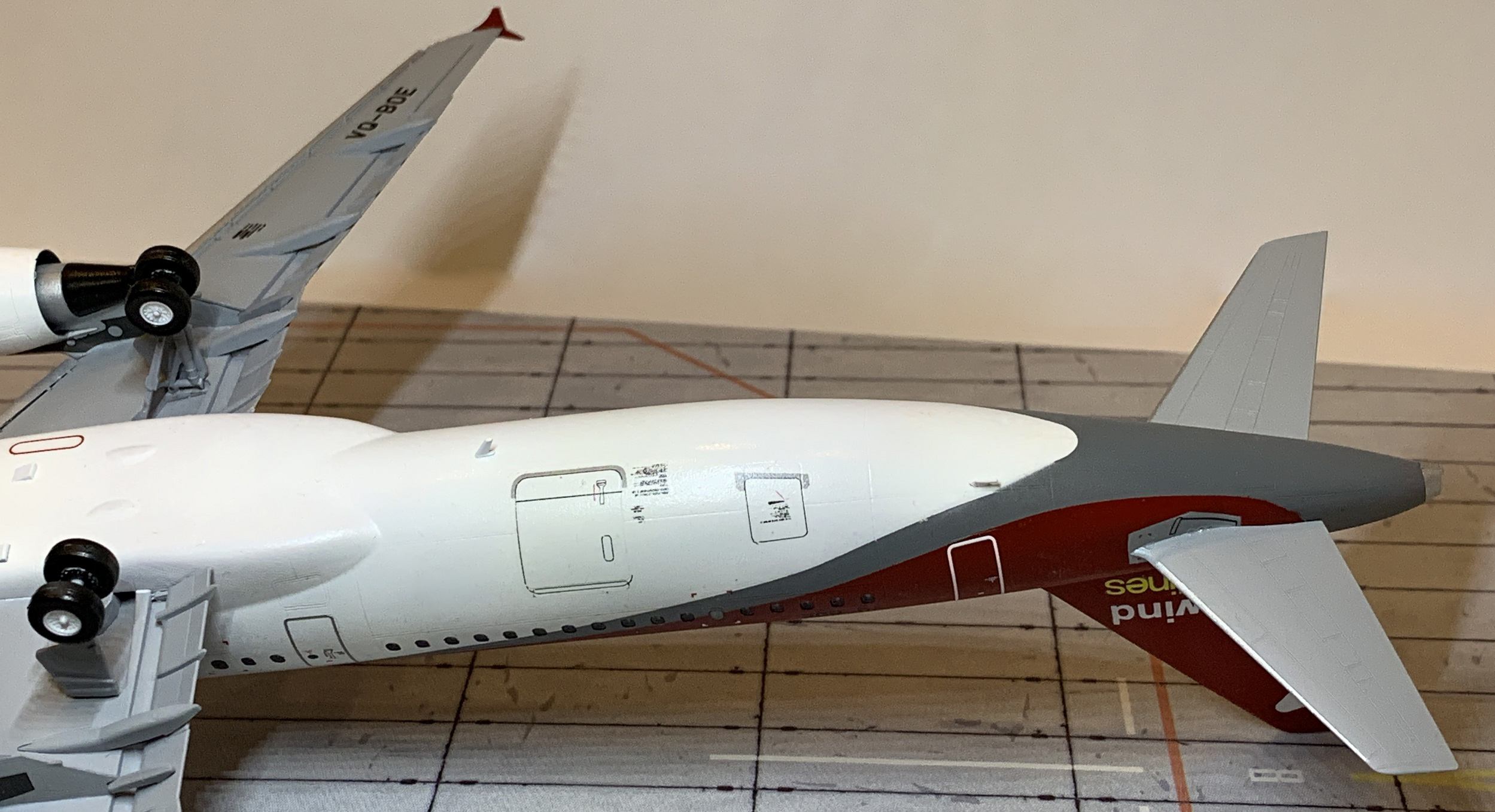 И шагрень сумасшедшая, и в бордовый цвет не попал (очень тёмный, как и серый), и регистрации на верхней поверхности крыла нет, и глянца не хватает на фюзеляже, хотя на колёсах его с избытком. Выходной контур движков лучше окрашивать пигментом "жжёный металл", а не глухим чёрно-коричневым.