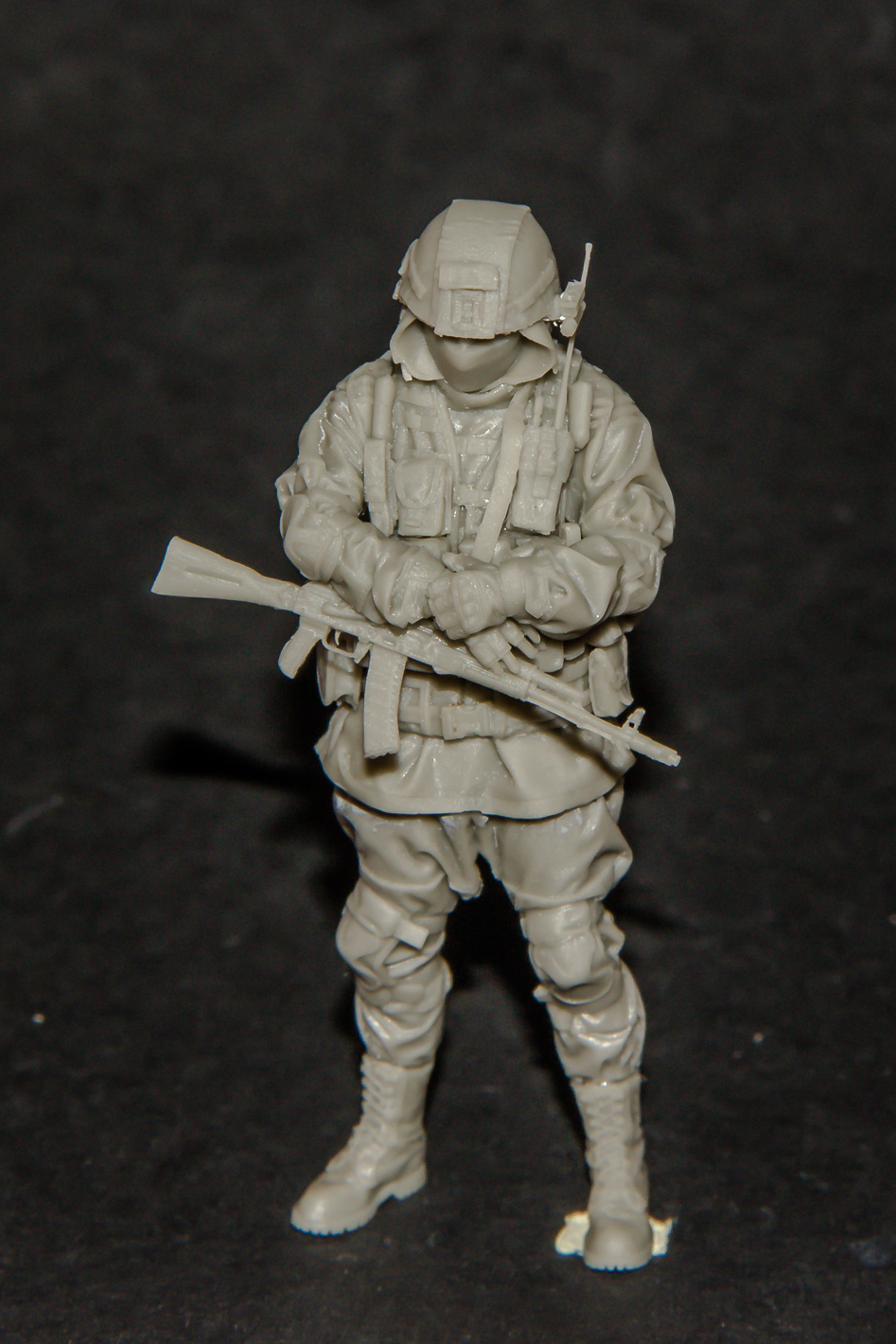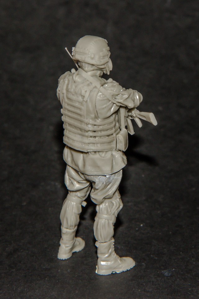 На литнике с АК-74М присутствует легкий облой. Автомат можно вставить между руками и подсумками уже после сборки и окраски фигурки. При этом часть оружейного ремня от левого плеча до цевья получилась достаточно тонкой и ажурной. К сожалению производитель пропустил часть ремня, идущую от правой подмышки к прикладу автомата и моделисту будет необходимо изготовить её самостоятельно.