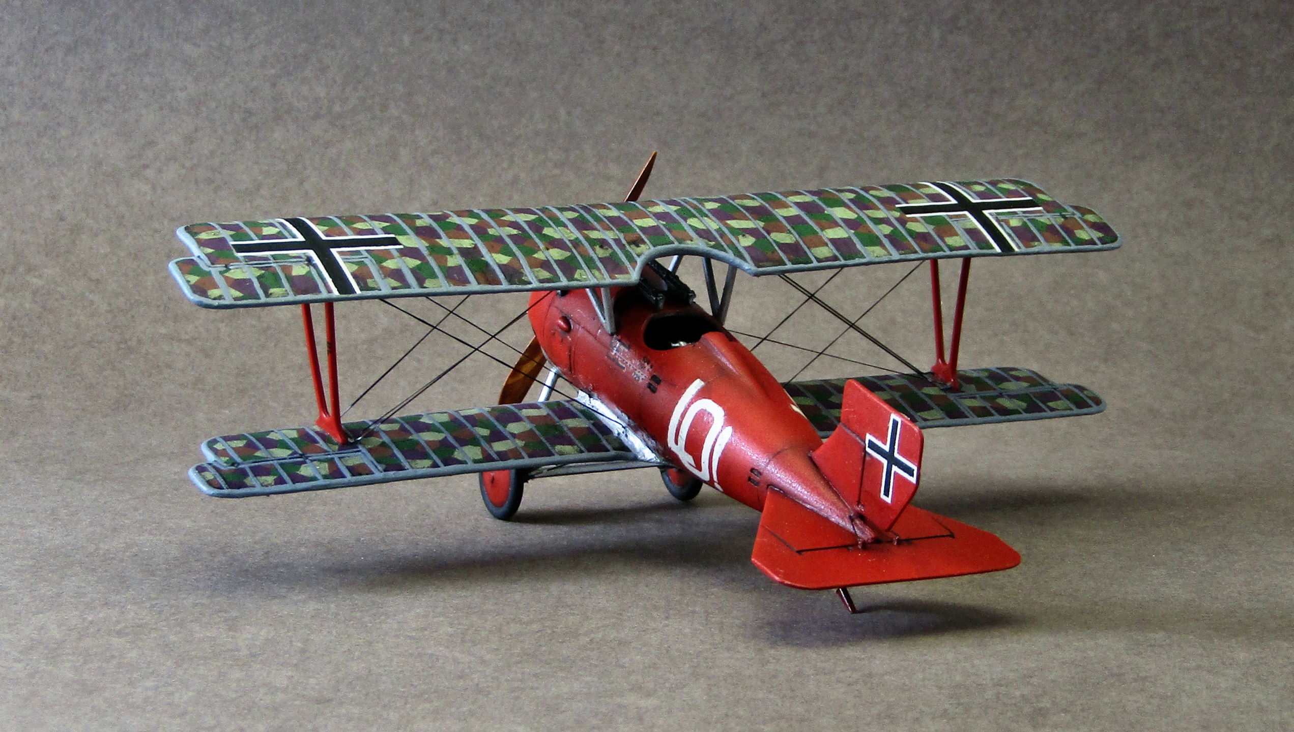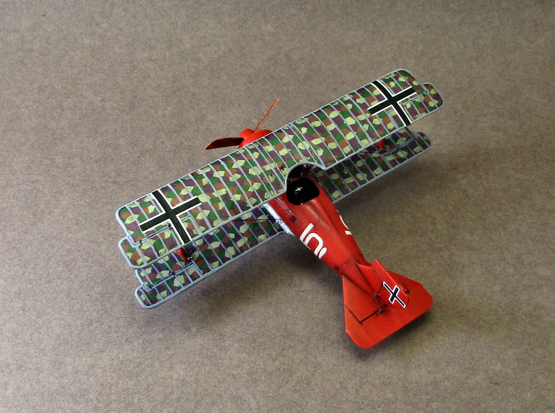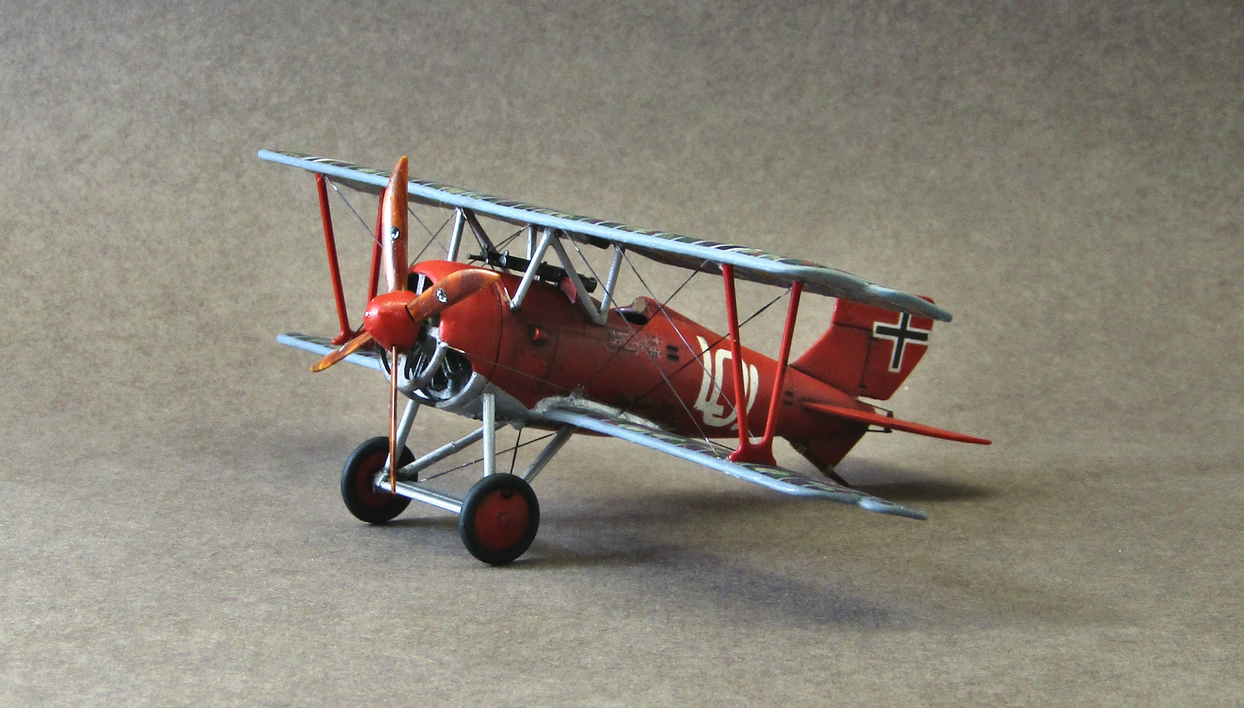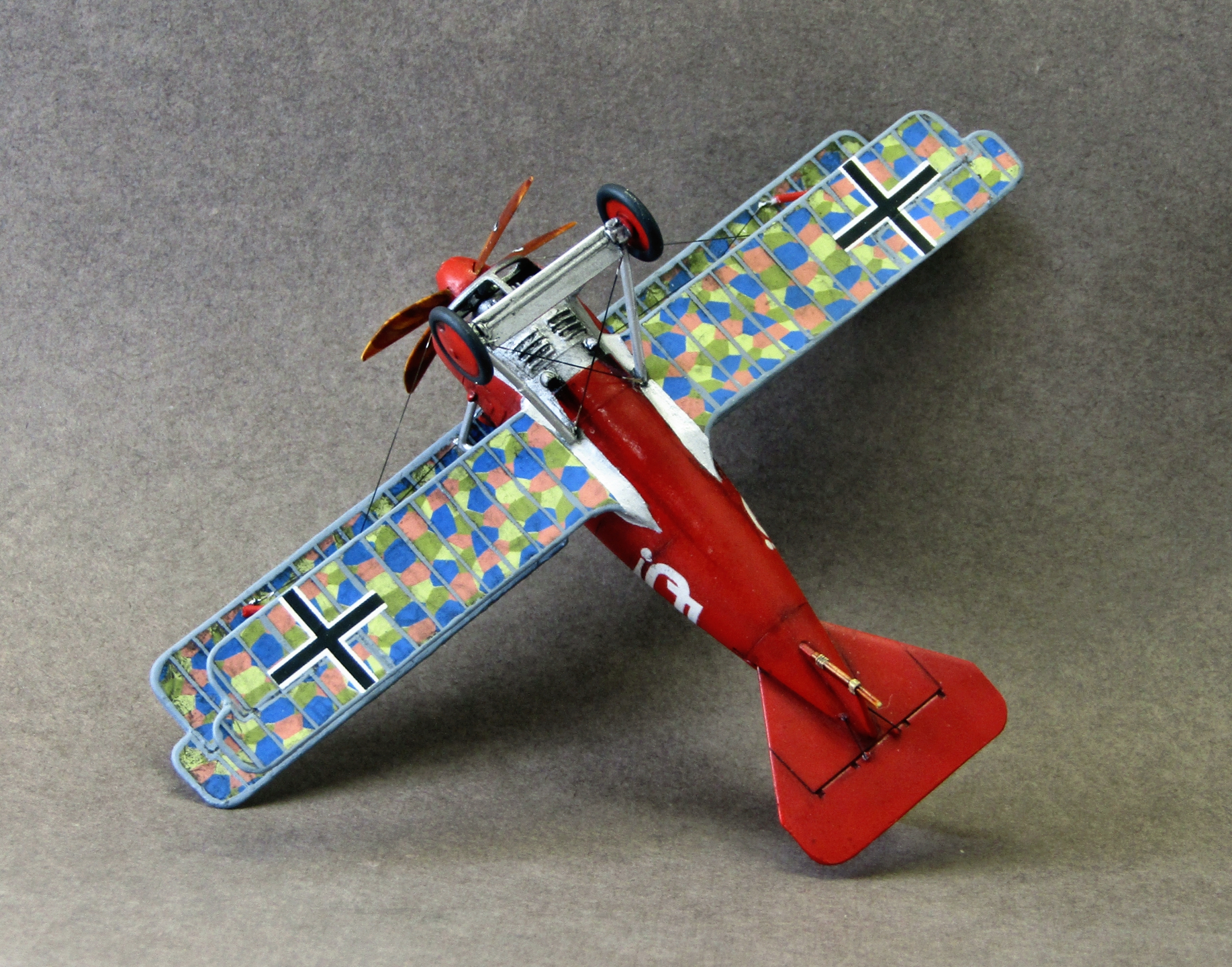 Приветствую коллеги! Представляю Вашему вниманию свою первую работу над бипланом времён Первой мировой войны. Набор неожиданно меня очень порадовал своей детализацией (при цене в 250 р.). Собирал с небольшими доработками: добавлены ремни на сидение лётчика и расчалки из эластомерной нити. Грунтовал серой Ганзой 1500, красил красным водным акрилом от АКАН. Декали в наборе, мягко говоря, не очень - на поверхность не привариваются, укреплял эмалевым лаком от Ревелл. Поверх лозенга нанёс полоски под шнуровкой (вроде так называется, а может кто поправит). Фактуру древесины имитировал темперой, сверху покрыл лаком для дерева Dulux. В процессе покраски смывал чёрной Тамией. Финишное покрытие - полуглянцевый лак от Тамии. Вроде всё, что мог рассказать Вам по стройке данной букашки описал, приятного просмотра коллеги...