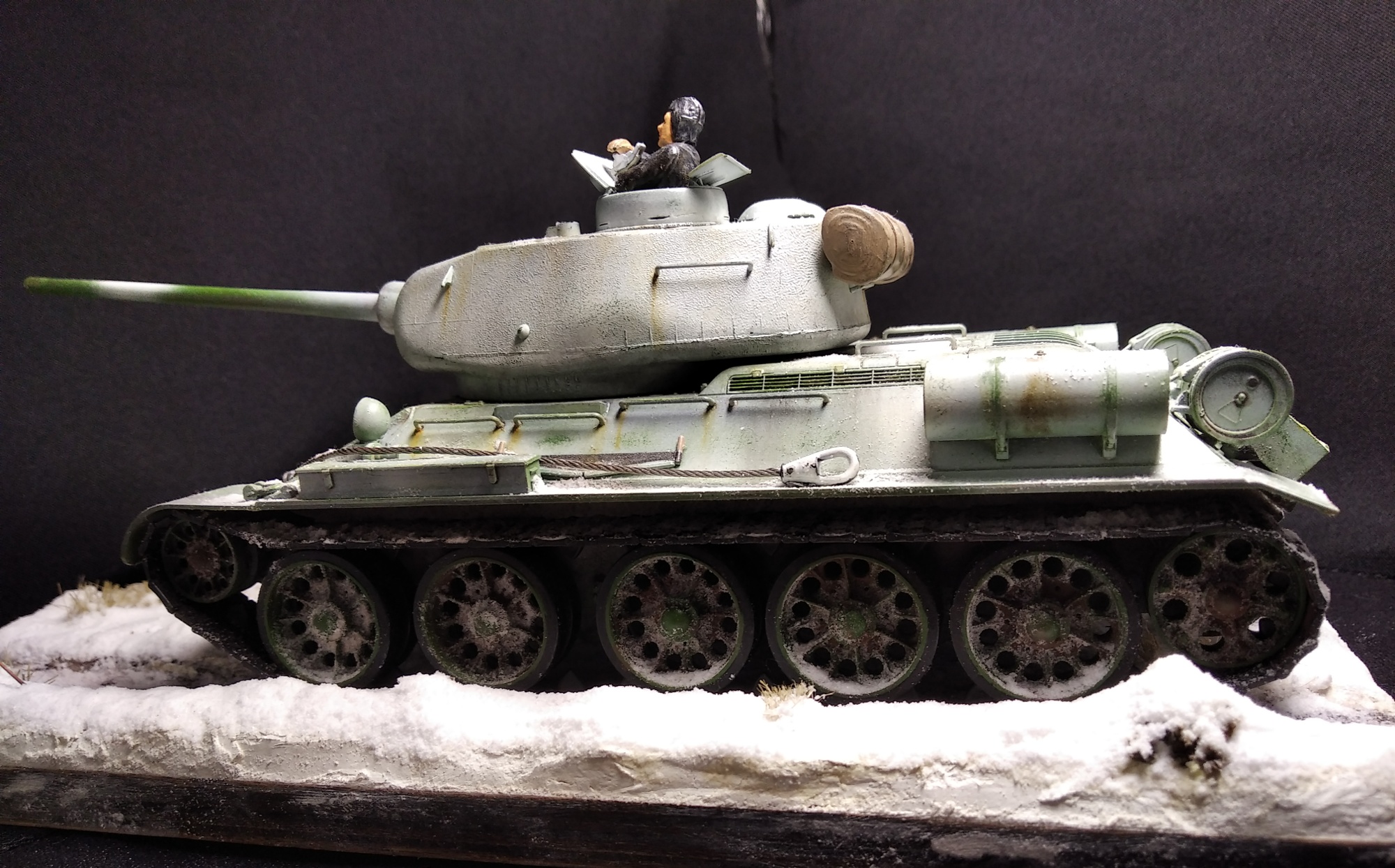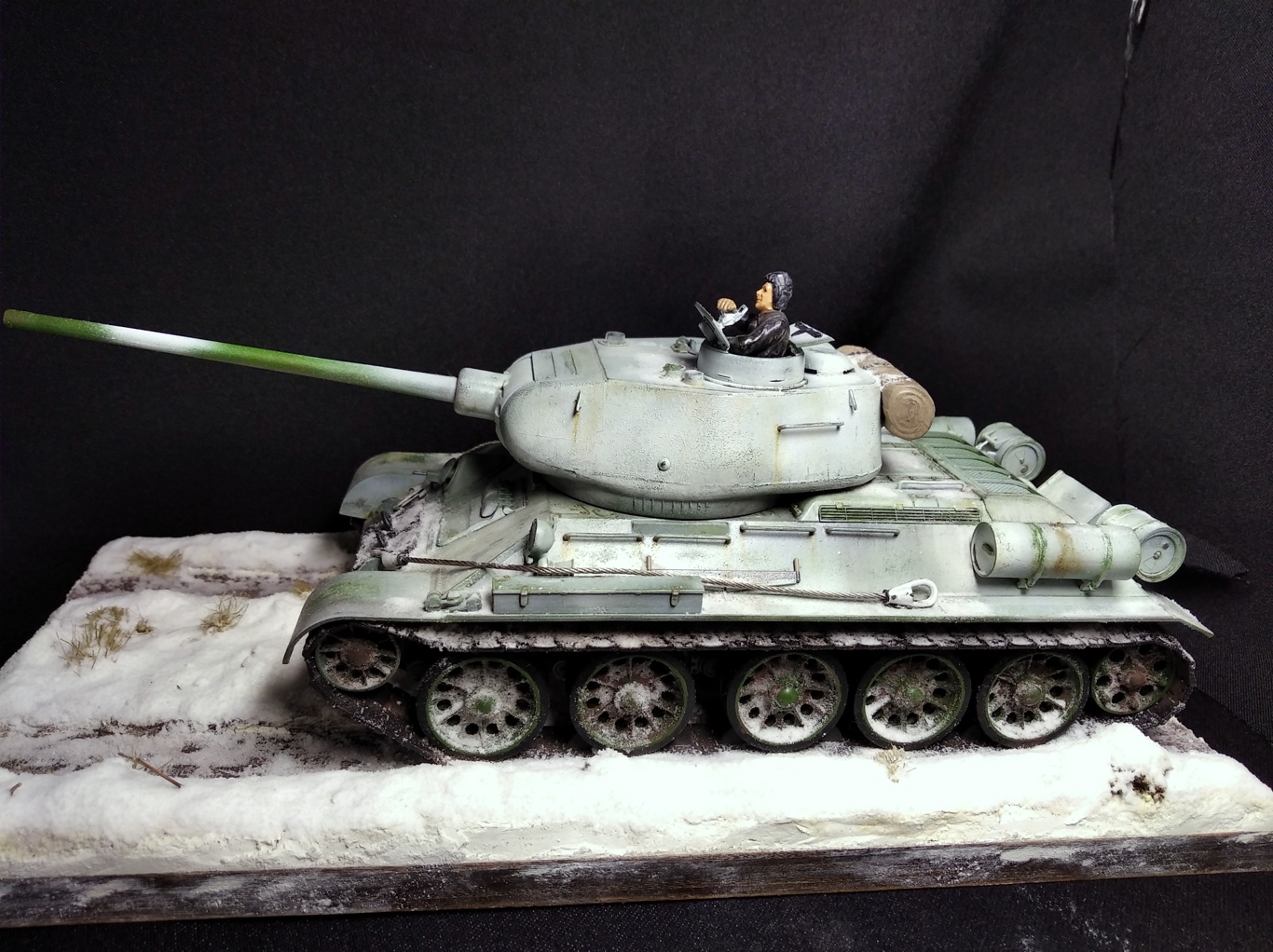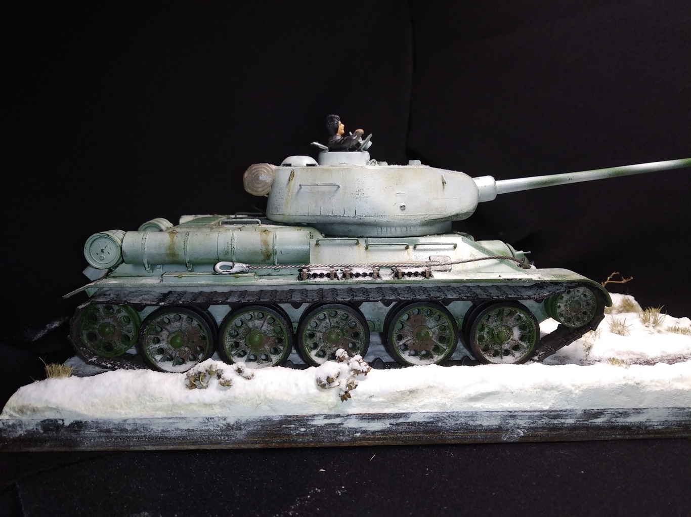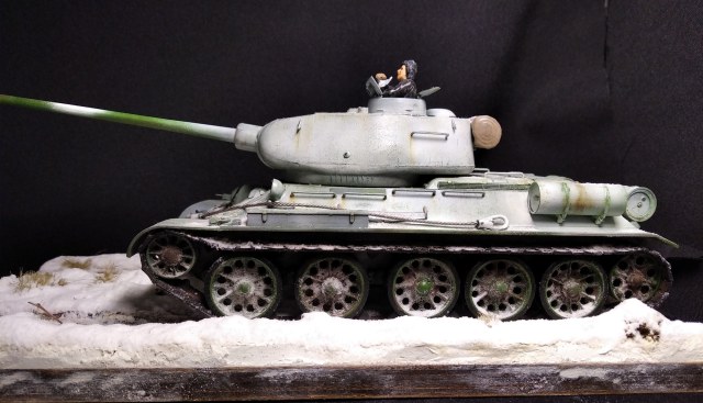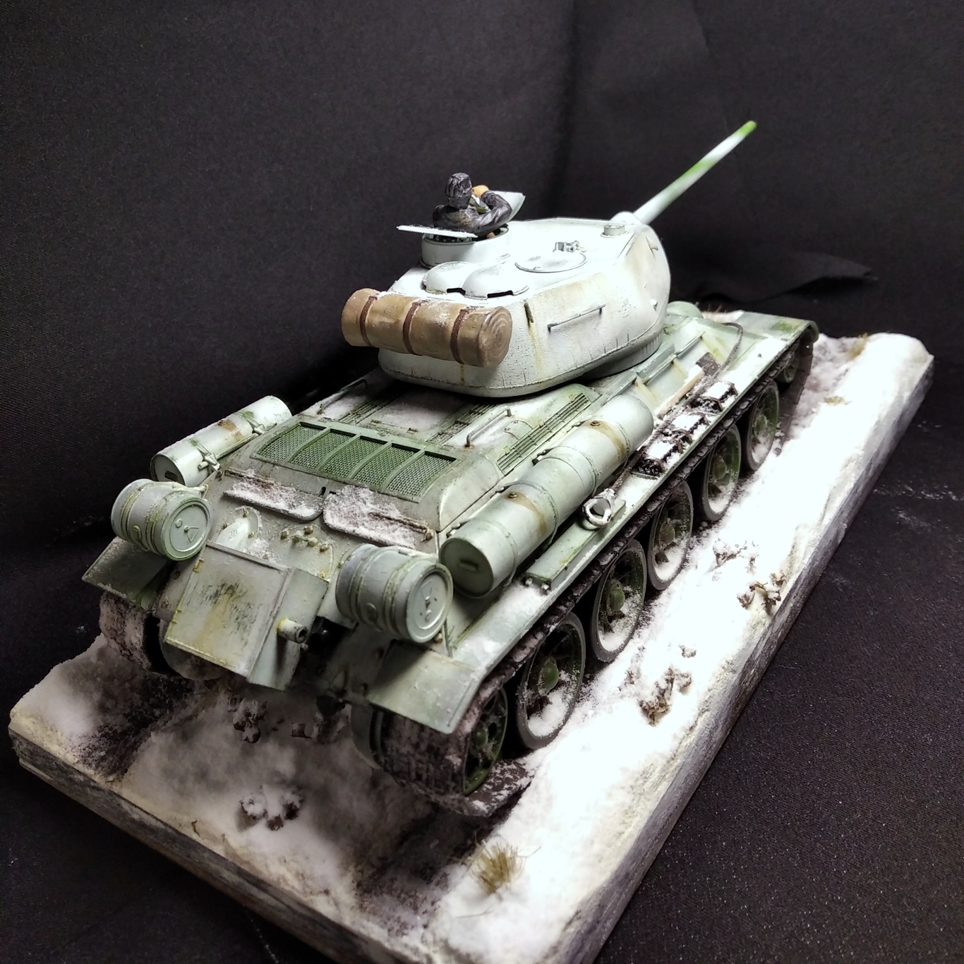 Всем привет! Свою модель я сделал в подарок. Хотелось бы узнать мнение публики на счёт того как у меня все получилось. Снимал на тёмном фоне, хотелось получить контраст. Надеюсь фото получились удачно. Красил аэрографом, краски звезда и тамия. Визеринг делал маслом от 52 батальона. Приятного просмотра.