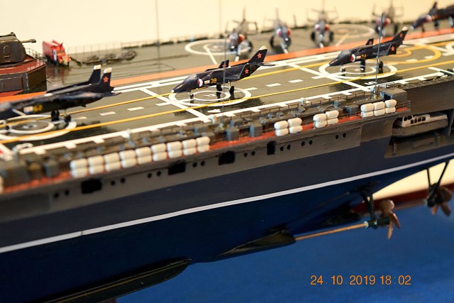 Модель традиционно выполнена из ПВХ . Окраска корпуса, палубы, авиации производилась полиамидными эмалями. Разметка полетной палубы, КВЛ выполнена из самоклеющейся пленки. Из готовых изделий использовано ФТД: леера масштаба 1:250 -300 с шагом 4,5 мм.