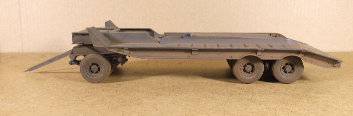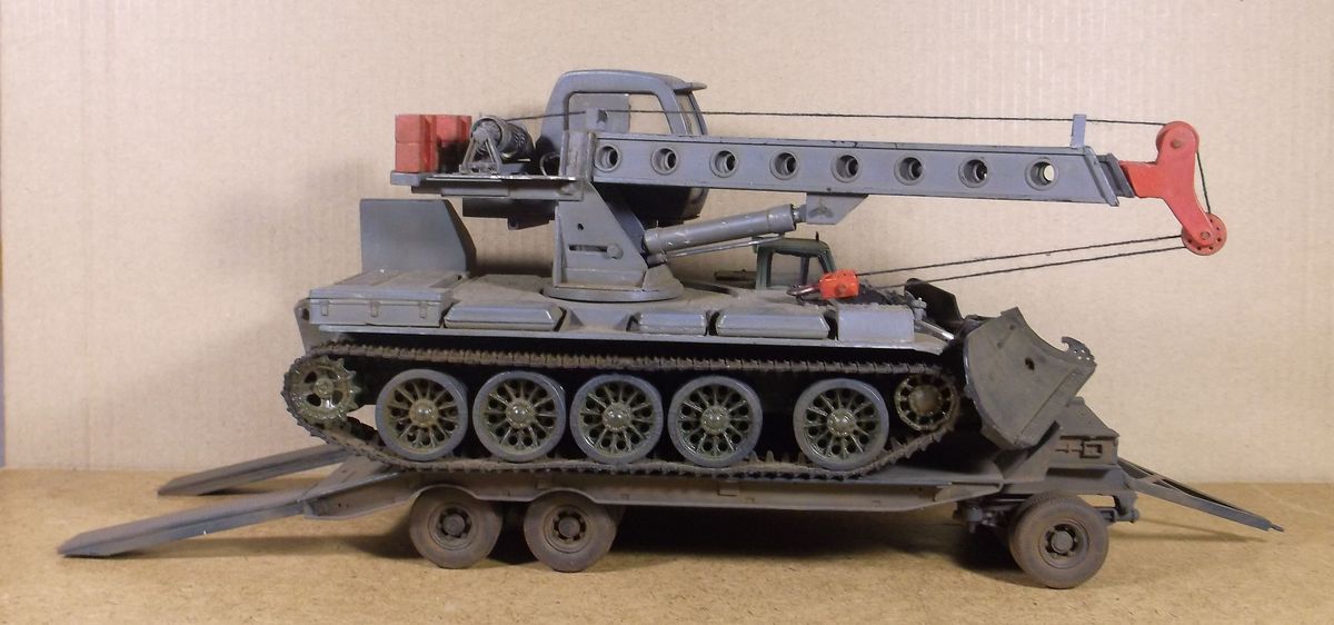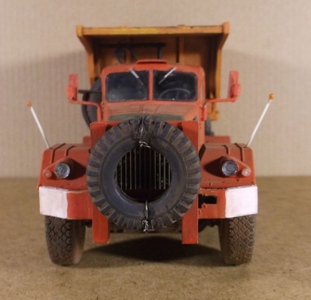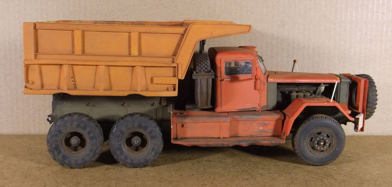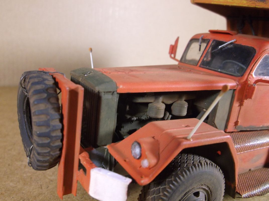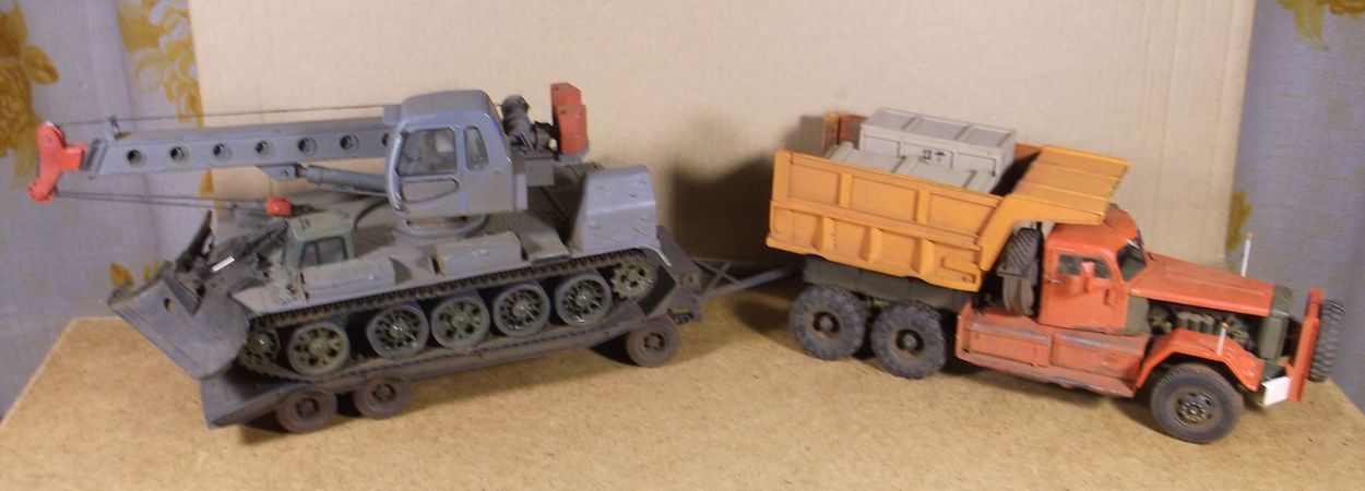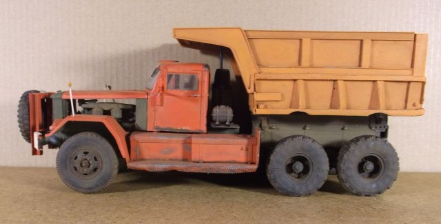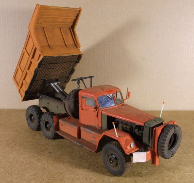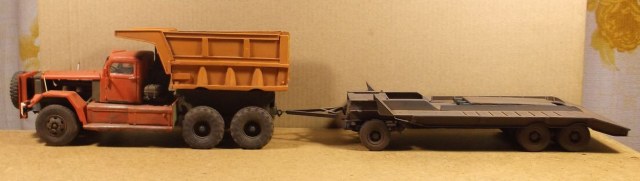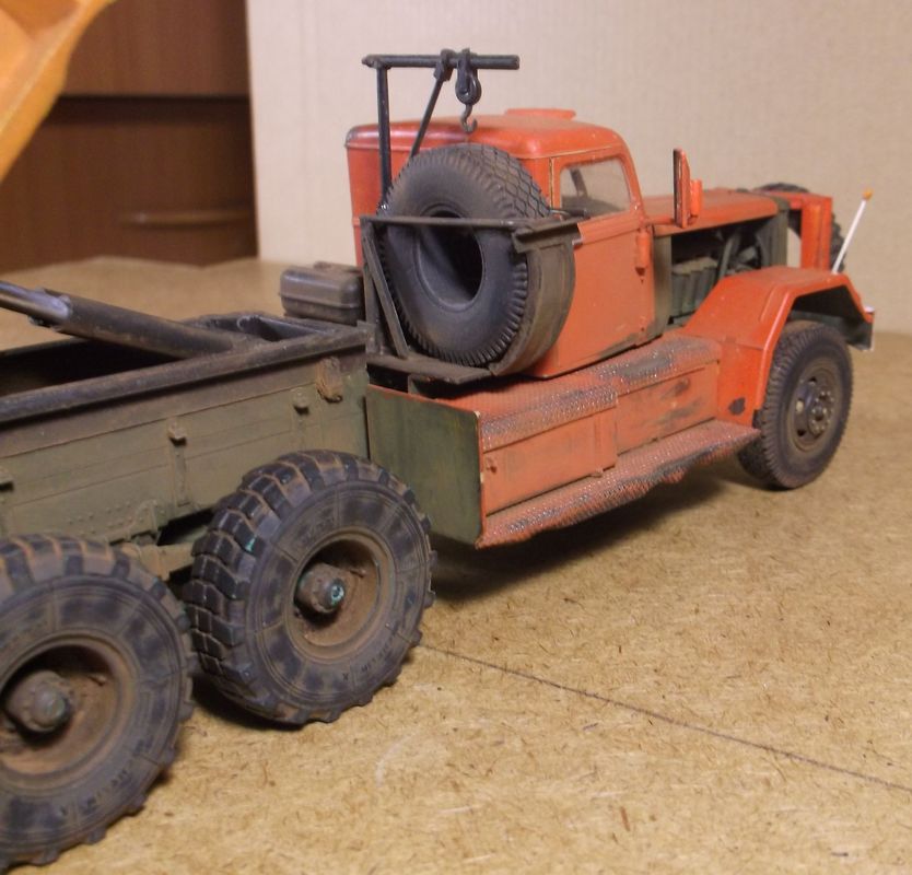 Собирать изкоробку было скучно и я решил поизгаляться немного над бедным старичком. Отныне он стал участником экспедиции "Ермак". Не секрет, что после войны на Дальнем Востоке и в Восточной Сибири оставалась лендлизовская техника. Вот и этого Даймонда местная администрация спрятала от сдачи союзникам в металлолом. И он благополучно докряхтел до членства в экспедиции. Не всё железо выдержало такой срок. Механики заменили передние крылья (ЗиЛ-131 ICM), вместо балластного кузова и мёртвой лебёдки воткнули самосвальный кузов от военного америкоса (REAL MODEL). Спереди приладили швелера с покрышкой для смягчения толчков и нарекли сие творение "Тяни-толкач". Тяга то у него паровозная! Резину спереди поставили кразовскую (CASTOMFACTORY), а заднюю от амеровского Бигфута (?). Прицеп-трал привели в божеский вид, и сделали новые въездные рампы.
