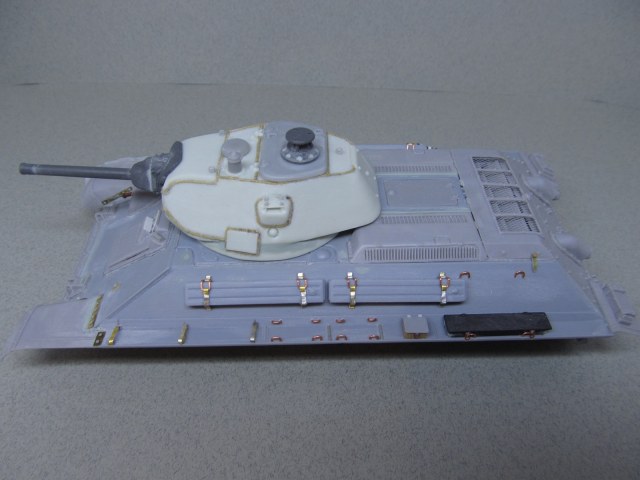 работал я с этим набором довольно долго. Фототравления, болтов для расклепки и прочего афтемаркета под рукой не было, зато было стойкое желание сделать из модели что-нибудь более-менее смотрибельное, была шпатлевка, доширак-пластик, пивная жесть, проволока и смекалка. И закипела работа! Стыкуемость деталей- нулевая- без шпатлевки, цангового ножа, напильников, наждачной бумаги и крепких выражений никак не обойтись!)) Кроме того часть основных деталей в наборе представлены явно от других модификаций "тридцатьчетверок", соответственно пришлось их нещадно резать-шпатлевать-подгонять, а то и изготавливать сызнова. Части необходимых деталей, таких как, например, задний фонарь, в наборе вообще нет, пришлось их делать самостоятельно. В общем, могу сказать смело- это был грандиозный перепил!))) Опишу все свои доработки по порядку: