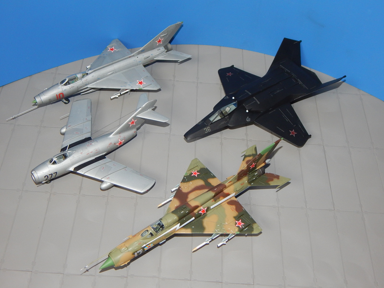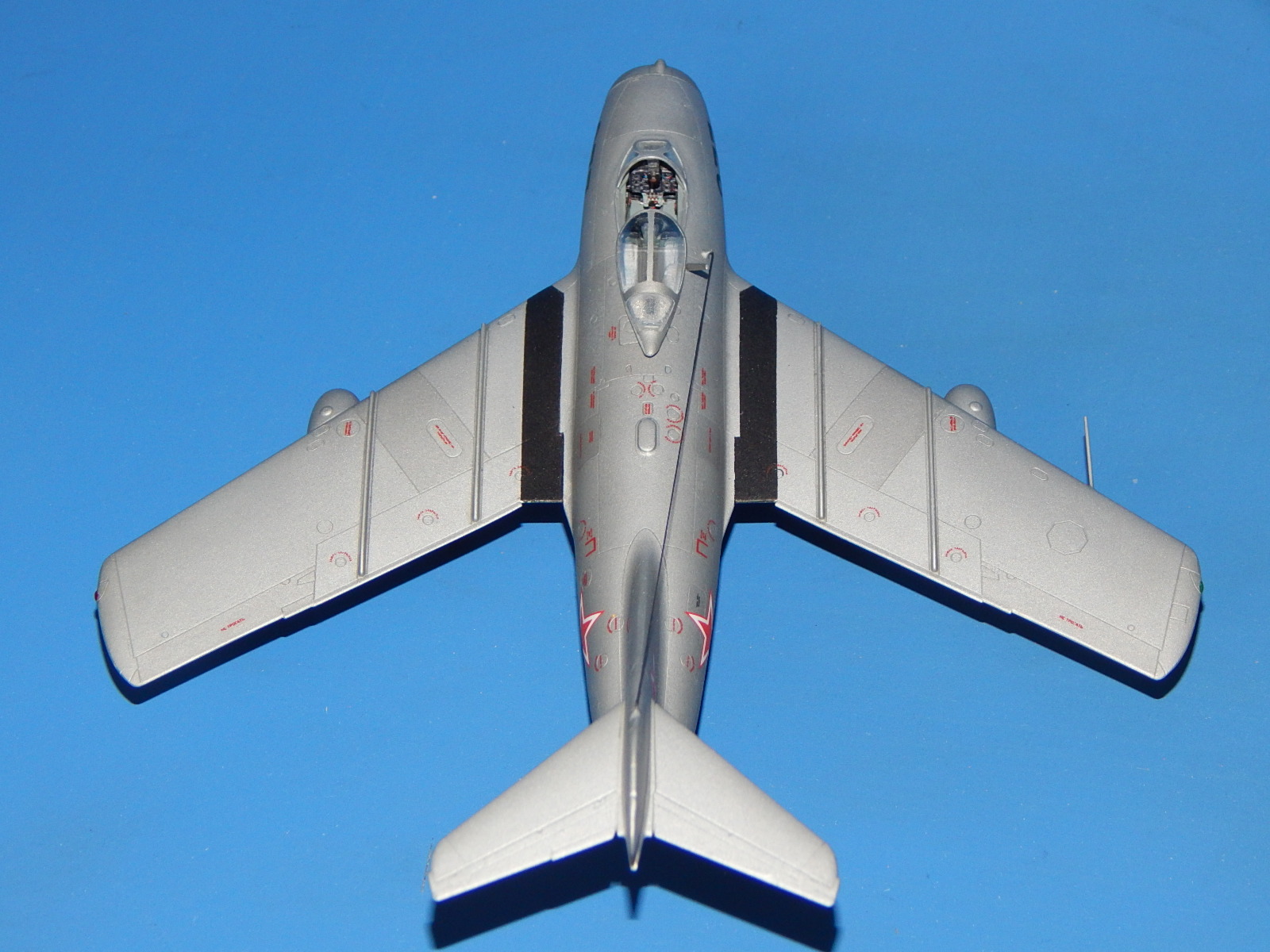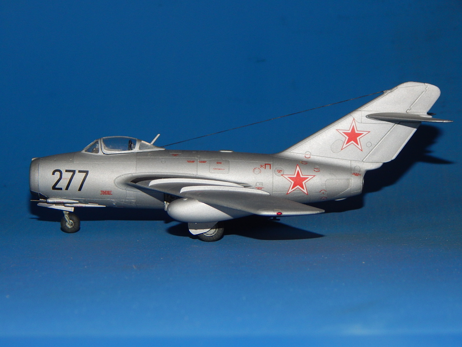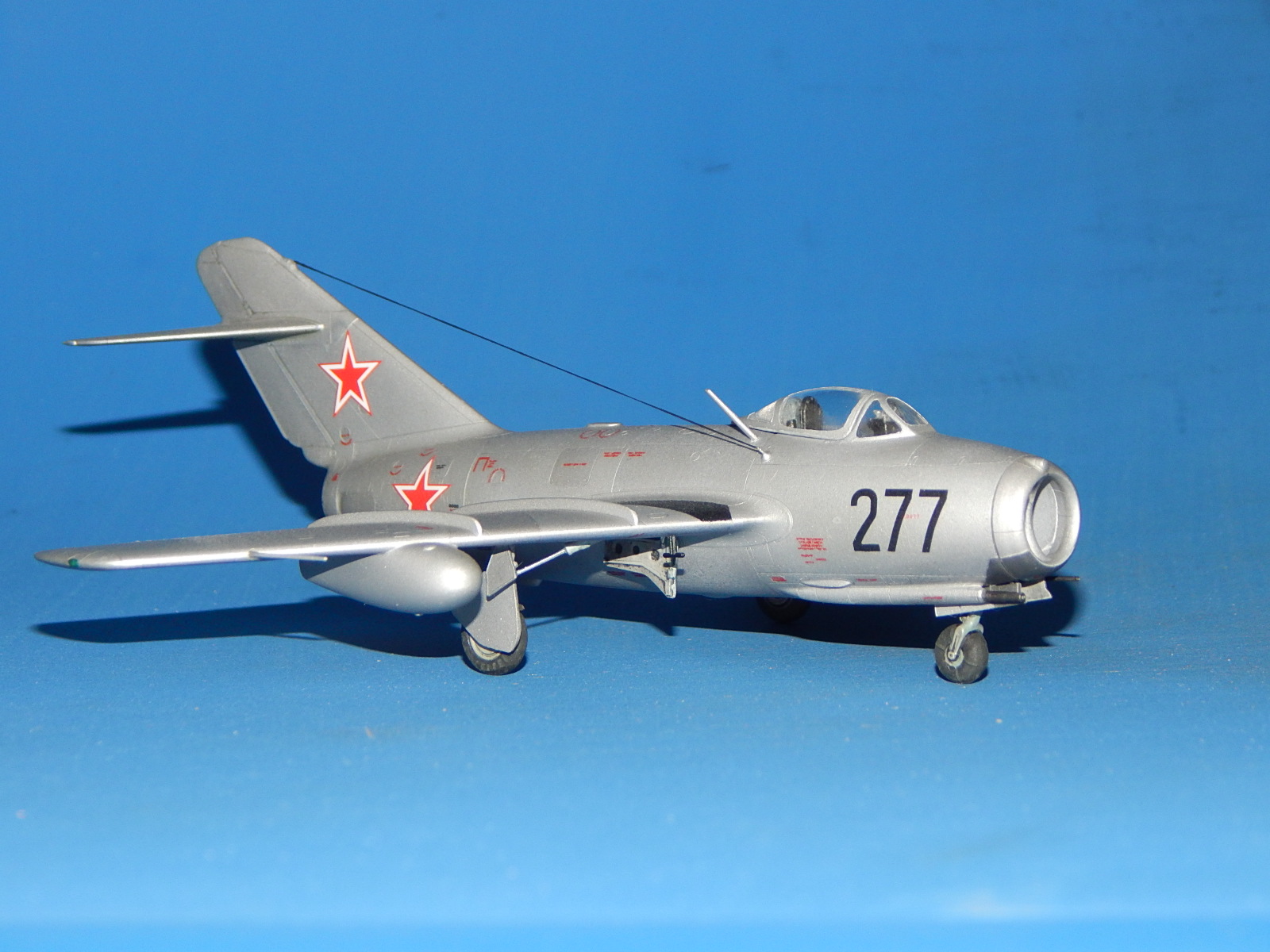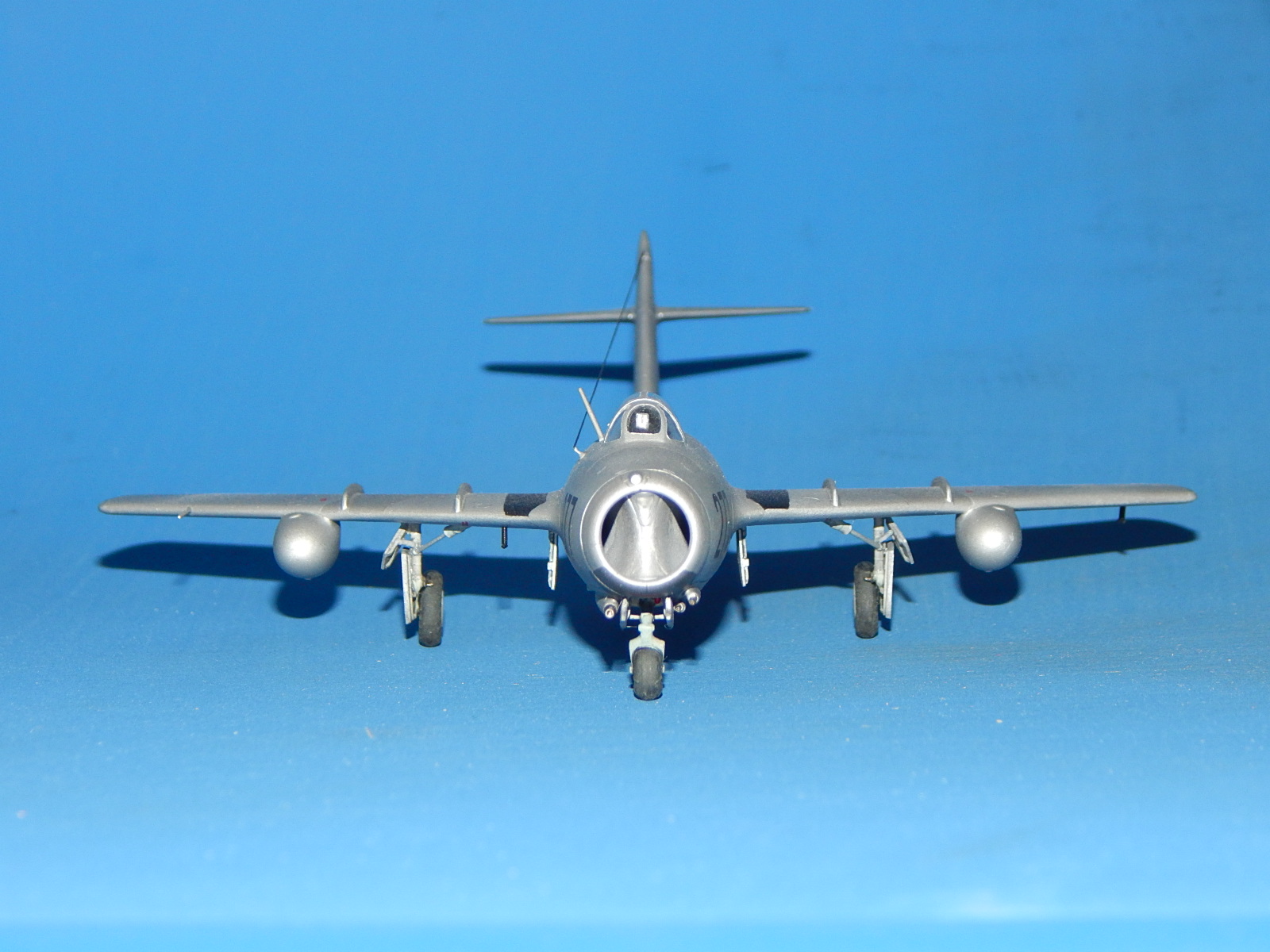 Здравствуйте. Моя очередная модель. Одна из четырёх (собирал одновременно МиГ-15, МиГ-21Ф-13, МиГ-21СМ и МиГ-37). Модель изкоробочной сборки с небольшими допами Master (ПВД, стволы пушек). Антенна из спандекса. Набор в целом понравился. Серьёзных проблем сборка не вызвала. Собирал долго: на колене, на диване, на полу и за столом. Шпаклевки почти не потратил. Красил аэрографом эмалями Tamiya. Немного металликов от Акана. Спасибо всем, кто выкладывал здесь фото моделей этой машины. Помогли с «листовым» и «лючковым» эффектами - различные оттенки Tamiya - алюминий (вроде, получились). Выделял расшивку карандашом, «пачкал» - TamiyaPanelline. Фонарь футурил купанием. С масками из комплекта проблем было немного (плохо видны границы переплёта). Декали родные (техничка - МиГ-15 от Звезды) приваривал Microscale SOL и SET. Финишный лак - Humbrolв стекле. Долго я его искал. С уважением, Александр.