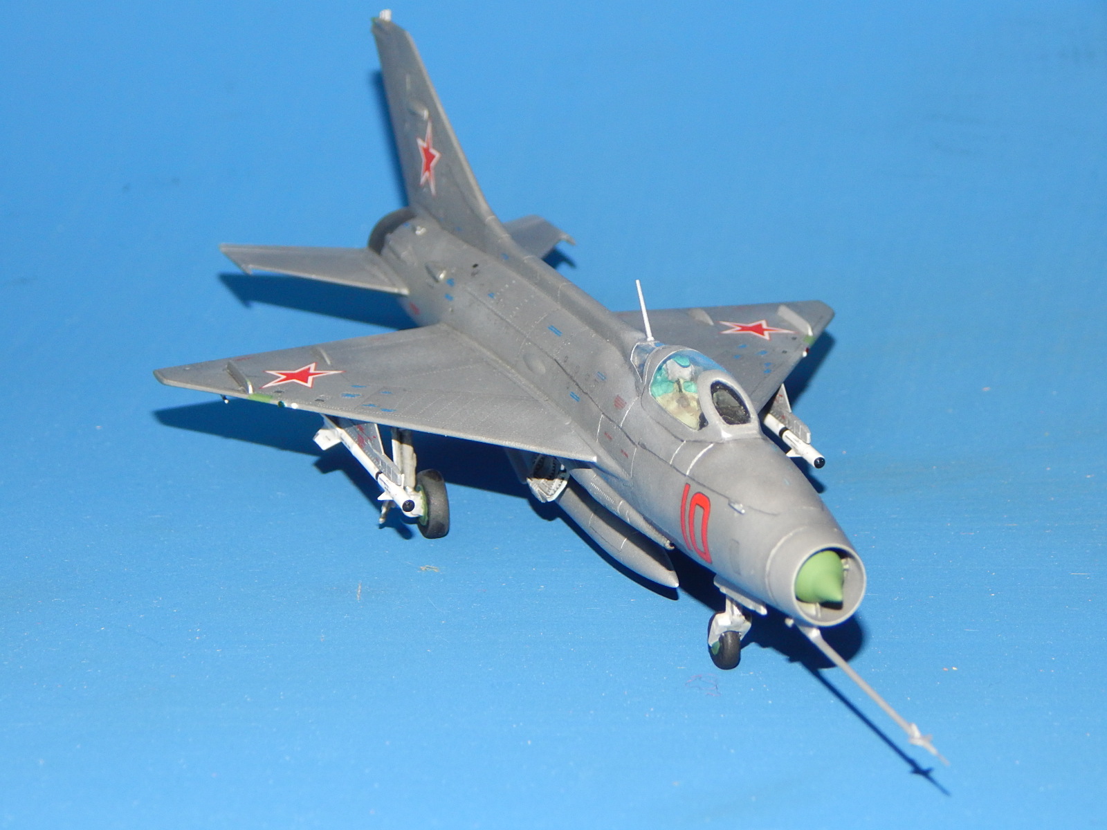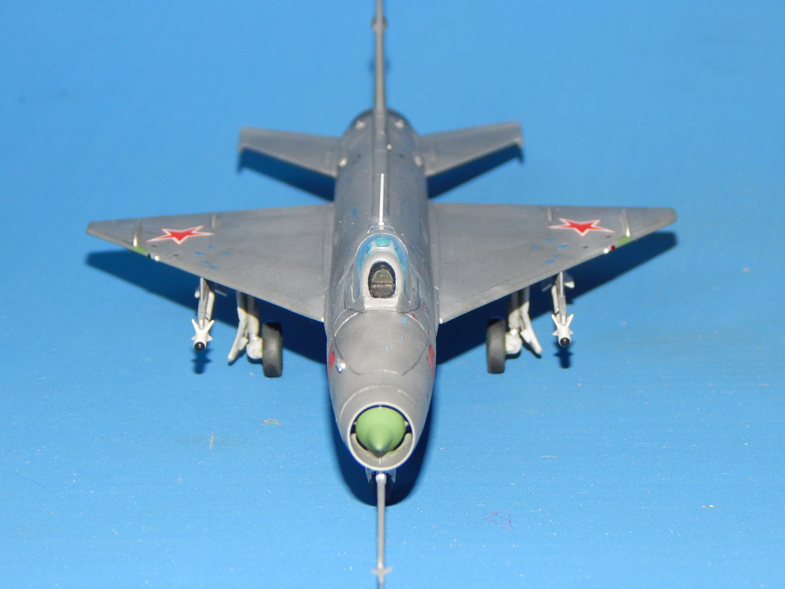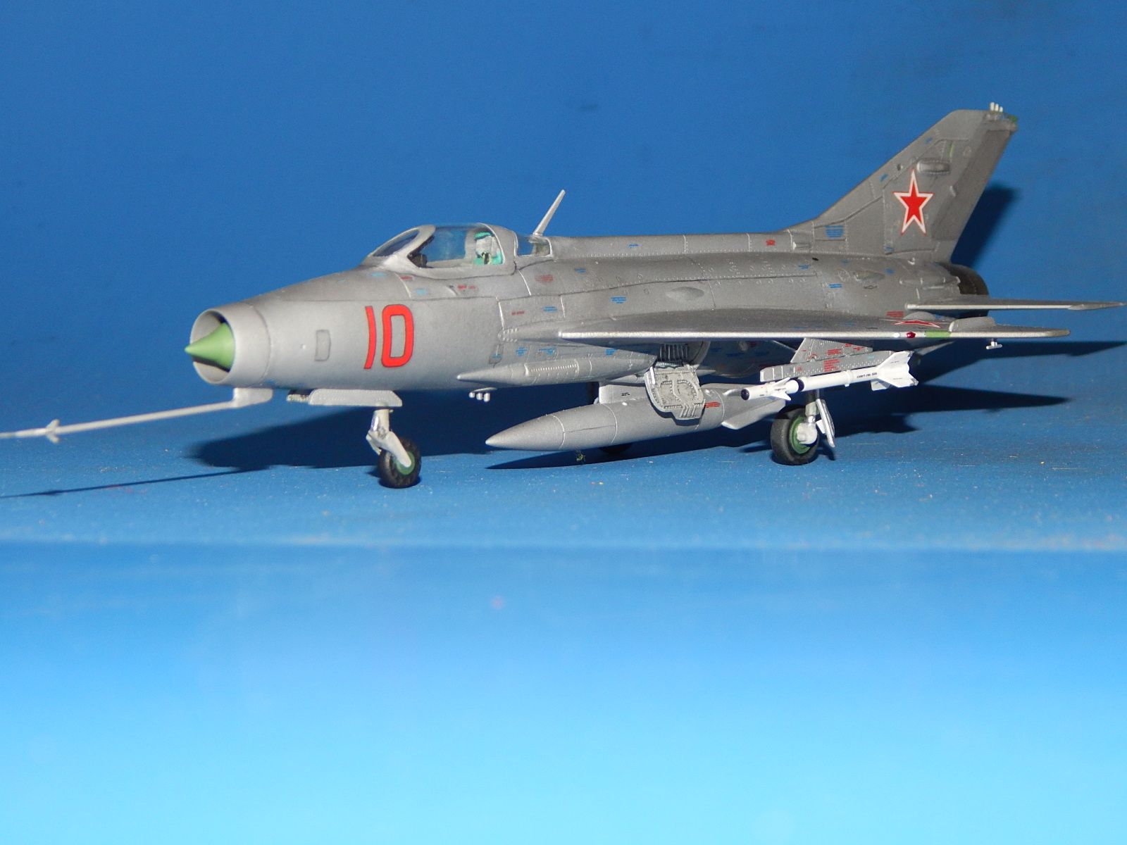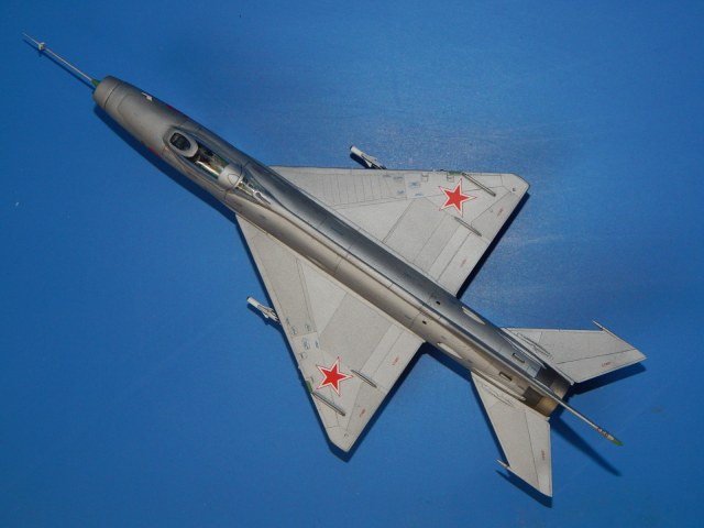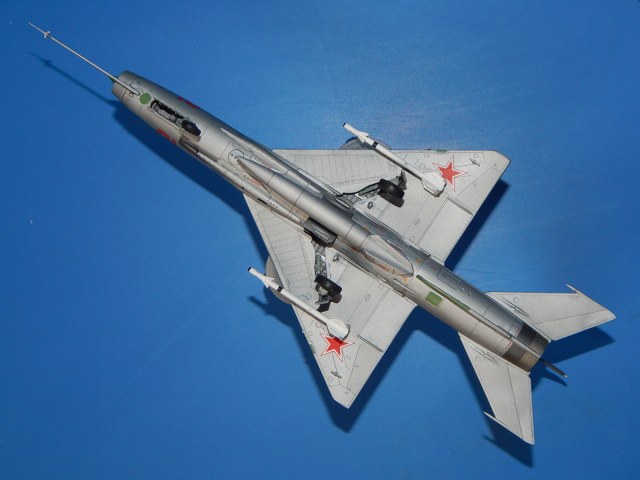 Здравствуйте. Моя очередная модель. Одна из четырёх (собирал одновременно МиГ-15, МиГ-21Ф-13, МиГ-21СМ и МиГ-37). Модель изкоробочной сборки с небольшими допами Master (ПВД, собирать антенну трудно и нервно. Интересно, а как правильно собирать?), Eduard (ракеты, тоже. Как правильно клеить крылья и рули?) и QuickBoost (носовой конус, не сразу его поставил, думал, обойтись «малой кровью» - родным. Жадность! Как и с креслом от Pavla). ПТБ - от МиГ-21 Минской фабрики пластмассовых игрушек, несколько доработанный (другого не нашел). Набор в целом понравился. Серьёзных проблем сборка не вызвала. Собирал долго: на колене, на диване, на полу и за столом. Шпаклевки потратил немного. Фонарь футурил купанием, но что-то не до конца - остался чуть мутноват и с царапинами (не знаю, как так получилось). Садился с щелью (так и не выяснил, почему). С масками было немного проблем: скотч Tamiyaпо периметру + синий Microscale в центре. Красил аэрографом эмалями Tamiyaи Humbrol. Немного металликов и радиопрозрачные панели - Акан. Спасибо всем, кто выкладывал здесь фото моделей этой машины. Помогли с «листовым» и «лючковым» эффектами - различные оттенки Tamiya- алюминий (вроде, получились). Обозначил антенны и БАНО на плоскостях. Декали родные (техничка от Бегемота) приваривал Microscale SOL и SET. Выделял расшивку карандашом (в некоторых местах она кривовата), «пачкал» - TamiyaPanelline. Финишный лак - Humbrolв стекле. Долго я его искал. С уважением, Александр.