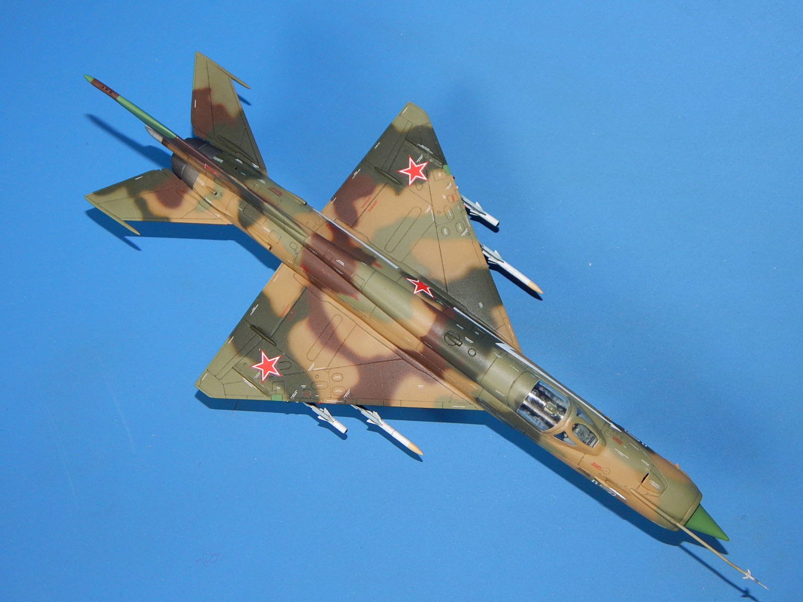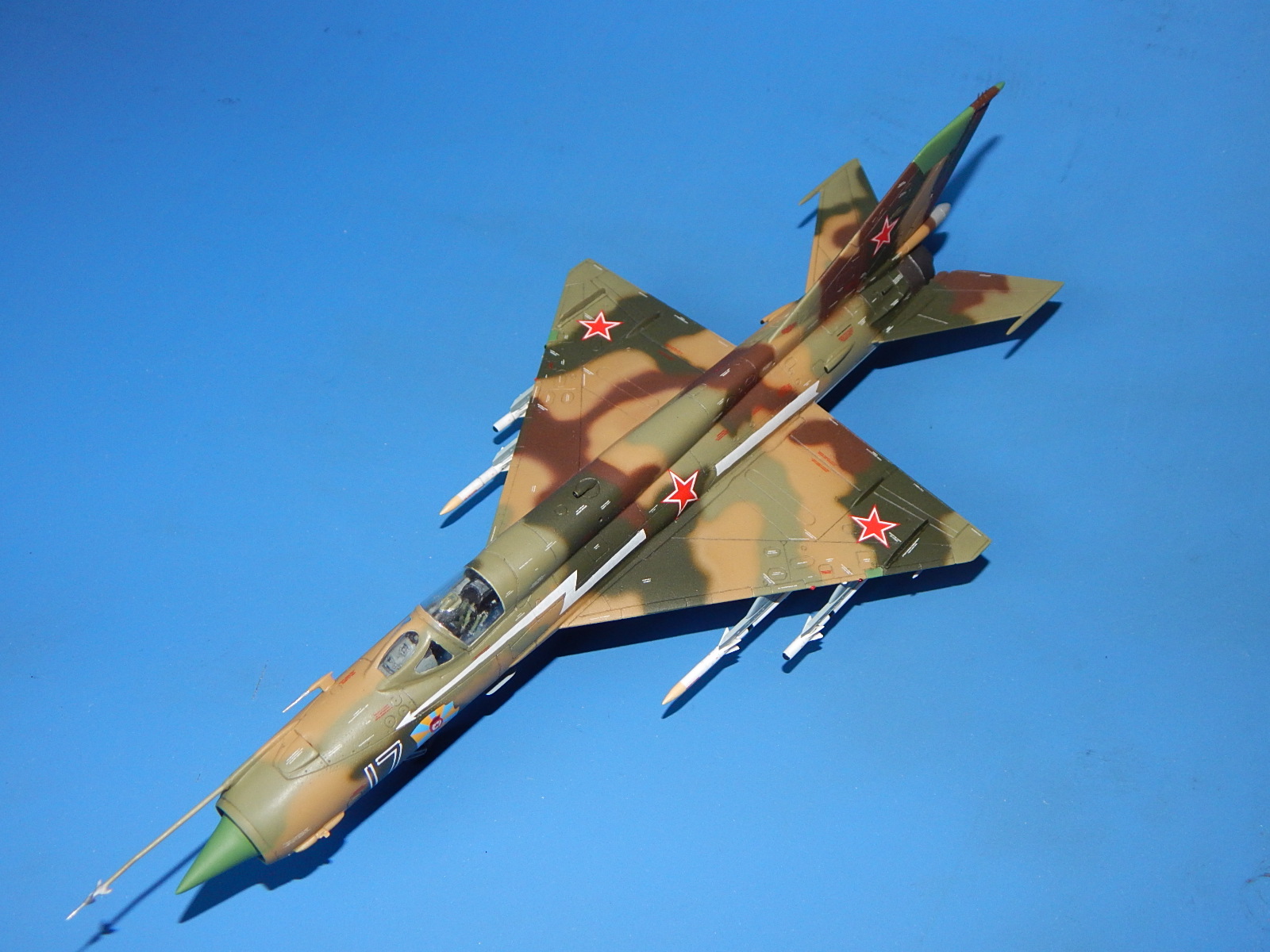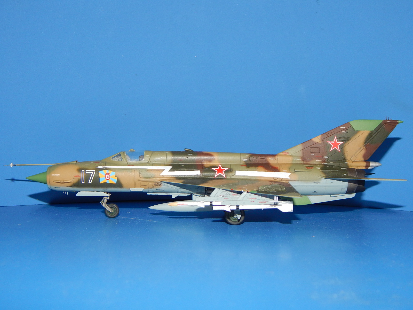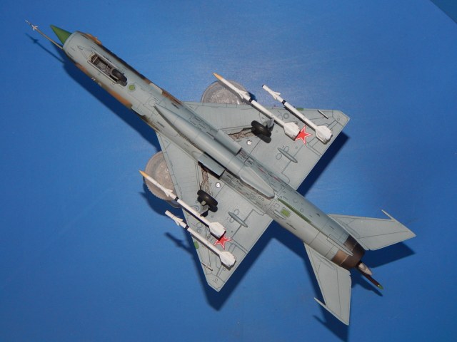 Здравствуйте. Моя очередная модель. Одна из четырёх (собирал одновременно МиГ-15, МиГ-21Ф-13, МиГ-21СМ и МиГ-37). Модель изкоробочной сборки с небольшими допами Master (ПВД, собирать антенну трудно и нервно. Интересно, а как правильно собирать?) и Eduard (ракеты, тоже. Как правильно клеить крылья и рули?). Антенны СРО - волосы из щётки. ПТБ - от МиГ-21 Минской фабрики пластмассовых игрушек, несколько доработанный. Набор несколько сложноват. Особенно, если закрыть тормозные щитки. Серьёзных проблем сборка не вызвала. Собирал долго: на колене, на диване, на полу и за столом. Шпаклевки потратил средне. Выполнил углубление и небольшие дополнения расшивки. Выделял расшивку карандашом (в некоторых местах она кривовата), «пачкал» - TamiyaPanelline. Фонарь футурил купанием, но что-то не до конца - остался чуть мутноват и с царапинами (не знаю, как так получилось). С масками было немного проблем: скотч Tamiyaпо периметру + синий Microscale в центре. Красил аэрографом эмалями Tamiya. Низ и пара цветов камуфляжа, радиопрозрачные панели, металлики - Акан. Схема камуфляжа - МиГ-21СМТ Eduard 1/48. Мой первый камуфляж, рисовал без масок. Попробовал осветлить финишным покрытием от Акана. Крайне неудачно. В результате - пара месяцев «депрессии с апатией», всё внимание на другие модели и полный перекрас оной. Обозначил антенны, датчики и БАНО на плоскостях. Декали от Бегемота приваривал Microscale SOL и SET. Финишный лак - Humbrolв стекле. Долго я его искал. С уважением, Александр.