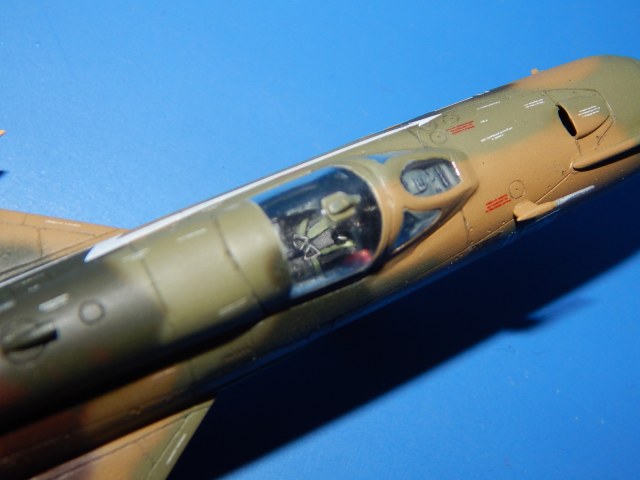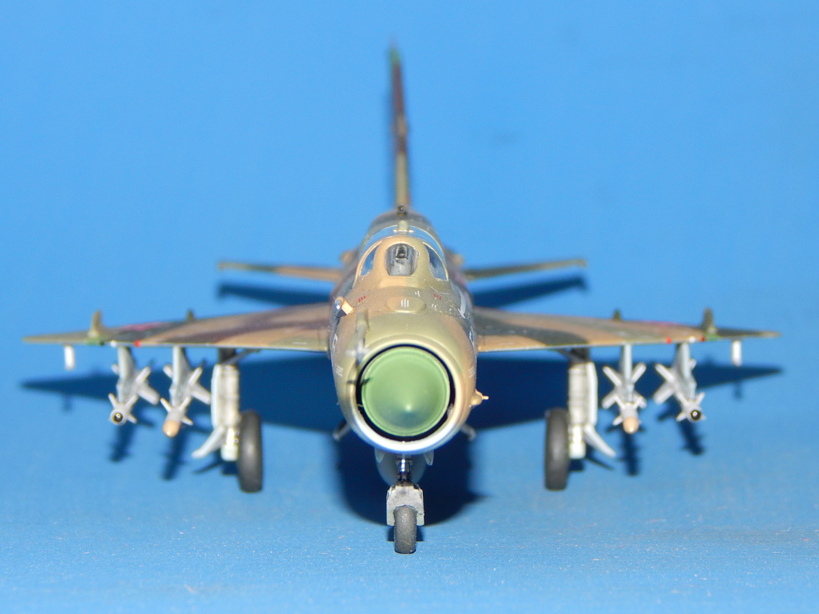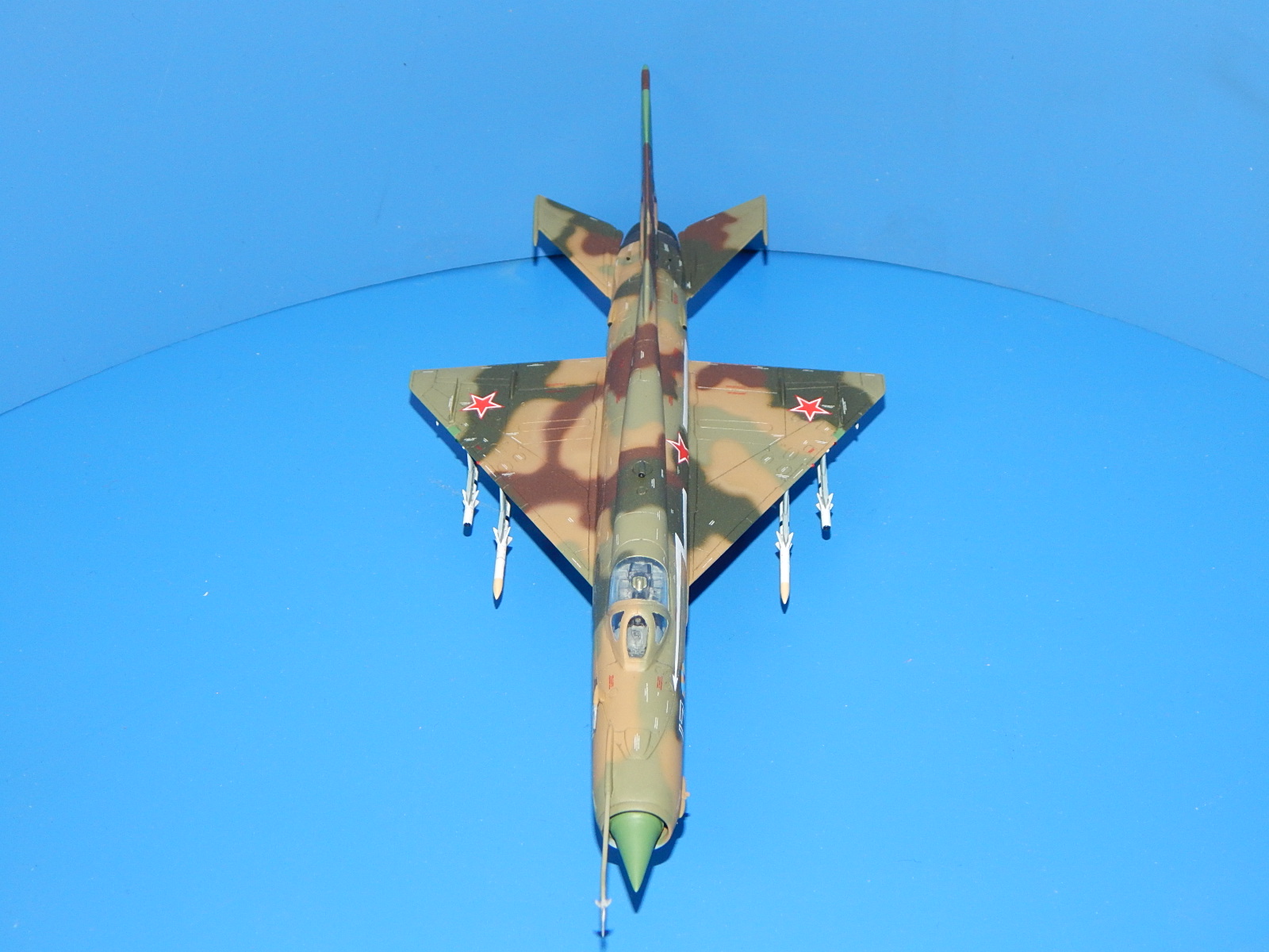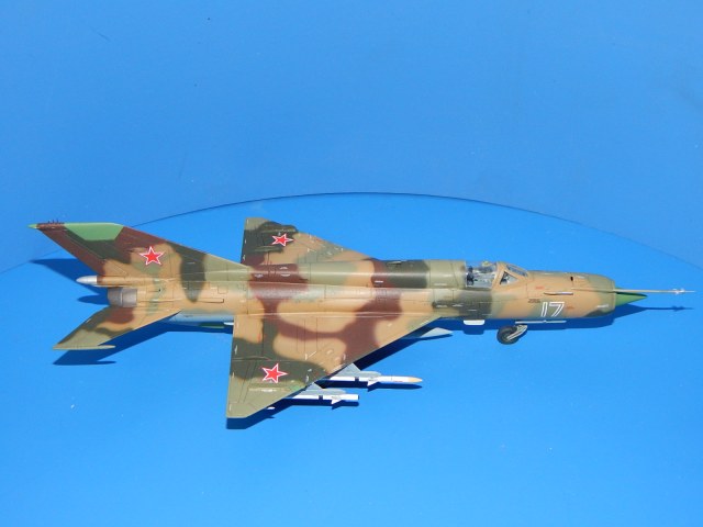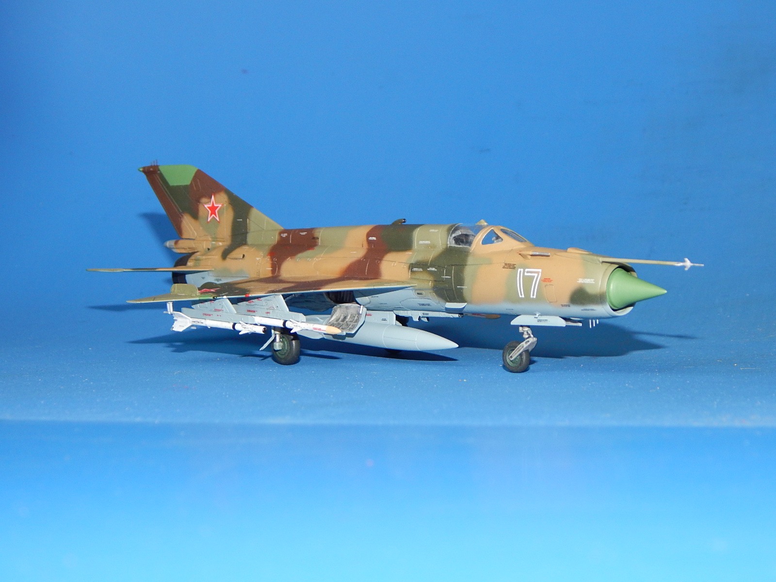 Здравствуйте. Моя очередная модель. Одна из четырёх (собирал одновременно МиГ-15, МиГ-21Ф-13, МиГ-21СМ и МиГ-37). Модель изкоробочной сборки с небольшими допами Master (ПВД, собирать антенну трудно и нервно. Интересно, а как правильно собирать?) и Eduard (ракеты, тоже. Как правильно клеить крылья и рули?). Антенны СРО - волосы из щётки. ПТБ - от МиГ-21 Минской фабрики пластмассовых игрушек, несколько доработанный. Набор несколько сложноват. Особенно, если закрыть тормозные щитки. Серьёзных проблем сборка не вызвала. Собирал долго: на колене, на диване, на полу и за столом. Шпаклевки потратил средне. Выполнил углубление и небольшие дополнения расшивки. Выделял расшивку карандашом (в некоторых местах она кривовата), «пачкал» - TamiyaPanelline. Фонарь футурил купанием, но что-то не до конца - остался чуть мутноват и с царапинами (не знаю, как так получилось). С масками было немного проблем: скотч Tamiyaпо периметру + синий Microscale в центре. Красил аэрографом эмалями Tamiya. Низ и пара цветов камуфляжа, радиопрозрачные панели, металлики - Акан. Схема камуфляжа - МиГ-21СМТ Eduard 1/48. Мой первый камуфляж, рисовал без масок. Попробовал осветлить финишным покрытием от Акана. Крайне неудачно. В результате - пара месяцев «депрессии с апатией», всё внимание на другие модели и полный перекрас оной. Обозначил антенны, датчики и БАНО на плоскостях. Декали от Бегемота приваривал Microscale SOL и SET. Финишный лак - Humbrolв стекле. Долго я его искал. С уважением, Александр.