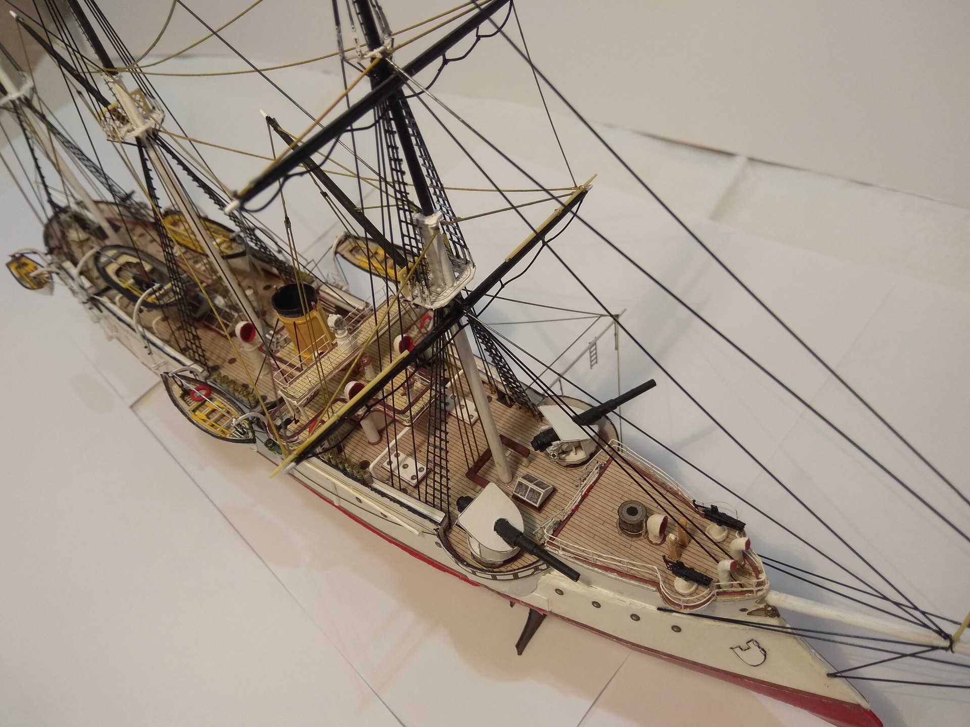 Обычно от оценки картонщиков воздерживаюсь,но это не тот случай. Модель состоялась. Замечание от меня- отрезать концы выбленок,которые торчат за крайний вант,добавить талрепы /чисто декоративно/ . Остальное нормально. Пушки уж очень "сажей" покрыты. Или так снято. Можно и в галерею.