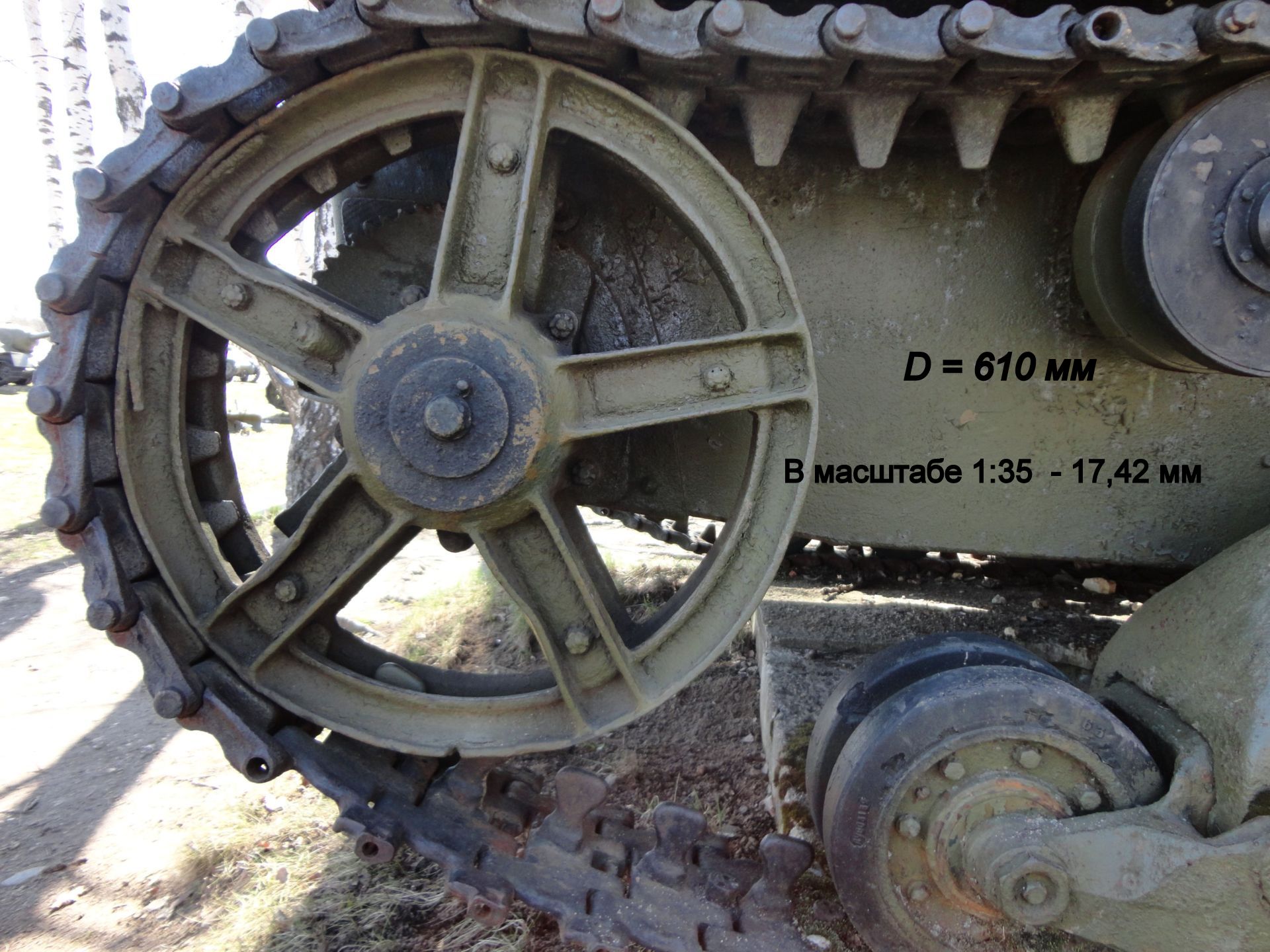 Для направляющих колес: реальный размер – 610 мм, в масштабе 1:35 – 17,42 мм (округлено до сотых). Изделия: «SPM» - 17,4 мм, «Комплект ЗИП» - 17,45 мм, «Сталинградский фронт» - 18 мм, «Хобби Босс» - 17,75 мм.