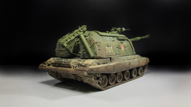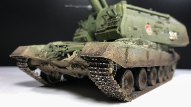 Делалось по фотографиям. Видимо, грязь налетела, когда башня была повёрнута. По гусеницам, как мне кажется, беговая дорожка никогда не бывает полностью чистой. Какая-то грязь выдавливается, но все равно малая часть остаётся.