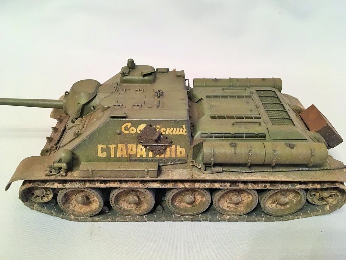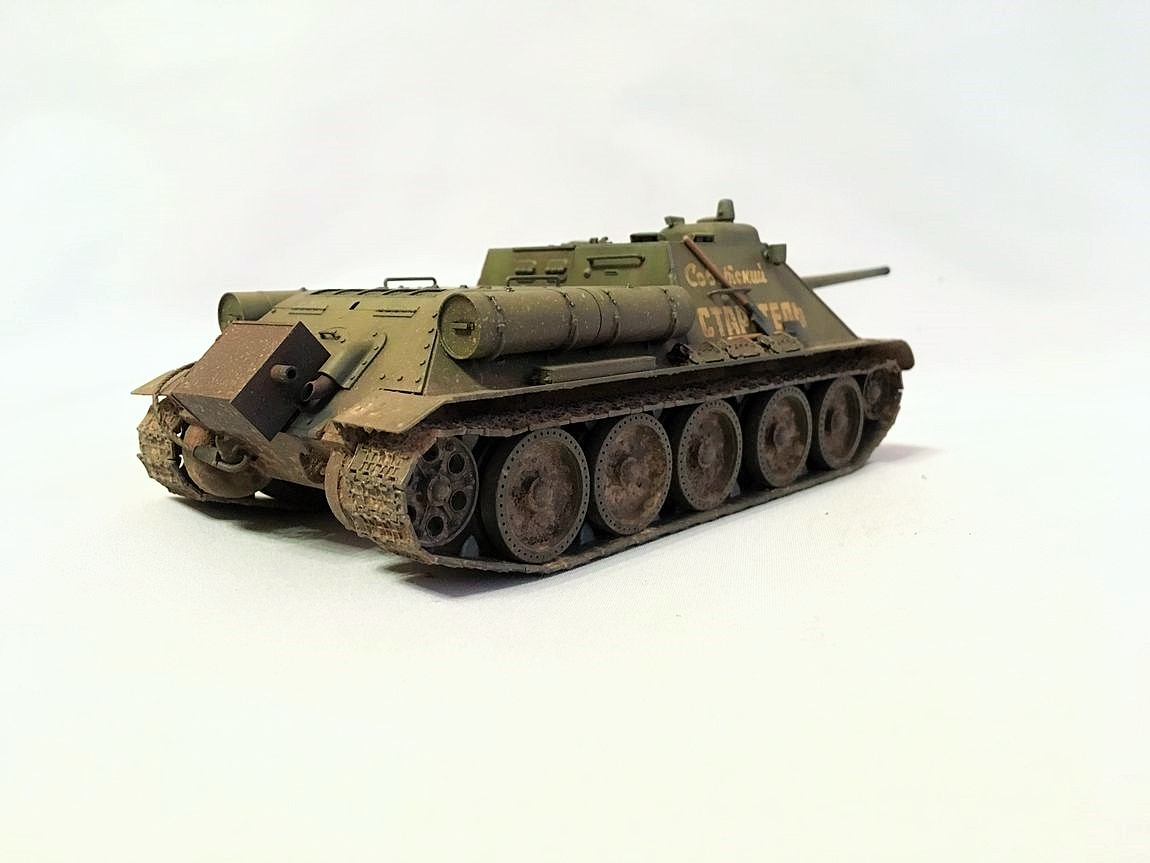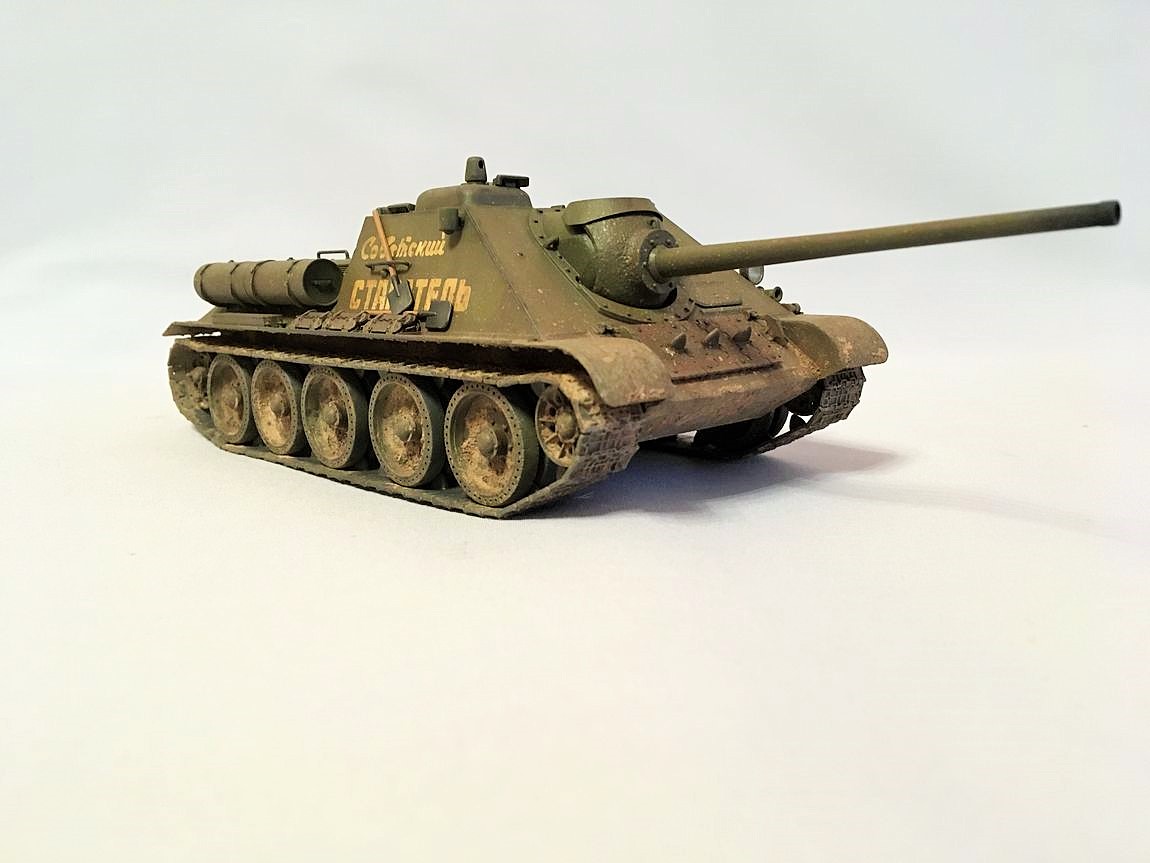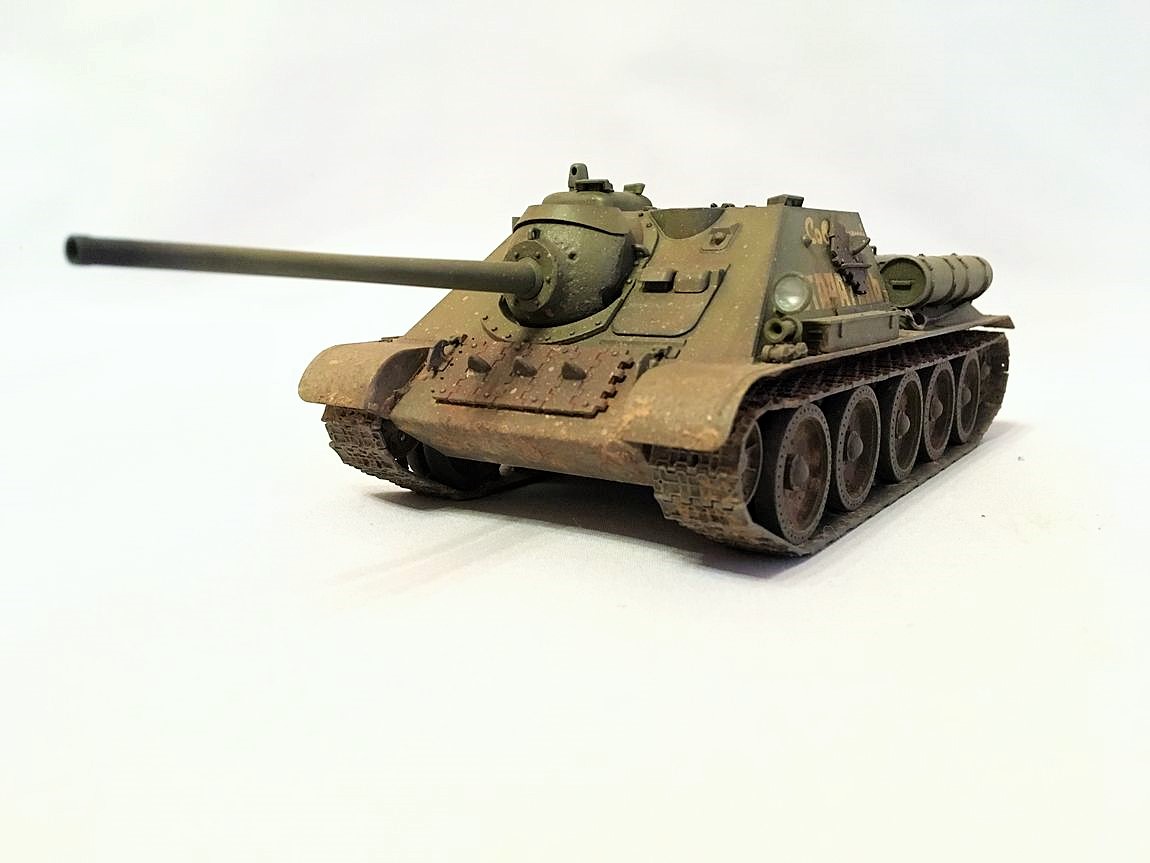Здравствуйте уважаемые моделисты. Хочу представить вам свою модель су-85.Модель собиралась из коробки. Красил красками mr hobby и tamiya. После покраски нанес смывку и масляные точки. Впервые попробовал нанести погодные эффекты с помощью химии ammo mig и zip maket. В матчасть не лез-основной задачей было попробовать на модели везеринг. Хотелось бы услышать от вас советы и замечания по нанесению грязи и следов эксплуатации.