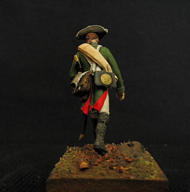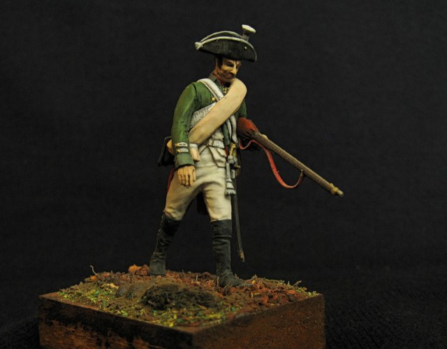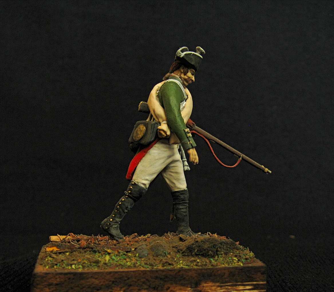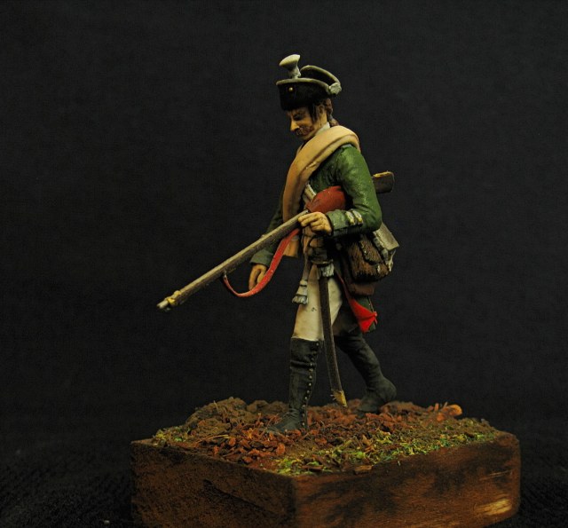 Здравствуйте. Вот, мушкетер (1 мушкетерская рота, 1 батальона), Тамбовский полк, принял участие в итальянской и швейцарской кампании 1799 года. Приборный металл - желтый, приборный цвет - селадоновый. Фигура в сборе сложноватая, а при фотографировании - сложна неимоверно (по крайней мере для меня). Акрил, эмаль.