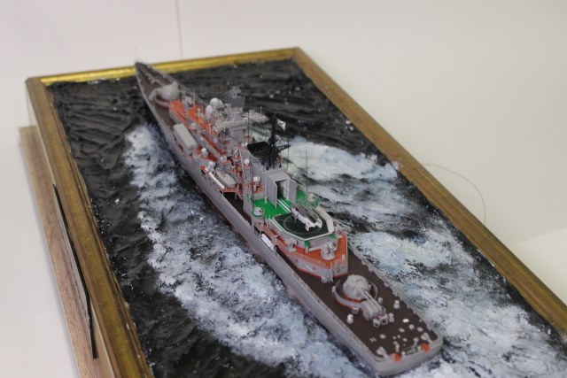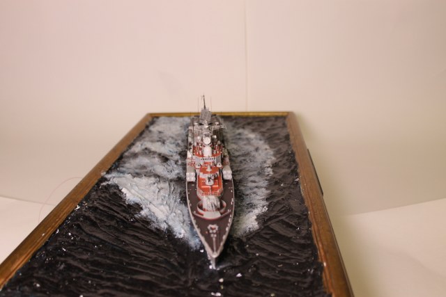 Что касается "моря" - там,где нет "бурунов",смотрится очень неплохо,особенно с левого борта,по правому,да,не совсем удачно получилось.По моему личному мнению,диорама должна максимально точно передавать динамику сюжета,так,что бы у смотрящего было полное ощущение того,что происходит в данный,конкретный момент, с кораблём (поворот,циркуляция и т.д.).У тебя этого,к сожалению, не вышло.В качестве совета,попытайся понаблюдать за реальными кораблями(волнообразование,буруны,кильватерный след) или хотя бы повнимательнее присматривайся к фотографиям,выбирая для себя ту,которая тебе подходит по сюжету.