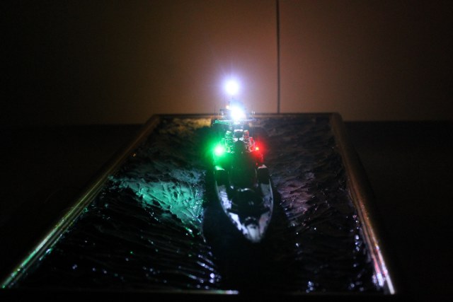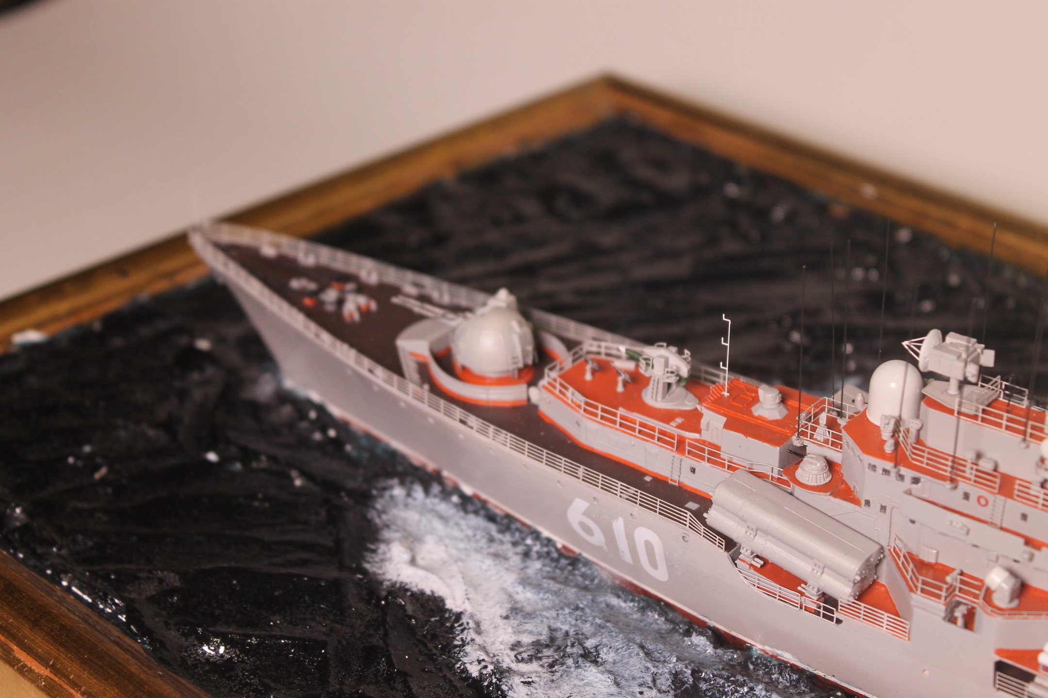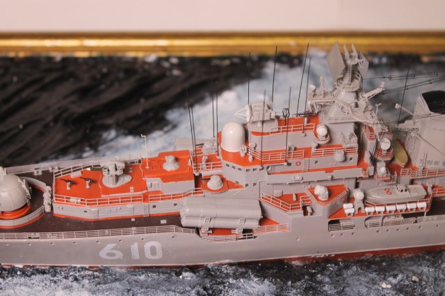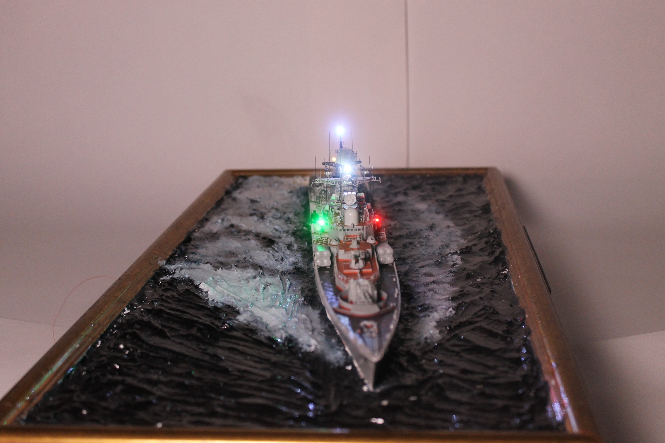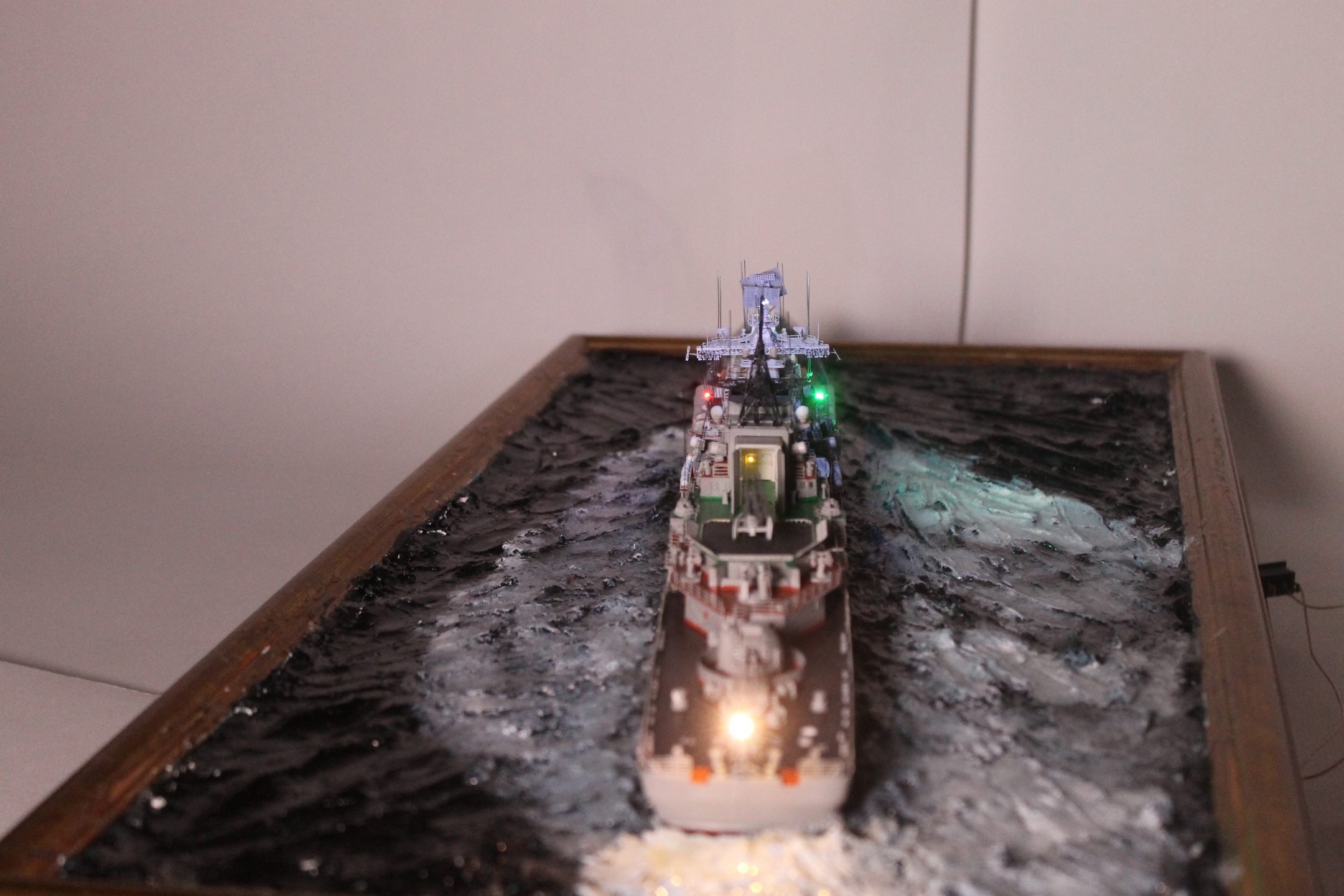 След от циркуляции абсолютно не реален. При таком развороте его должно было накренить плюс по левому борту пены должно быть меньше. Могу предположить что это он лег на циркуляцию и ушел на реверс. Тогда может быть было бы и реалистично. Черные антенны на рубке тоже режут глаз. Ну и монотонность окраса,как у конструктора лего, не понимаю зачем делать диораму без следов эксплуатации. На счет матчасти - сарыч от трумпетера это боль. Плюс я не уверен в правильном расположении топовых огней, а бортовые с кормы наблюдаться точно не должны. Там сектор должен быть в противном случае правило 13 МППСС теряет свою суть.