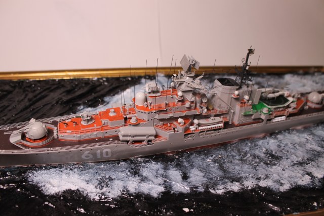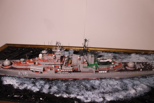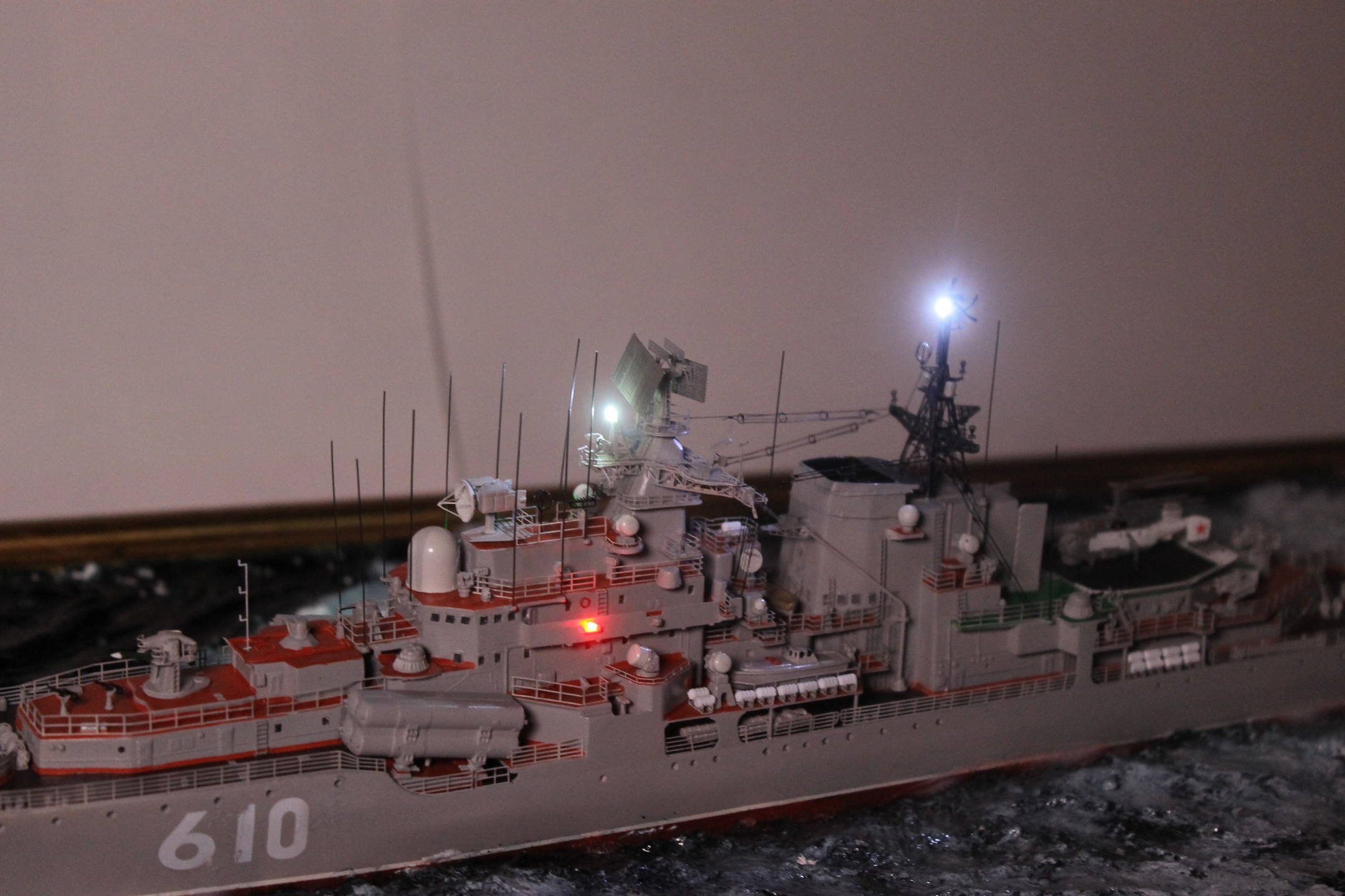 В общем при строительстве использовалась коробка от Trumpiter для ранних корпусов серии, листовой пластик, набор фототравления для ЭМ проекта 956 от GMM и Микродизайна, набор лееров и кронштейнов для спасательных плотиков от него же, набор скобтрапов, вертикальных трапов, смоляные ак-630 и рбу-1000 от North Star Model, точеные стволы для ак-130 уже даже не помню от кого, кольцевые антенны от RainBow, нитки для бисера, английские булавки, прочие подручные материалы и конечно же диоды разных цветов и самых маленьких размеров, предварительно припаянные к тонким проводкам, и в таком виде продающиеся на eBay.