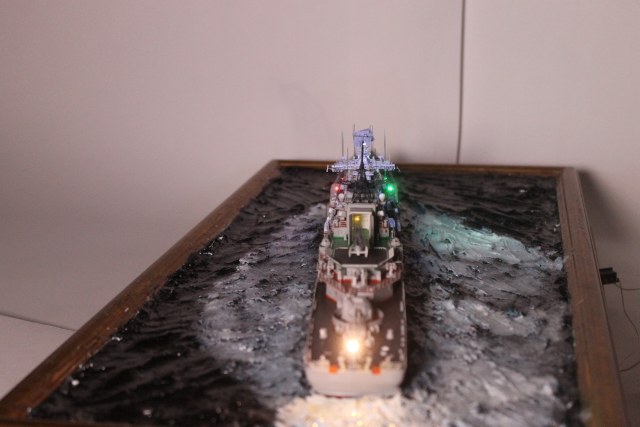 Стройка шла тяжело - детали стыковались друг с дружкой практически никак, а уж про членение я вообще молчу - хотел бы я посмотреть в глаза человеку кто его придумал... Либо приклеишь но уже не покрасишь нормально, либо покрасишь, но фиг потом без жертв приклеишь... Ну и наконец, впервые в жизни я задумал электрофицировать модель и сделать навигационные огни и освещение ангара, что тоже не добавило простоты в сборке, а уж нервов так и вовсе потрепало изрядно - каждый раз стыкуя новые детали так и думалось - только бы не порвать эти тонюсенькие проводки и не оторвать диоды, только бы все не испортить в самом конце, когда будет обиднее всего. А уж когда начал делать море... чуть было не доигрался до того, чтобы не отправить всю модель на помойку - хорошо жена помогла с формовкой быстро застывающего гипса. Но в итоге все более-менее получилось, хотя и не без косяков (куда ж без них?).