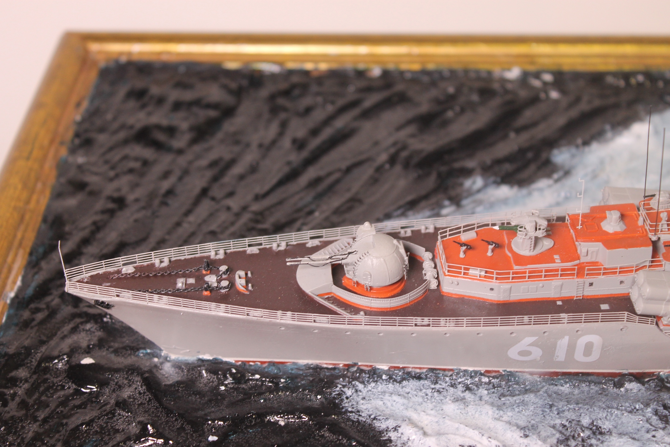 Ну и напоследок море... Которое чуть мне не стоило инфаркта. Начнем с того что когда я вклеивал корабль в подставку из панелита и гипса, я заметил что что-то как-то корабль не хочет вставать на заготовленное место. Хотел было применить немного силу, но решил таки вытащить и посмотреть в чем дело. Миллиметр! Примерно столько мне оставалось продвинуть корабль, чтобы не порвать 1 из проводков, из чего они сделаны я не знаю, но спасибо тому человеку кто их придумал. Ну и как вишенка на торте, с гипсом тоже вышла промашка и он начал застывать практически мгновенно. Тут уже не до красоты и правдоподобия было, а хоть как-то спасти корабль. В итоге в четыре руки, это сделать еле-еле успели, но море все равно считаю самой неудачной частью этой работы.