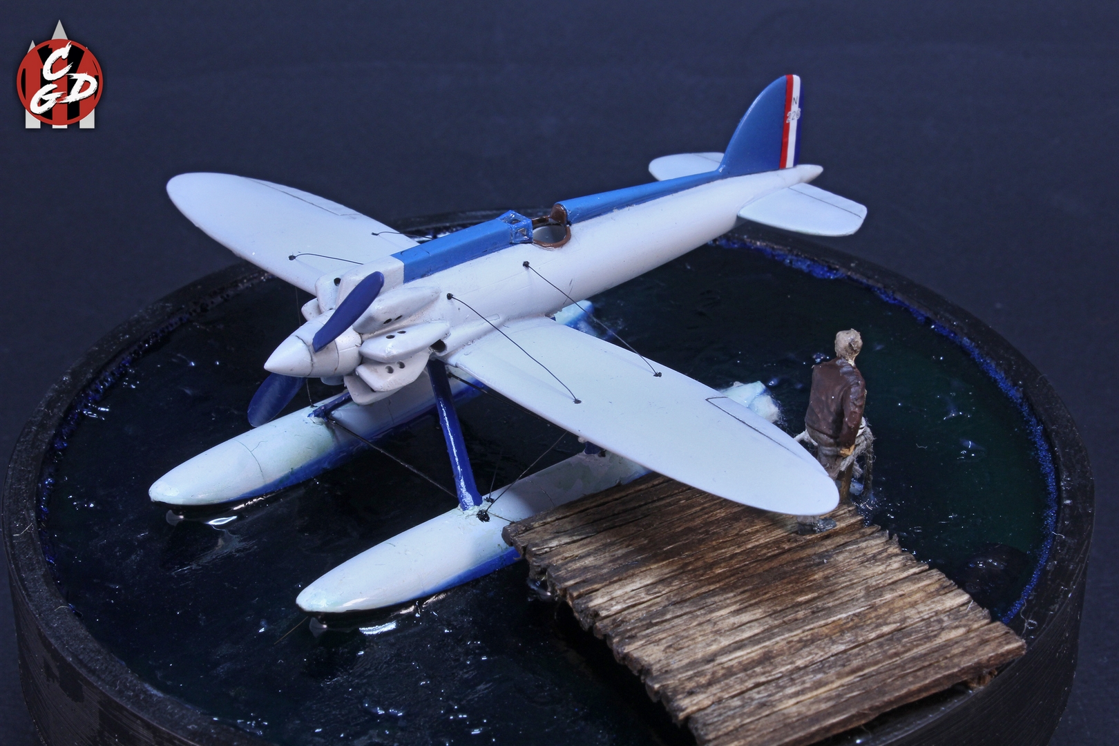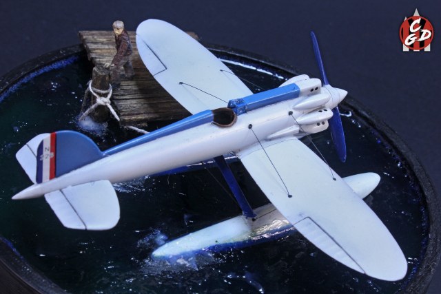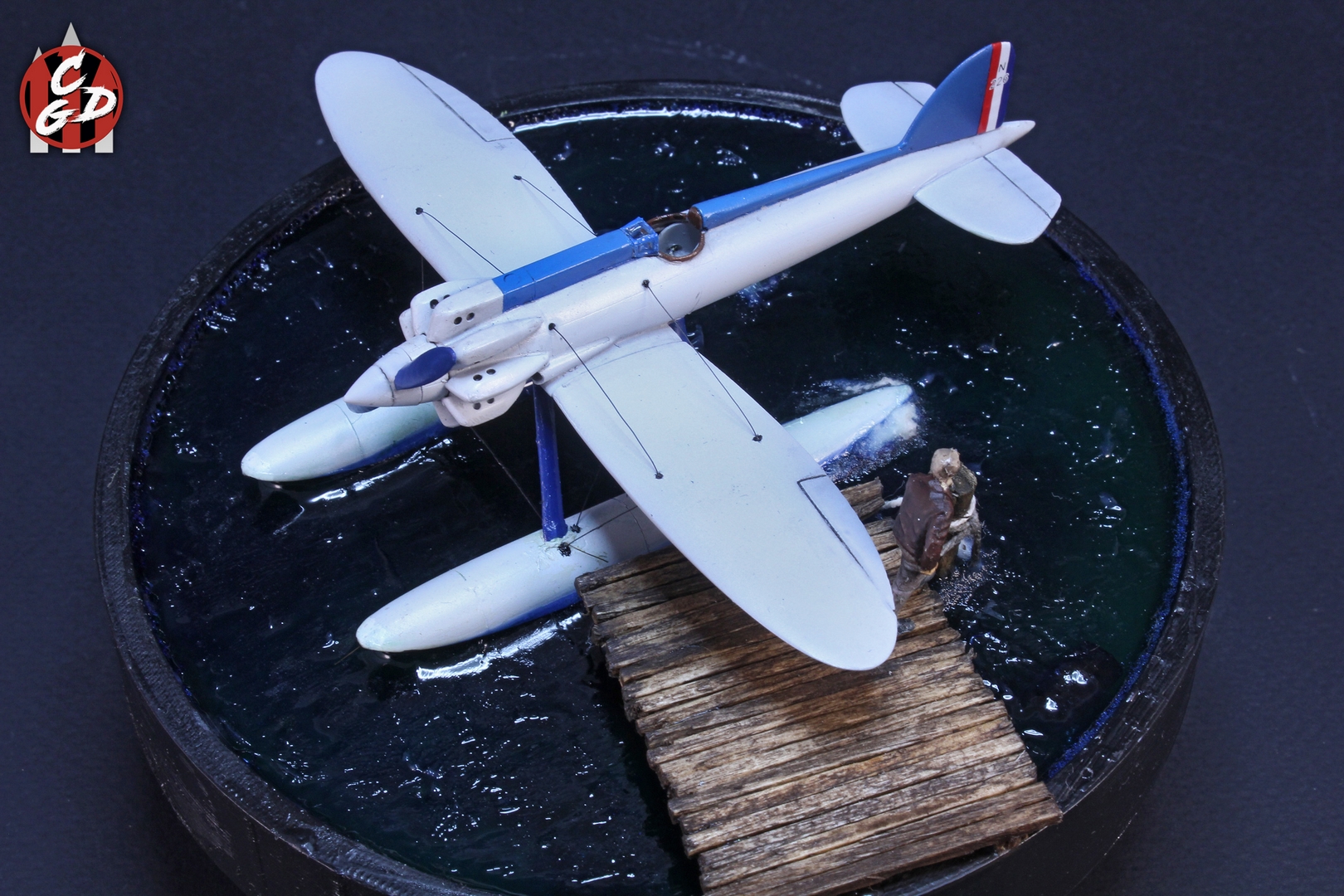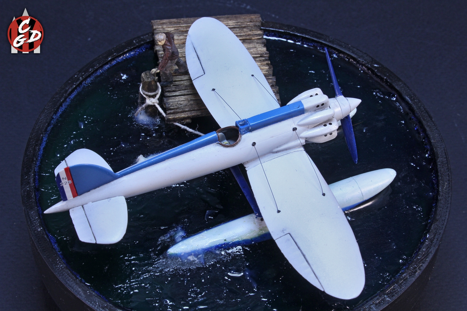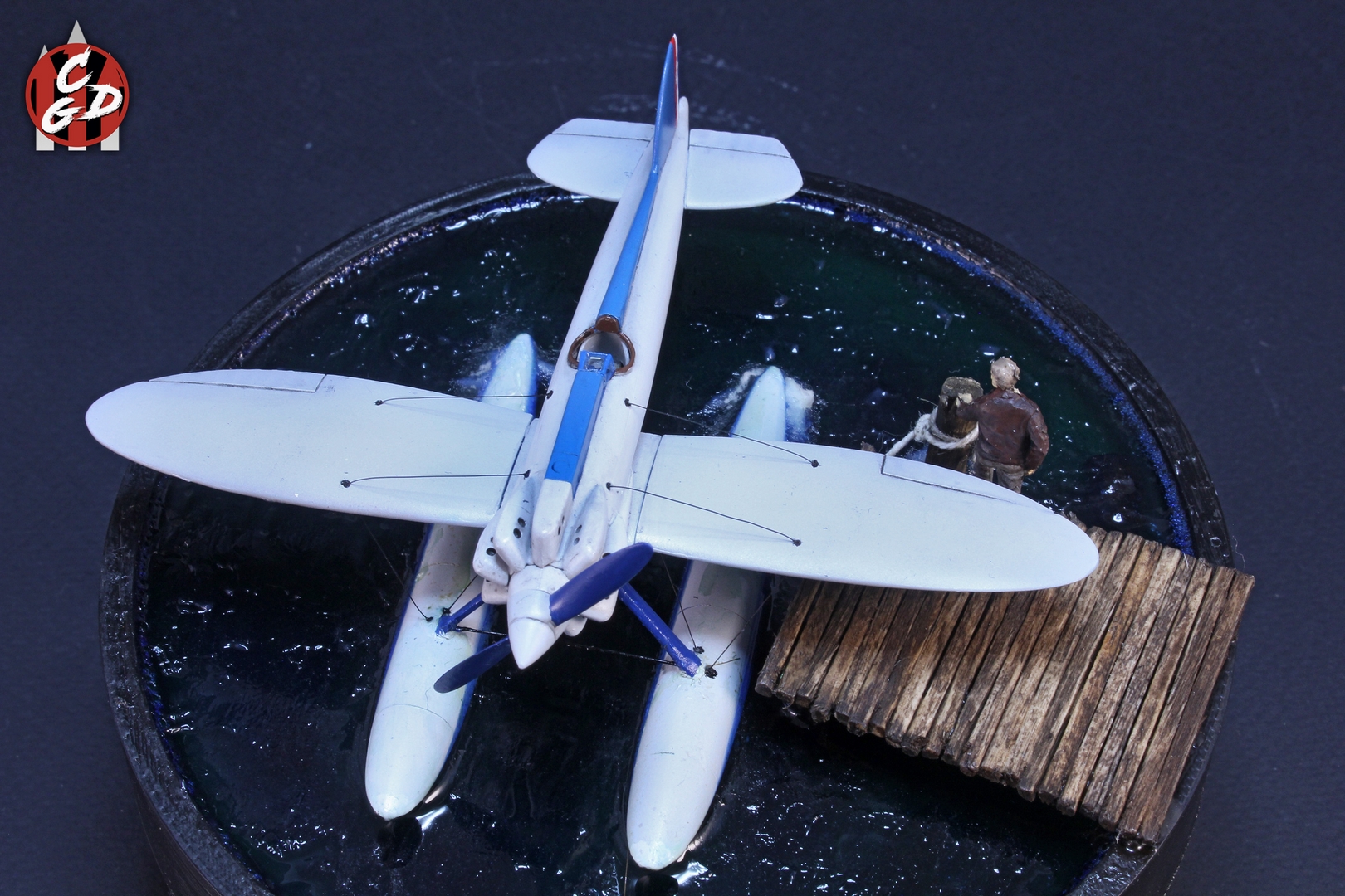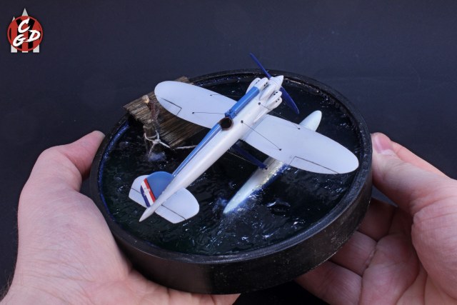 В основе подставки лежит 3д печатная заготовка, вода - подкрашенная цветными лаками от Aqueous Hobby смола ЭДП и акриловый гель (и немного ваты с ПВА), мостик - спички и палочки от суши. На дне даже есть гипс и камешки, а также водоросли, но, увы, этого практически не видно. Фигурка из запасов. Хотя по факту вода имеет неплохую прозрачность и зеленовато-синий оттенок, из-за контраста при съемке столь светлого самолета, а также черных стенок заготовки мне так и не удалось на фото передать полноценно её цвет. Что, впрочем, на мой взгляд не портит общей картины.