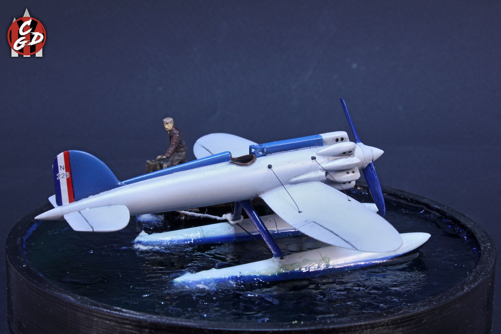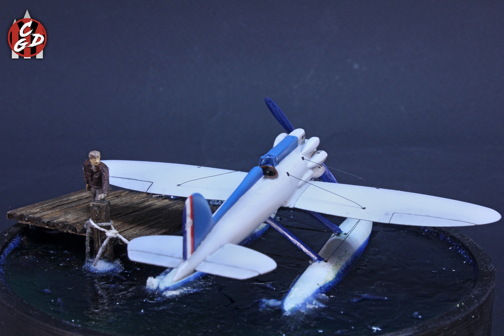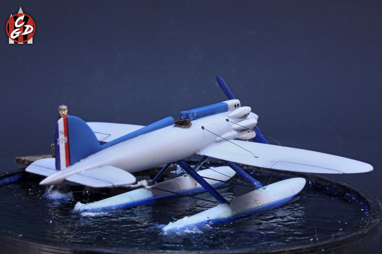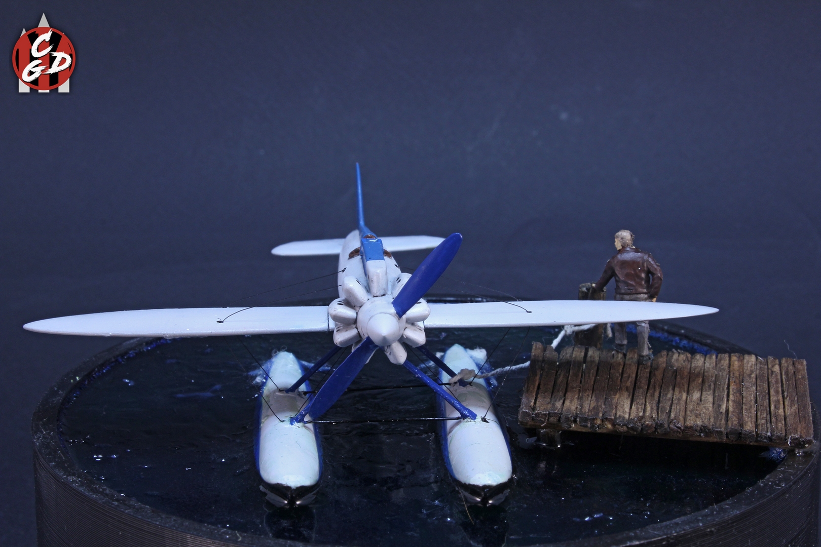 В основе подставки лежит 3д печатная заготовка, вода - подкрашенная цветными лаками от Aqueous Hobby смола ЭДП и акриловый гель (и немного ваты с ПВА), мостик - спички и палочки от суши. На дне даже есть гипс и камешки, а также водоросли, но, увы, этого практически не видно. Фигурка из запасов. Хотя по факту вода имеет неплохую прозрачность и зеленовато-синий оттенок, из-за контраста при съемке столь светлого самолета, а также черных стенок заготовки мне так и не удалось на фото передать полноценно её цвет. Что, впрочем, на мой взгляд не портит общей картины.