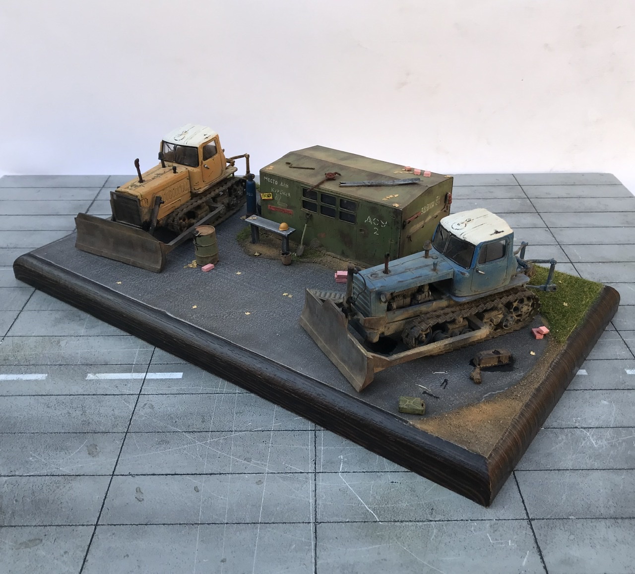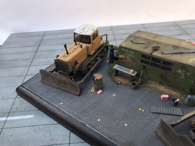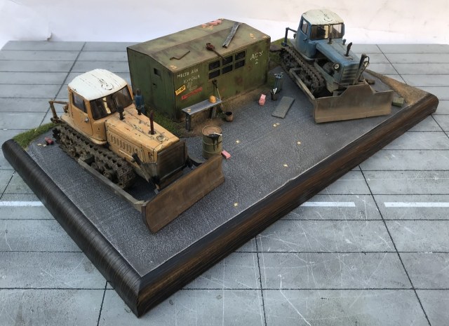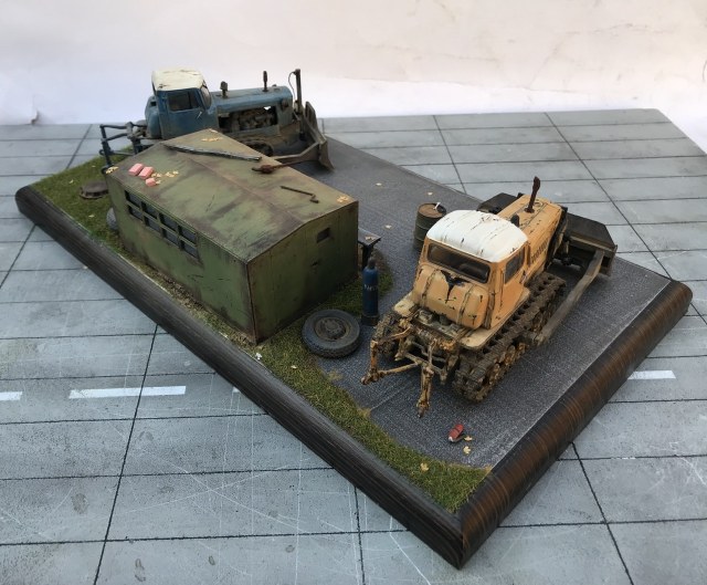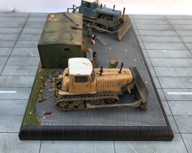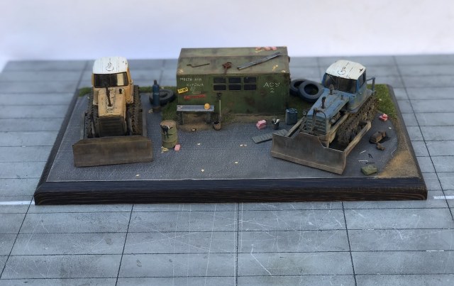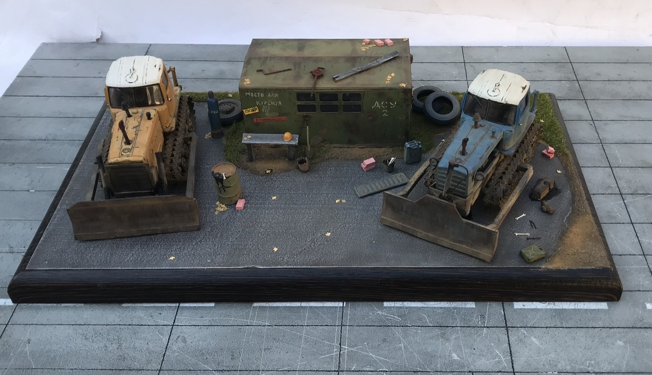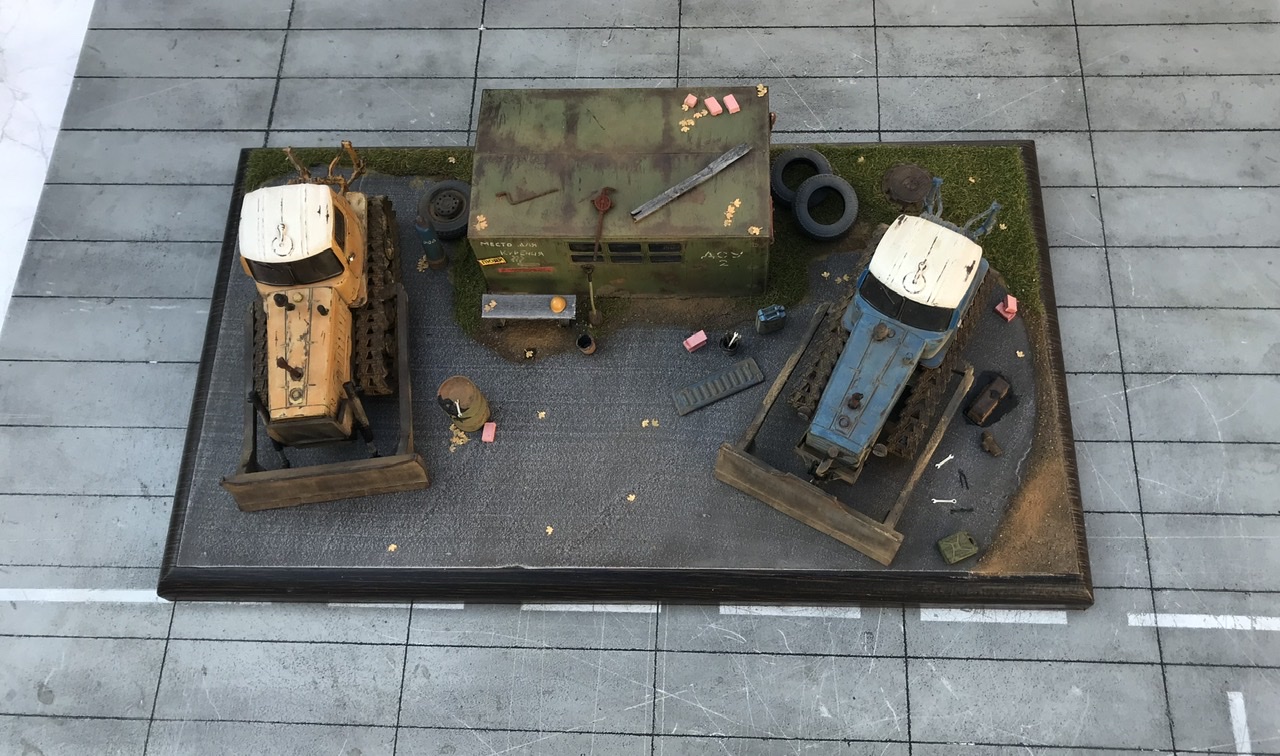 Всем привет! Представляю небольшую мини виньетку , что то вроде мини базы. Переделаны трактора из журнальной серии, полностью отмыты, перекрашены, рассверлены фары, сделаны ручки, установлены отвалы . На одном тракторе выпилены капоты и установлен двигатель от УМи. Разные элементы, ведра итд от Avd models, установлено фототравление от Петроград.Покрашено эмалью мотип. Приятного просмотра!
