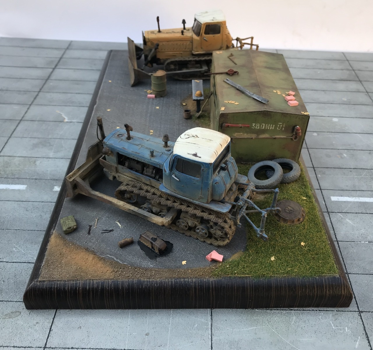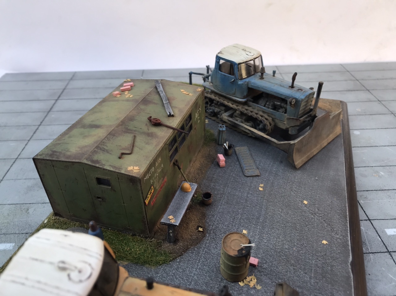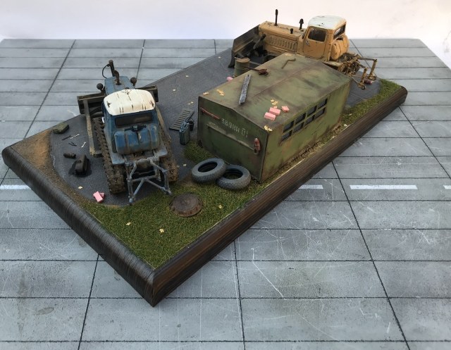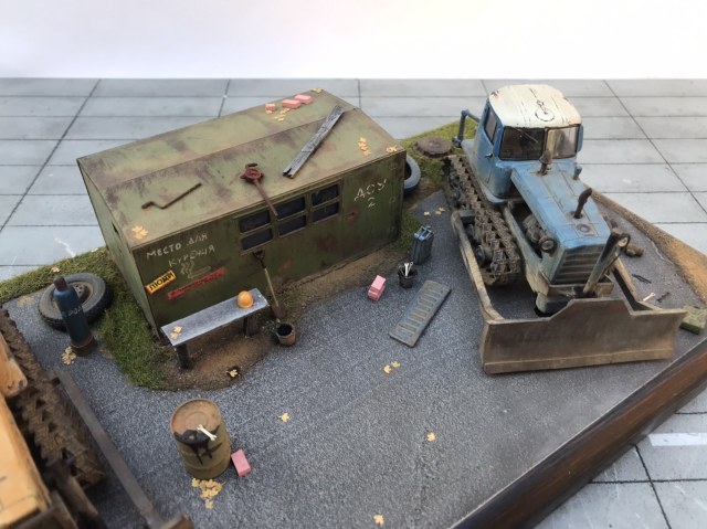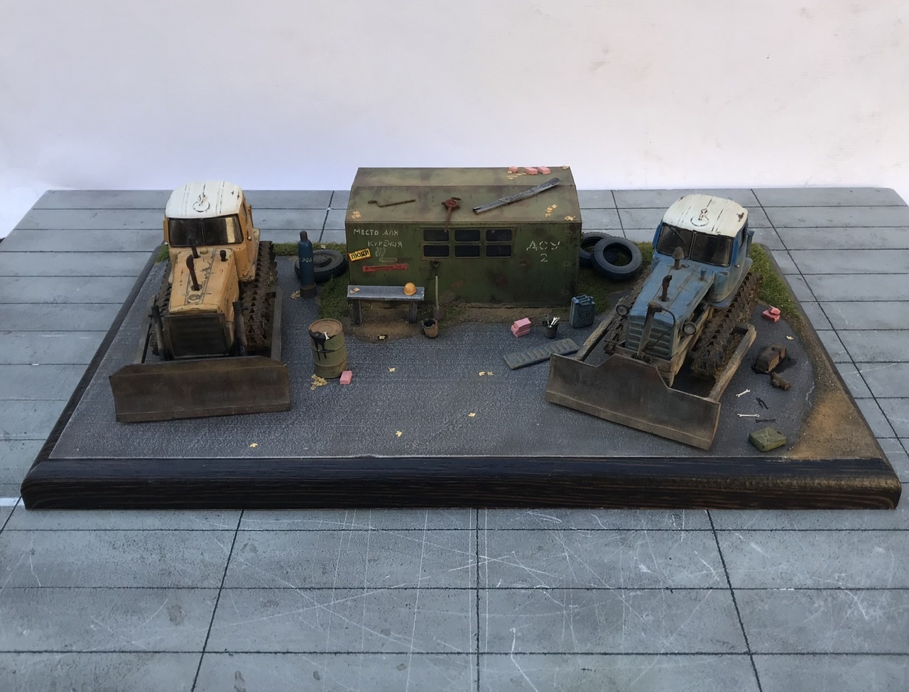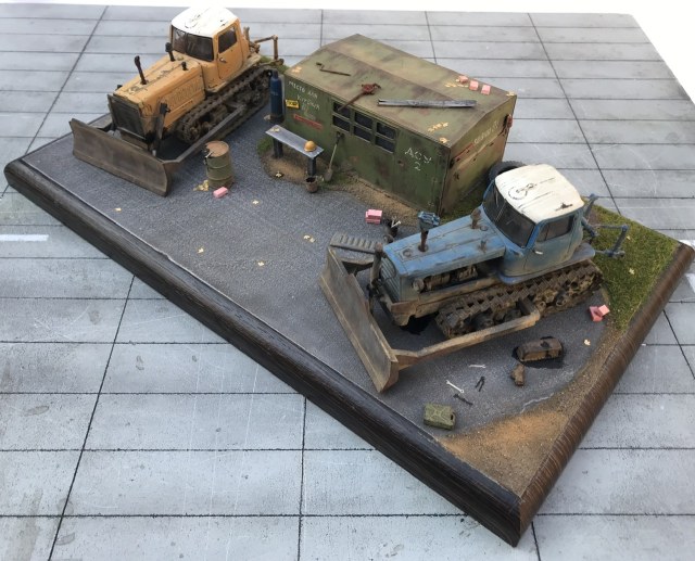 Всем привет! Представляю небольшую мини виньетку , что то вроде мини базы. Переделаны трактора из журнальной серии, полностью отмыты, перекрашены, рассверлены фары, сделаны ручки, установлены отвалы . На одном тракторе выпилены капоты и установлен двигатель от УМи. Разные элементы, ведра итд от Avd models, установлено фототравление от Петроград.Покрашено эмалью мотип. Приятного просмотра!
