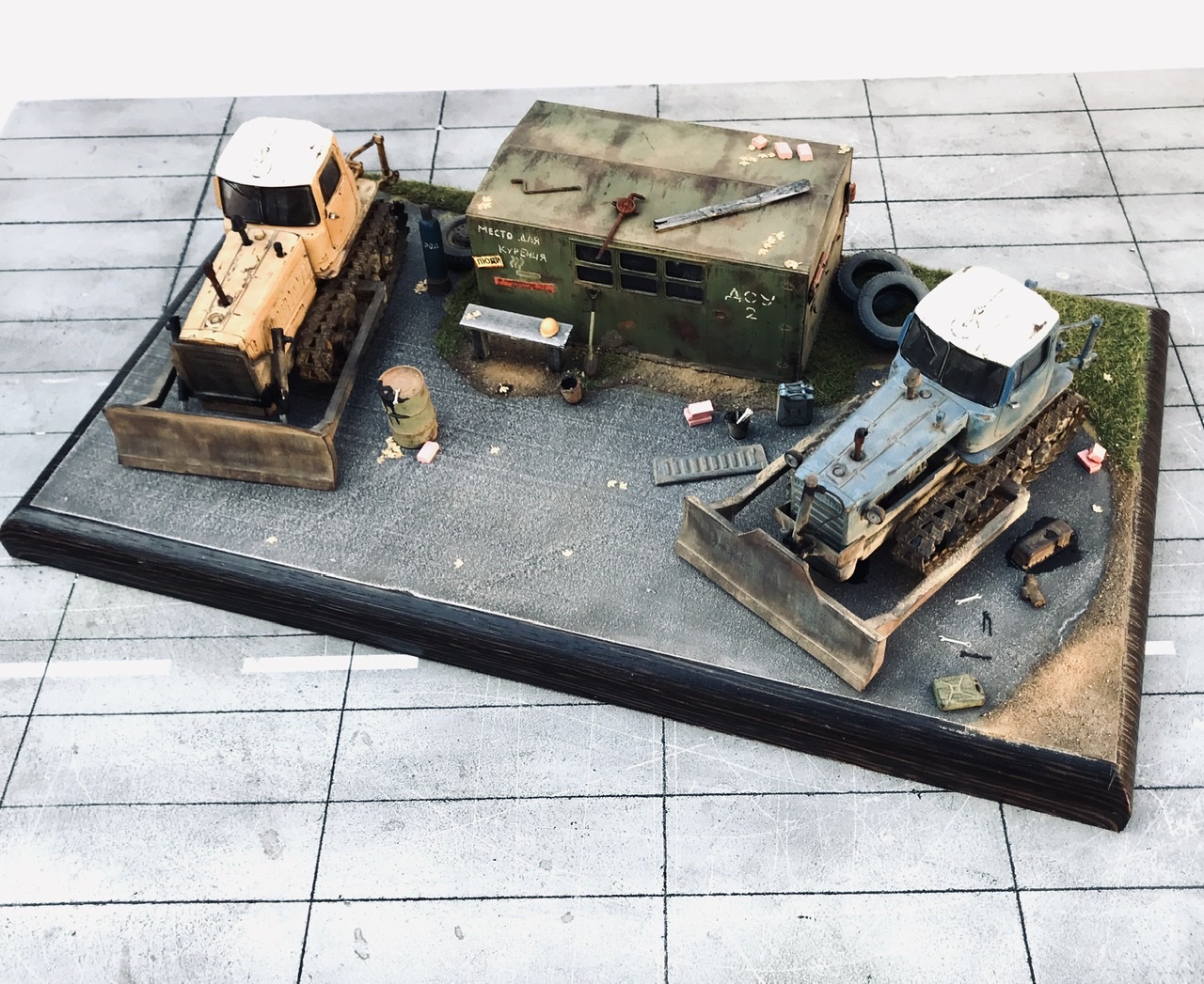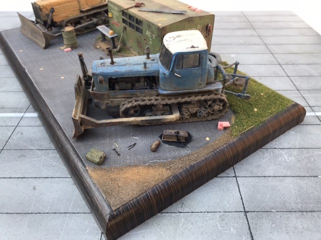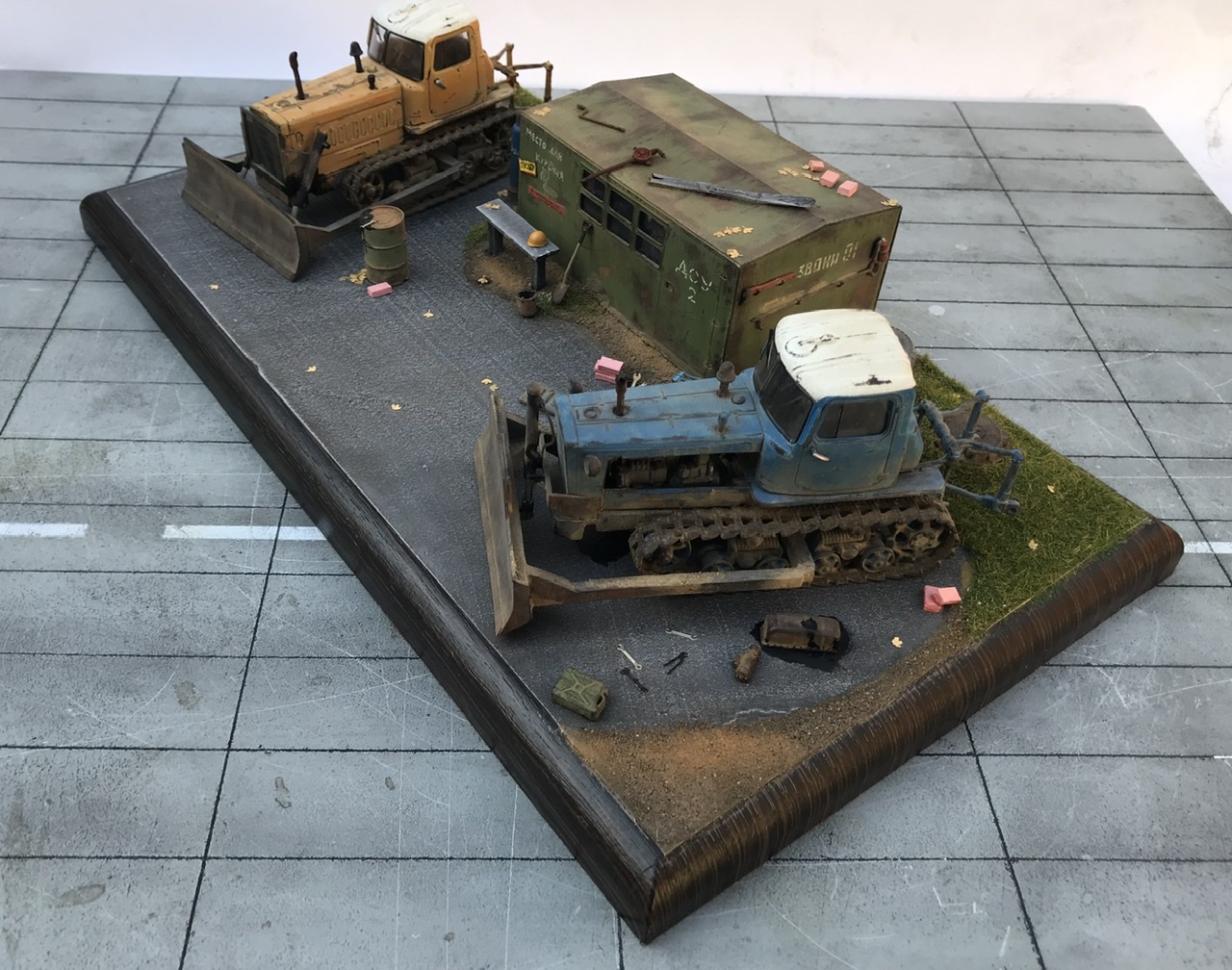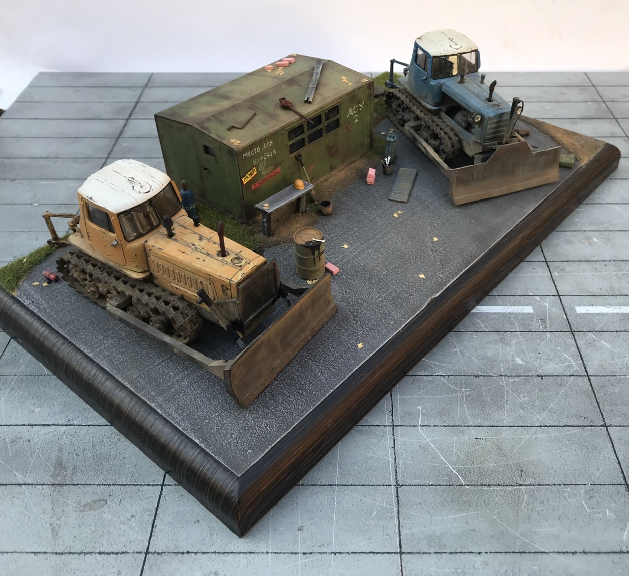Всем привет! Представляю небольшую мини виньетку , что то вроде мини базы. Переделаны трактора из журнальной серии, полностью отмыты, перекрашены, рассверлены фары, сделаны ручки, установлены отвалы . На одном тракторе выпилены капоты и установлен двигатель от УМи. Разные элементы, ведра итд от Avd models, установлено фототравление от Петроград.Покрашено эмалью мотип. Приятного просмотра!