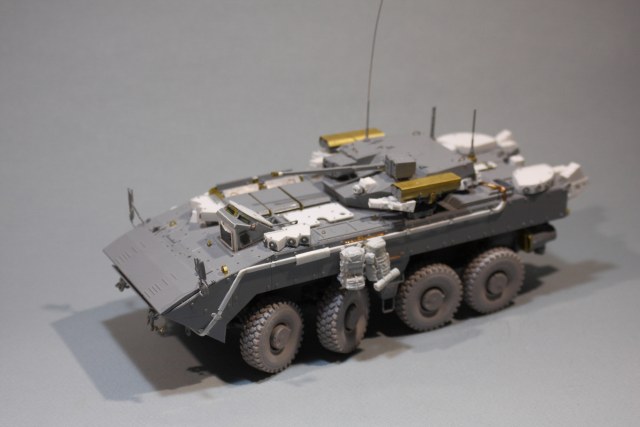 Новая моя работа - перспективная российская БМП К-17 "Бумеранг", оснащенная комплексом активной защиты "Афганит" и электромагнитным тралом. Модель - декабрьская новинка от "Звезды", купленная мной совершенно спонтанно в официальном магазине этой фирмы. Модель дополнил другой новинкой, на этот раз от "Микродизайна", оперативно выпустившего для "Бумеранга" набор фототравления. Трос -также от севастопольской фирмы. Колеса - смоляные от Miniarm для "Бумеранга" от Panda, тактические рюкзаки приобрел у ZIP Market.