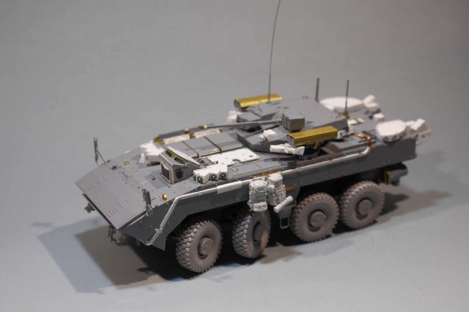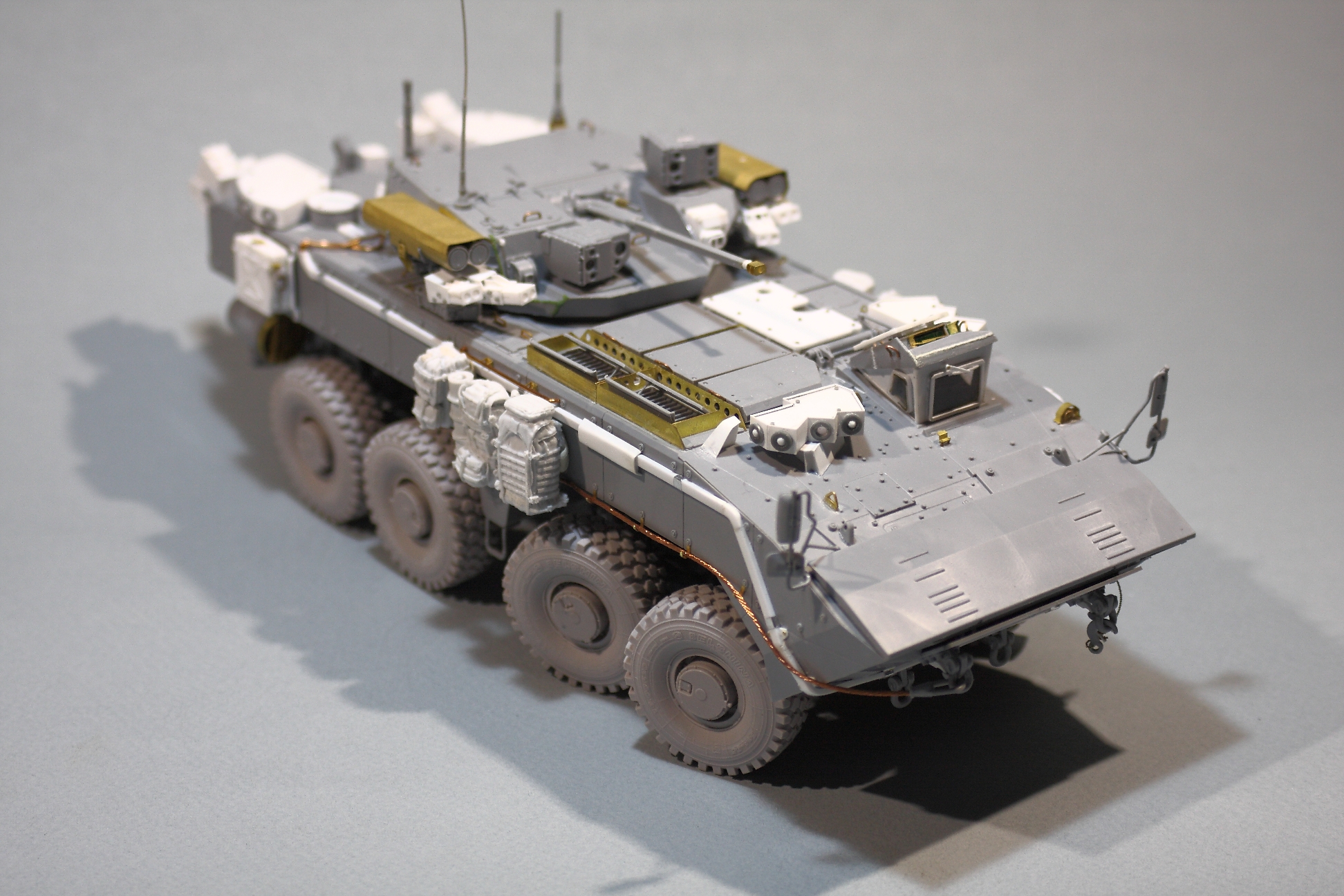 Стройку вел на Каропке и на соседнем ресурсе. Изначально планировал построить модель строго из коробки с добавлением травления, но по итогам изучения прототипа понял, что строить выставочную или парадную машину совсем не хочется, но если попробовать воспроизвести полностью комплектную машину, то может получиться гораздо интереснее. Парадно-выставочные машины отличаются от опытных образцов отсутствием большинства компонентов КАЗ "Афганит" и электромагнитного трала, размещенного на бортах корпуса и НЛД. В качестве референса по опытным "Бумерангам" использовал документальный фильм "Путь "Бумеранга" из цикла "Военная приемка", видео с парада, приуроченного к 75-летию полигона в Смолино (бывший Гороховецкий АНИОП), а также ряд других материалов. Также, чтобы разнообразить работу, сделал передние пары колес поворотными.