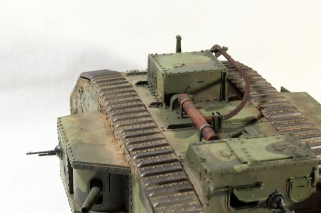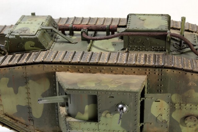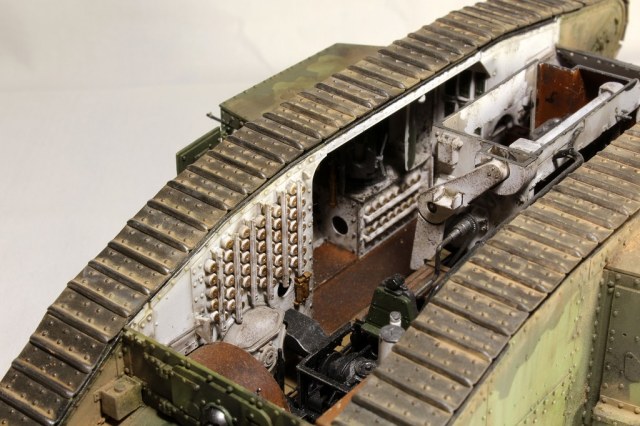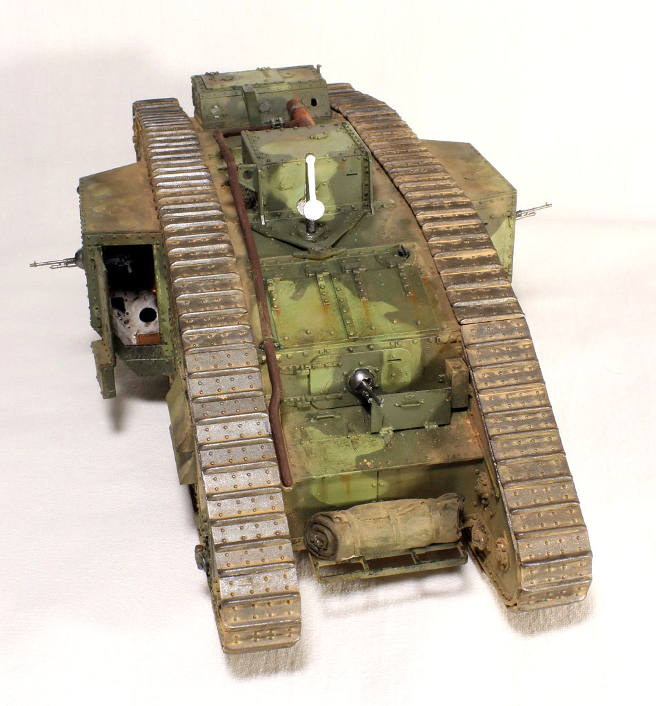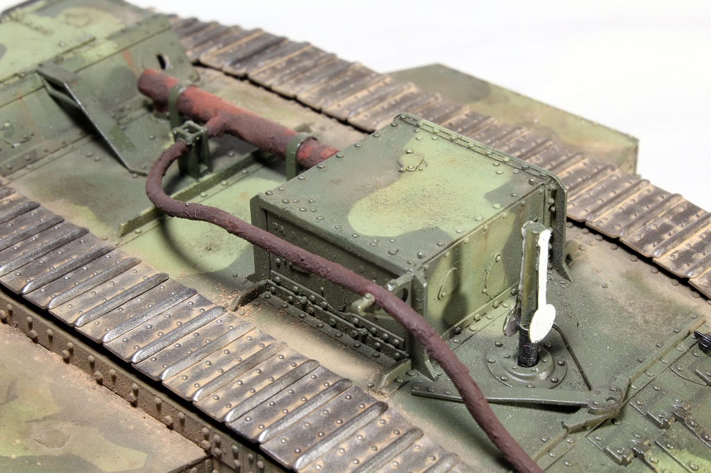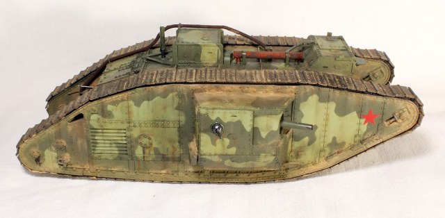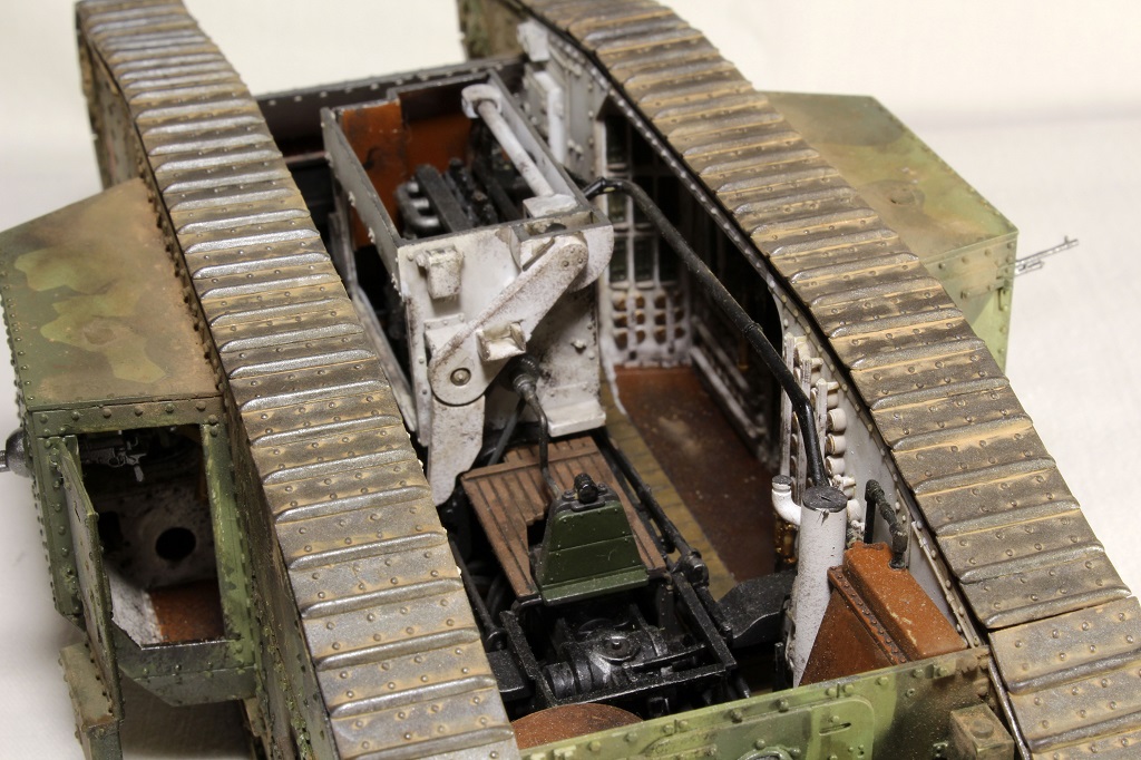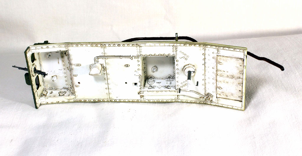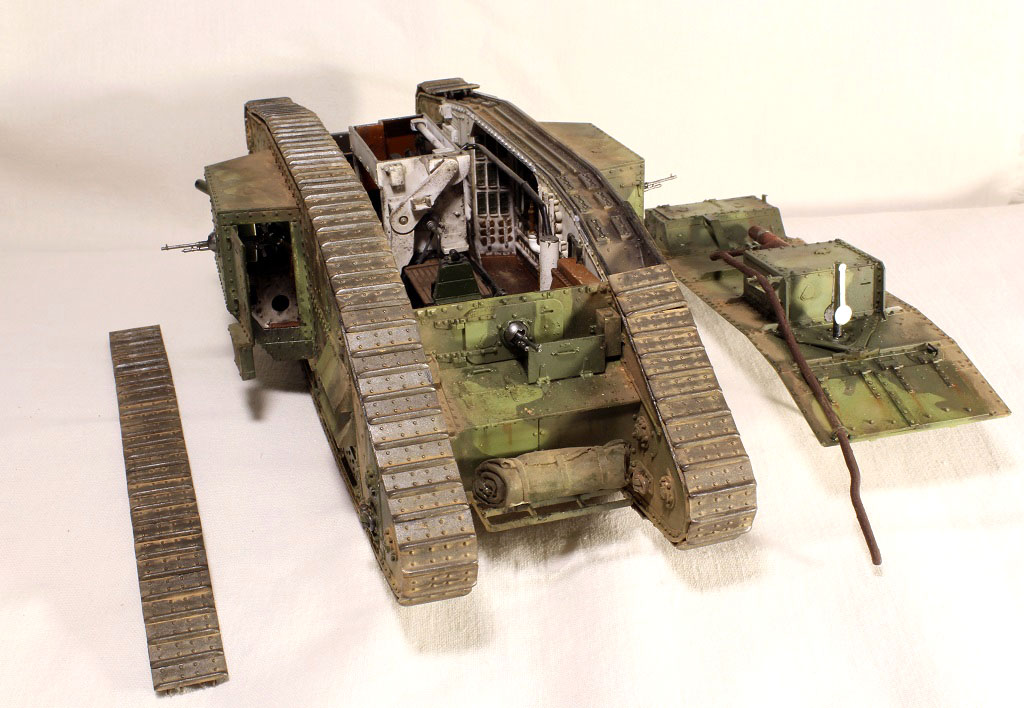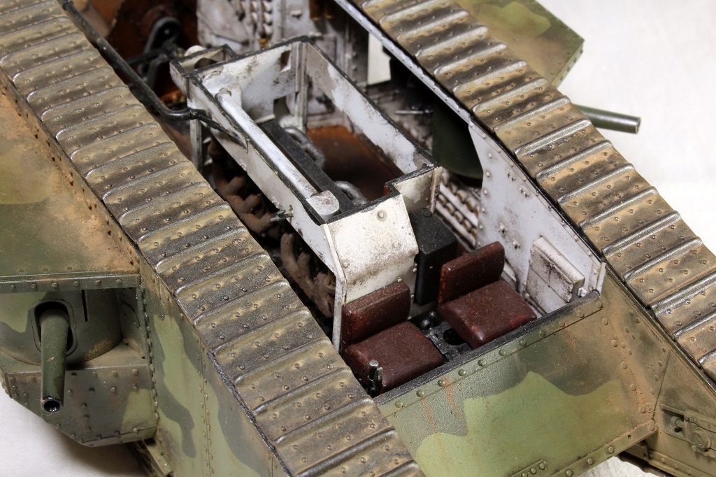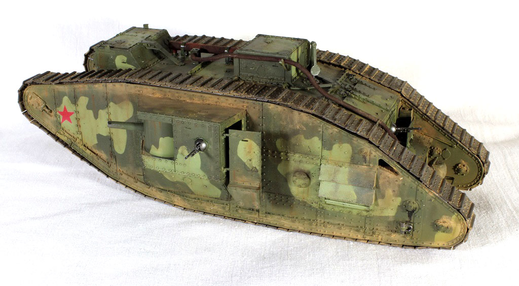Богатый интерьер жалко прятать и тут возникает проблема - как все это показать. Посмотрел я на забугорных форумах, что творят коллеги с данным набором. Видел три варианта: 1. снятый и установленный на подставочку боковой спонсон (вроде как ремонт), через проем частично просматривается интерьер, 2. целиком снятая боковина корпуса с гуслей по периметру ( опять подставочки для обеих половин) 3. радикальный разрез танка в продольной проекции - фактически сечение танка. Ни один из вариантов меня как-то не устроил. И я, как принято в нашей стране, пошел своим путем. Верхние секции гусениц снимаются, позволяя извлечь крышу и обнажить нутро. Если бы на модели были установлены рельсы для бревна самовытаскивания, этот номер не прошел бы. Но на танках "Рикардо", как называли их в РККА, эти рельсы не использовались и срезались, и крышу на модели снять ничто не мешает. Камуфляжную схему РККА использовал по известным фото из книг про танки в гражданской войне. Палитра подобрана условно, точных выкрасок вряд ли где найдешь. Краски и смывка Тамия, фильтр самодельный, масло Wilder, пигменты миговские. Открытый вопрос остался по секциям семафора - англичане вроде их красили в белый, но на фотках прототипа видно даже вроде камуфляж. Накрасил разные цвета с двух сторон. Вкратце - все. Подробную историческую справку про данный танк интересующиеся без труда найдут в инете