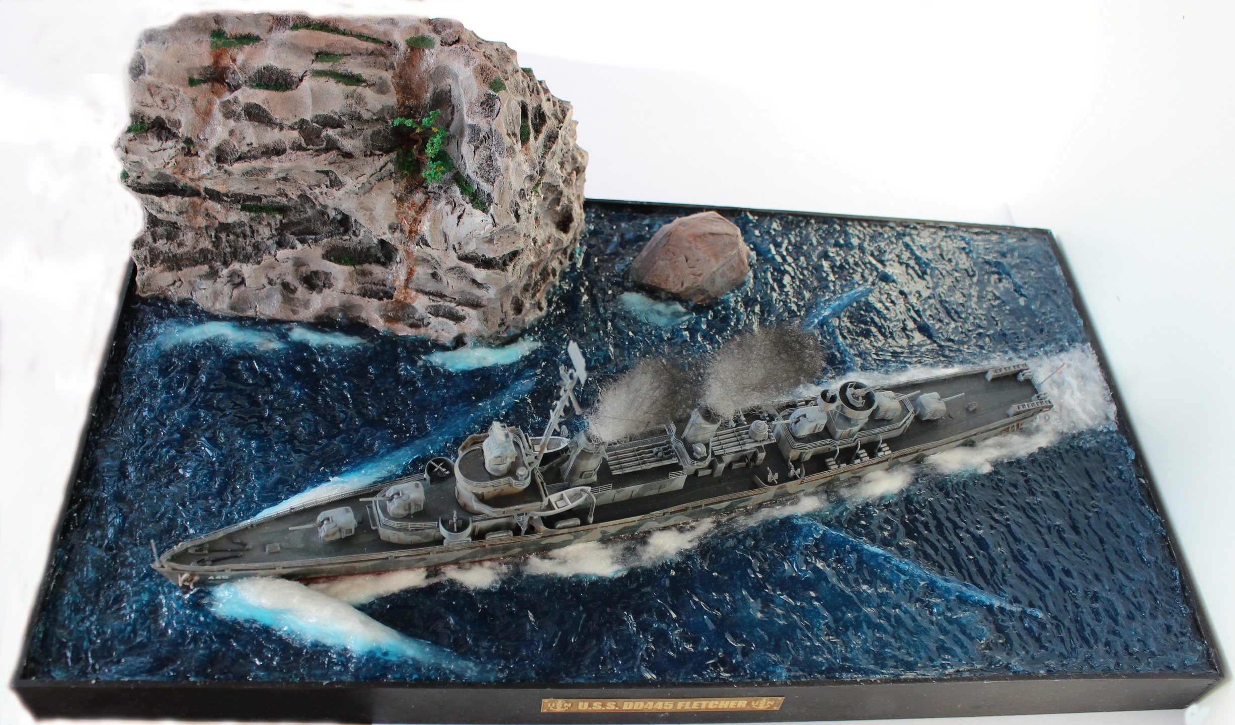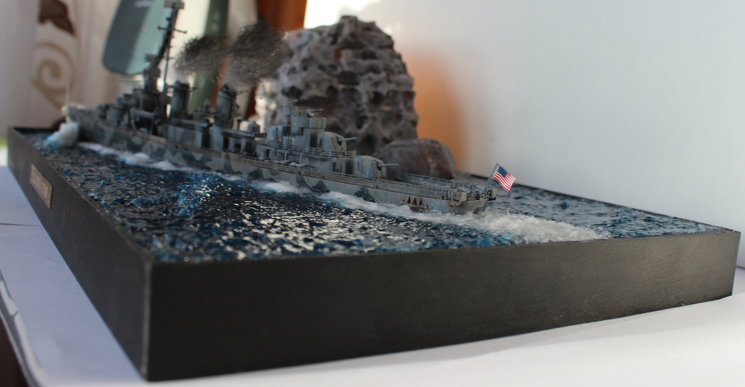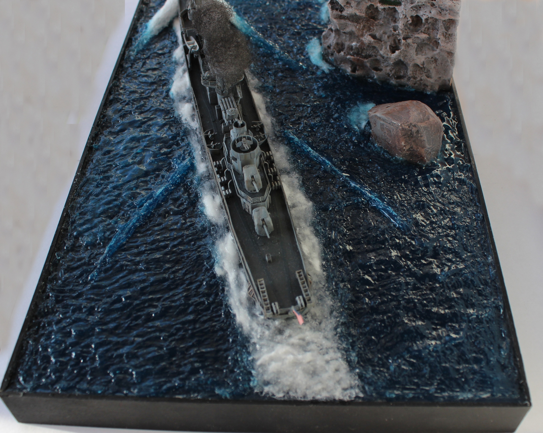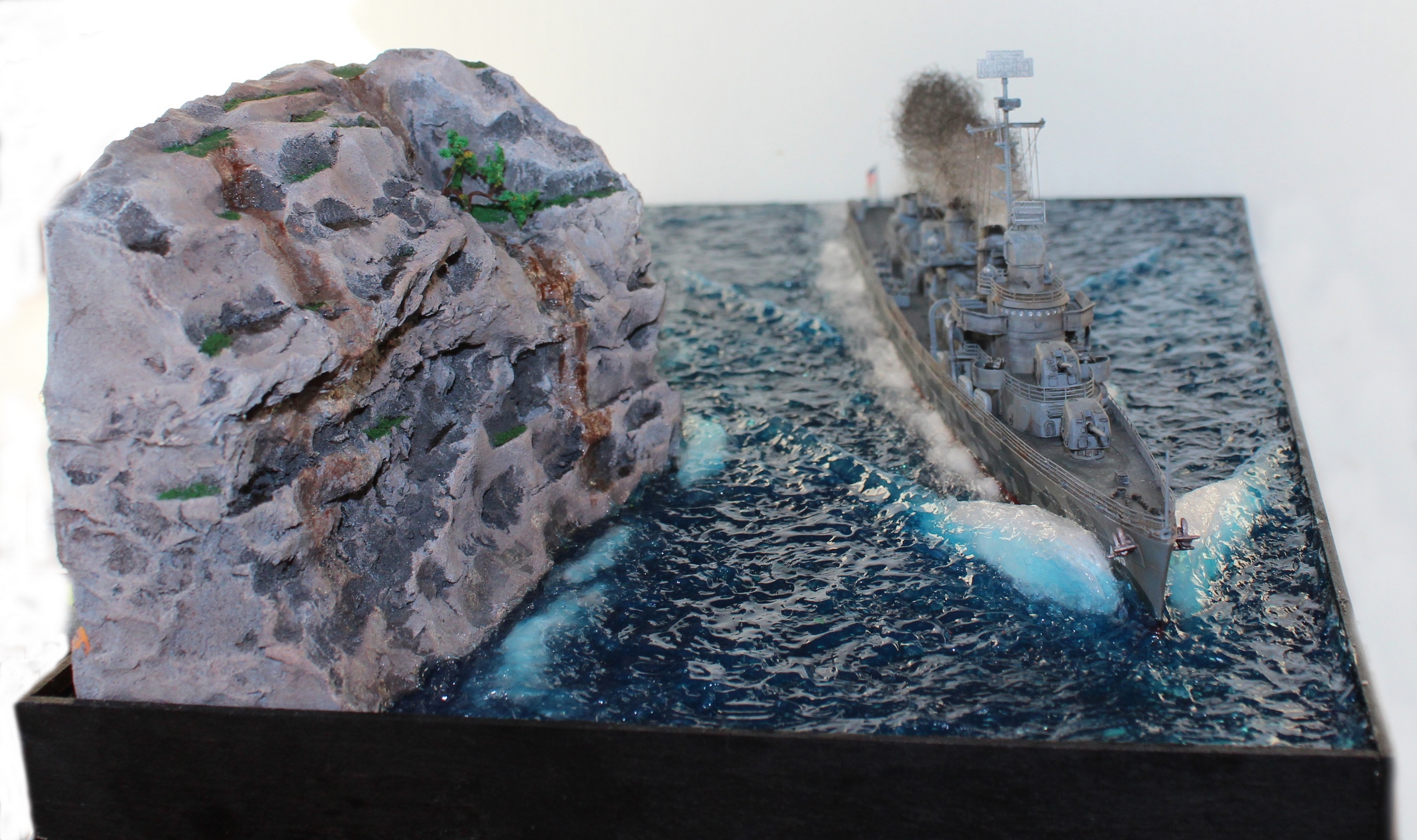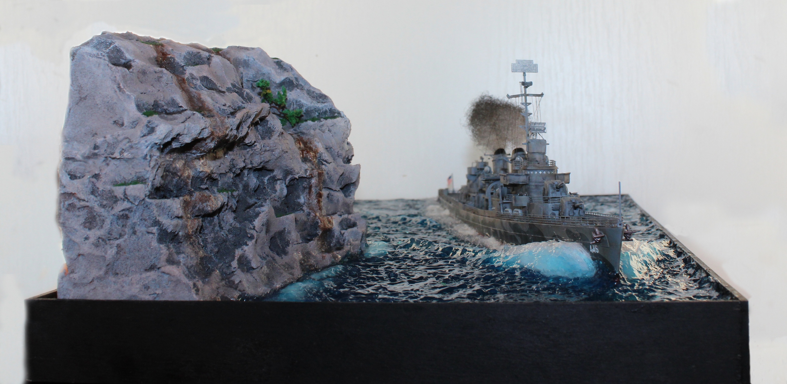 Всем доброго времени суток! Представляю свою работу. Модель американского эсминца от фирмы Tamiya. Фототравление от Eduard. Основа диорамы полипропилен, скала так же из пропилена. Вода из эпоксидной смолы, волны из прозрачного селиконового герметика. Приятного просмотра.