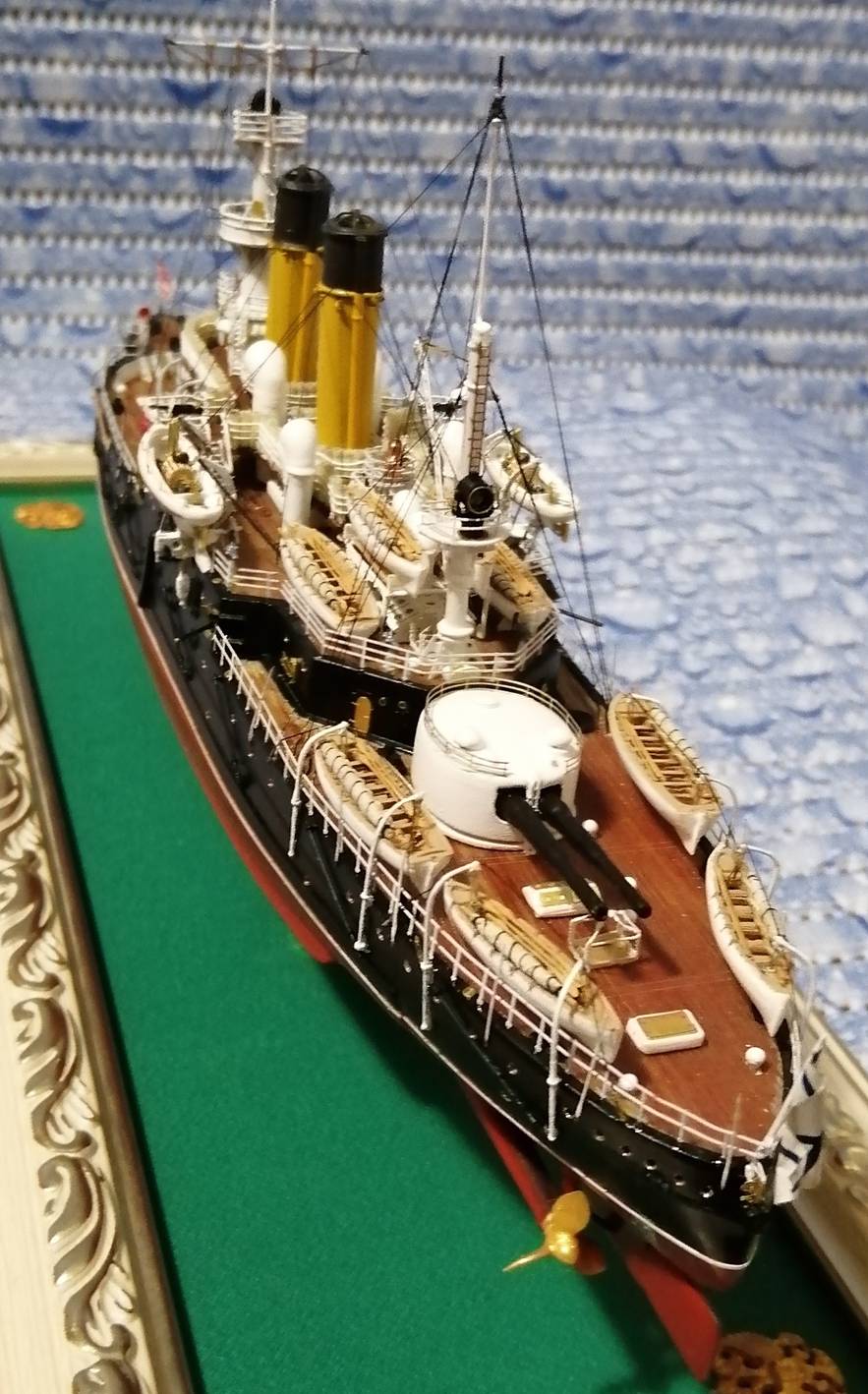 Теперь о модели. корпус сделан из ПВХ пластика 4мм ( набран в пакет по ватерлиниям теоретического чертежа), палуба традиционно для меня из фанеры 0,8мм с последующей разлиновкой ее ножом, надстройки и орудийные башни склеены из пластика 07мм шлюпки ,мелкая артиллерия,кнехты вент, раструбы и прочая мелочевка отлита из смолы аксон 32 в резиновые формы. дымовые трубы из гелевых ручек, мачты из латунной проволоки и ручек от кисточек,такелаж тонкая капроновая нить, леера и якоря - фототравление. Вкратце вроде все.