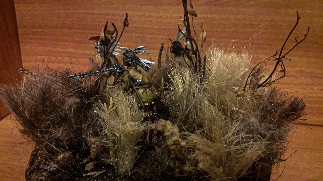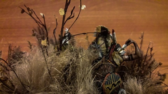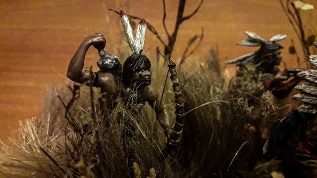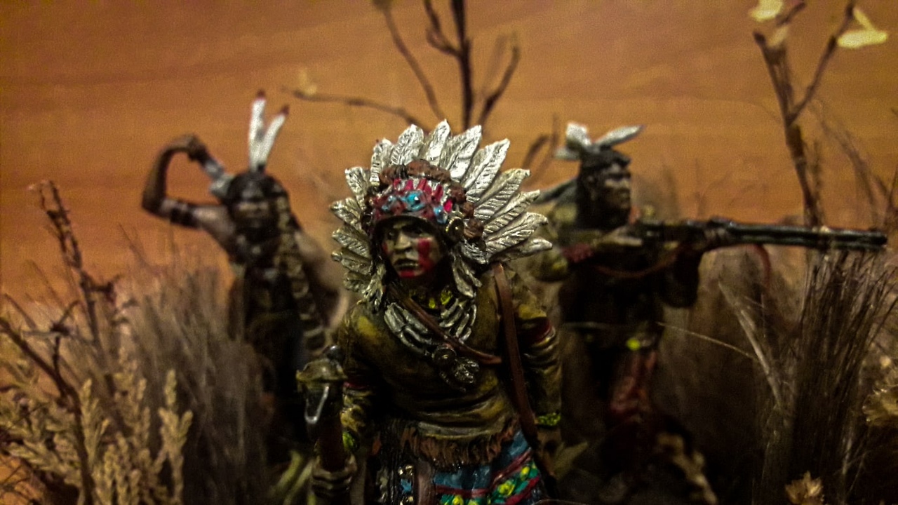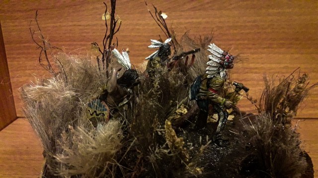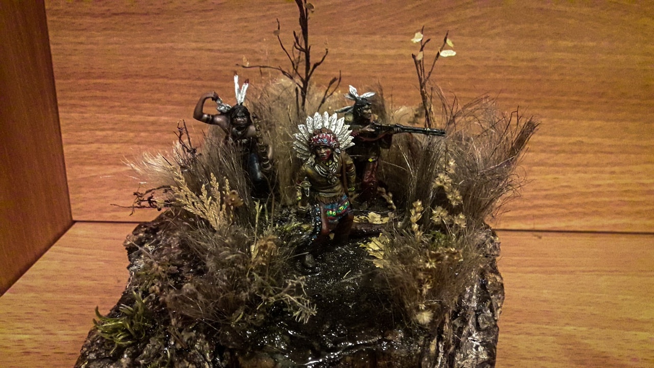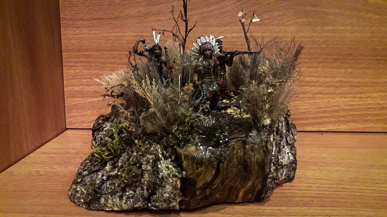 Видно что работа проделана большая, видно что старались, но ужасные фото портят весь Ваш труд! Работу не возможно оценить визуально, а очень бы хотелось (сам сейчас ваяю индейца от ЕК). Рашид хочу дать Вам совет, перефотографируйте диараму, она того стоит, в противном случае её очень сложно оценить, фото слишком темные, не видно деталей одежды, не видно самой подставки все сливается. Сам фотографирую модели или на балконе при дневном свете (если солнечная погода), или с помощью настольной лампы. Что бы лампа не давала отблеска пропустите свет через лист кальки, калька рассеет яркий свет при этом сохранит освещенность. По экспериментируйте с освещением ближе свет, дальше, справа с лева, сделайте десяток фото, посмотрите что не так на компьютере, и затем ещё раз сделайте несколько десятков снимков и выберите лучшие с разных ракурсов. Не поленитесь переснимете работу, ведь её встречают по подаче.