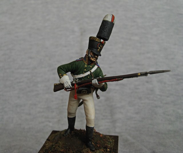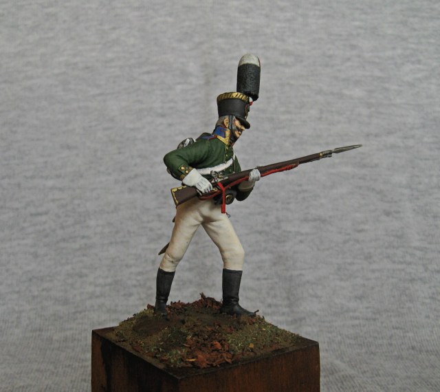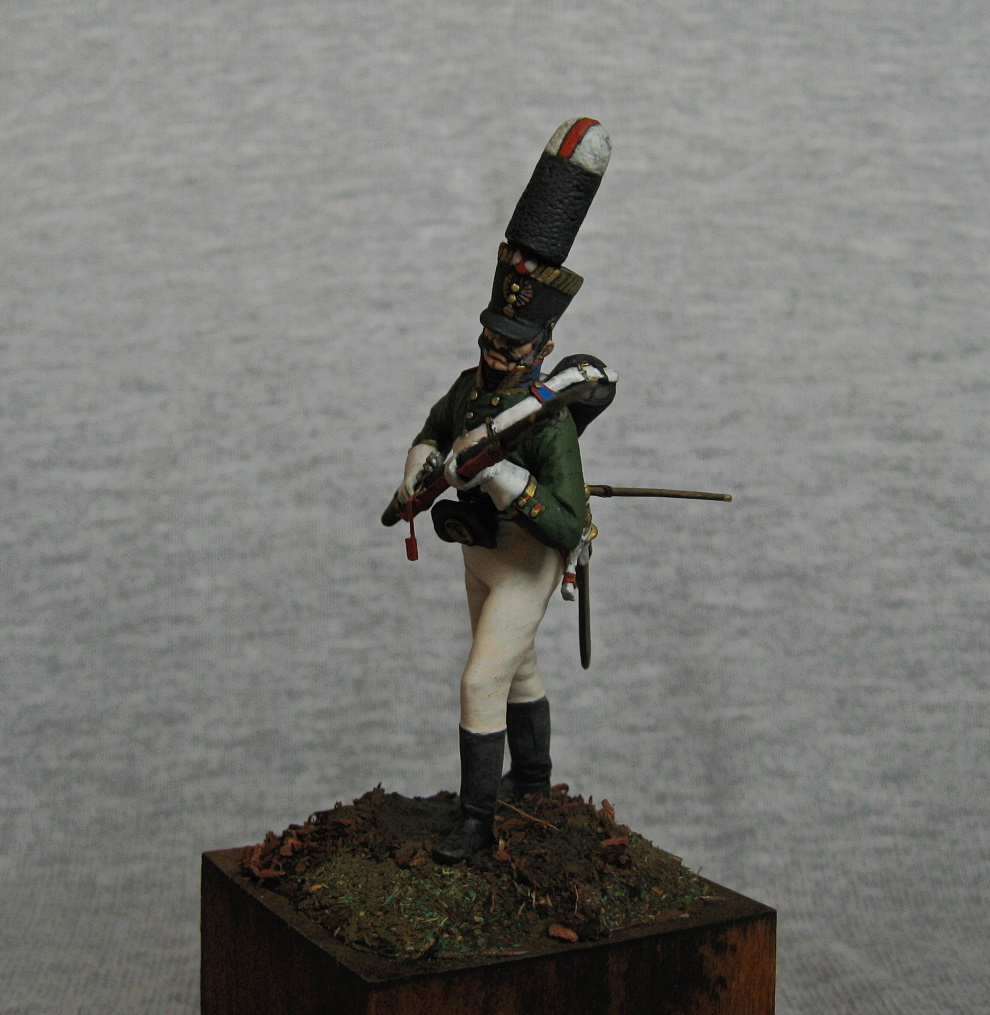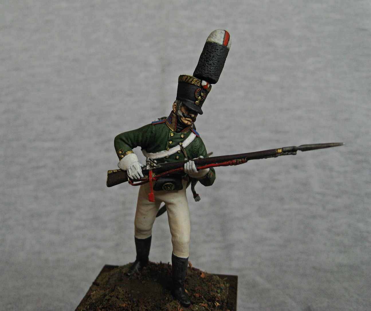 Здравствуйте. Получился вот такой унтер. 9 рота 3 батальона. Некоторые сложности возникли сл стыковкой рук. И еще одно - мастера лепки - до 1808 года погонный ремень крепился за шейкой приклада, а не у подкурочной скобы. Акрил, эмаль.