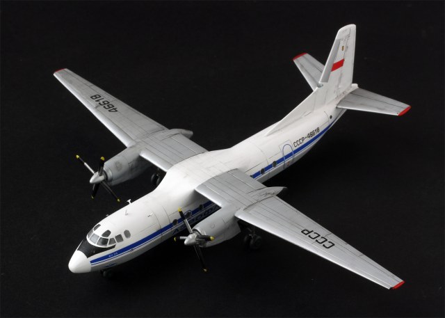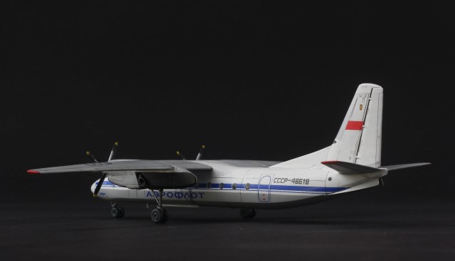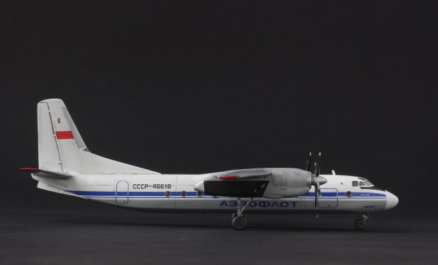 Всё хорошо, кроме передней стойки. Ощущение, что либо колёса немного великоваты, или стойка из варианта "для подставки" в посадочном положении. АН-24 обычно на пару градусов "присевший" на нос относительно горизонтали. Ну и конечно ПОС на винтах, отсутствие солдатиков на крыльях, пары антенн по правому борту, решёток перед обтекателем на носу... В общем, мелочами модель не блещет.