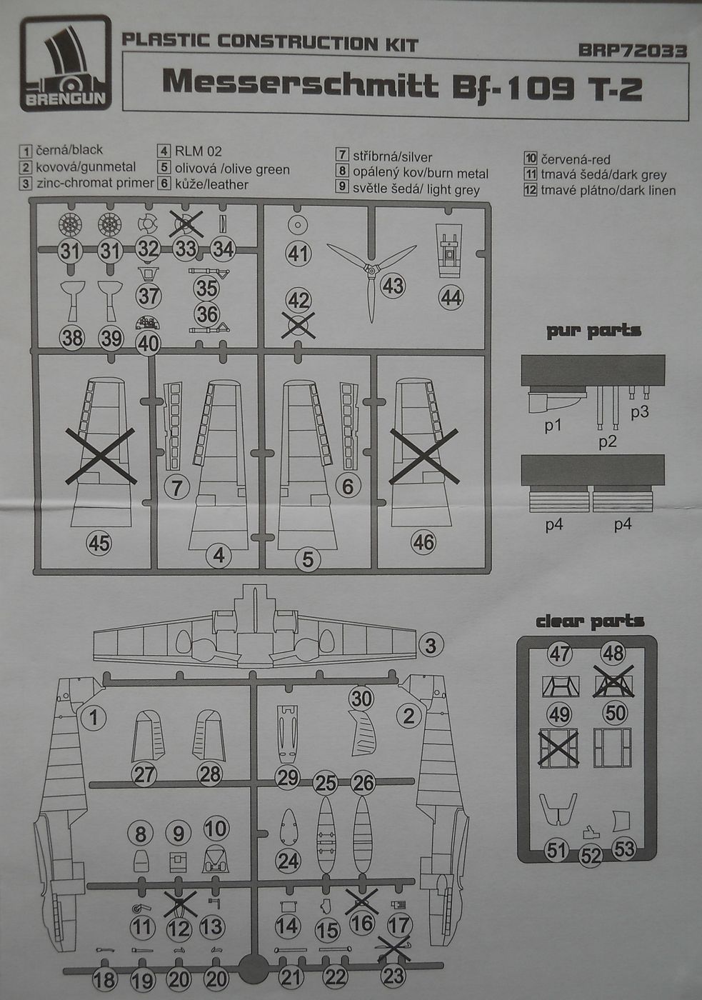 Модель Bf-109 Т-2 от Brengun из пластика в масштабе 1/72 (номер по каталогу 72033). Картонная коробка с боковым открытием. Характерное литьё ЛНД для этой фирмы. Внутренний крой относительно аккуратный. Неплохая деталировка. Фонарь даётся из нескольких частей и смотрится хорошо. Присутствуют детали из смолы. Но, в моём наборе на них имеются мелкие пузыри. Декаль на четыре варианта самолёта. Инструкция по сборке и окраске вполне информативна и наглядна.