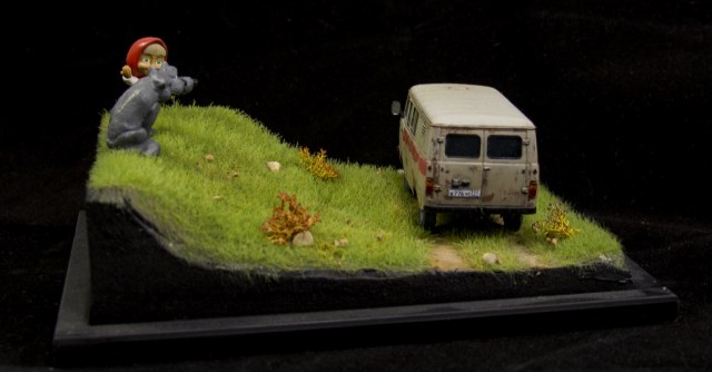 Поставил максимальные баллы. Идея диорамы и сюжета в целом очень понравилась своим безумием - реальная машинка и мультяшные персонажи.