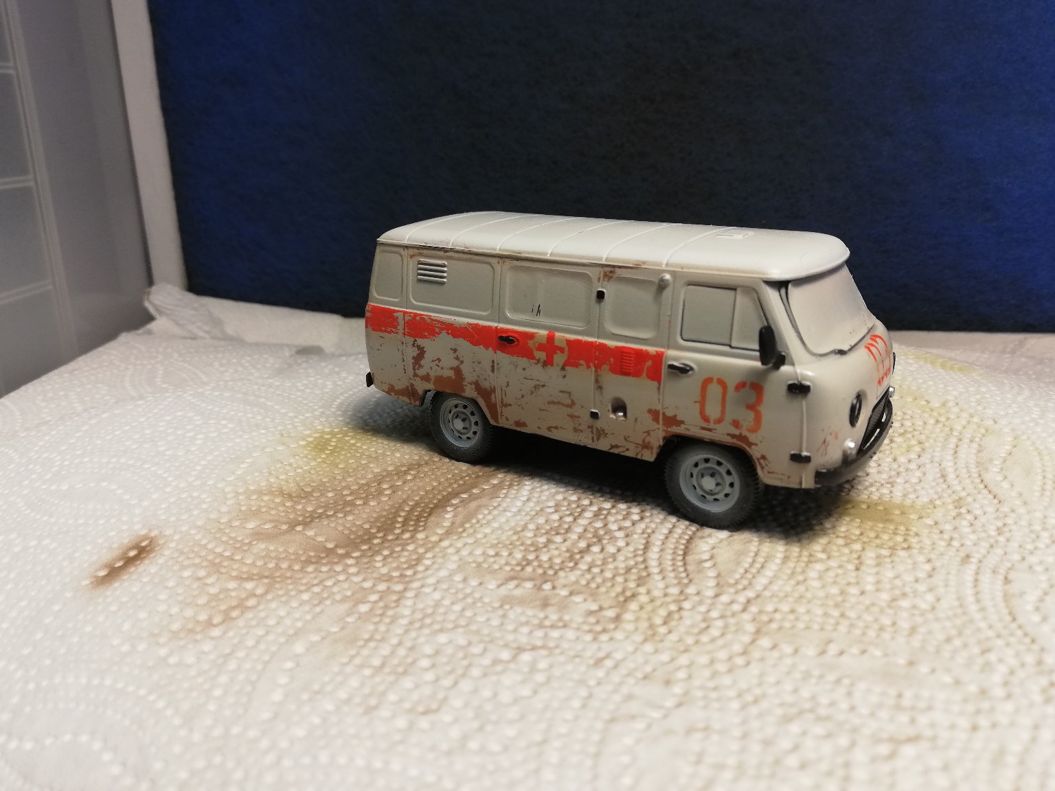 После выхода буханки от Зввезды, попалась мне на глаза фотография ушатаной скорой помощи. Было решено построить такую модельку. Модель быстро собралась, были вырезаны маски на скорую, сделаны занавески в салок. Но как только модель было ободрана и приведена к подобию той, что изображена на фото - мне сразу сказали - "Так это Маша и медведь!".