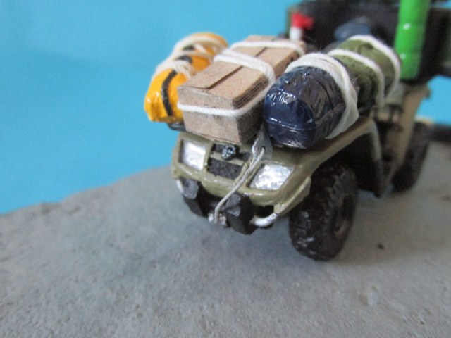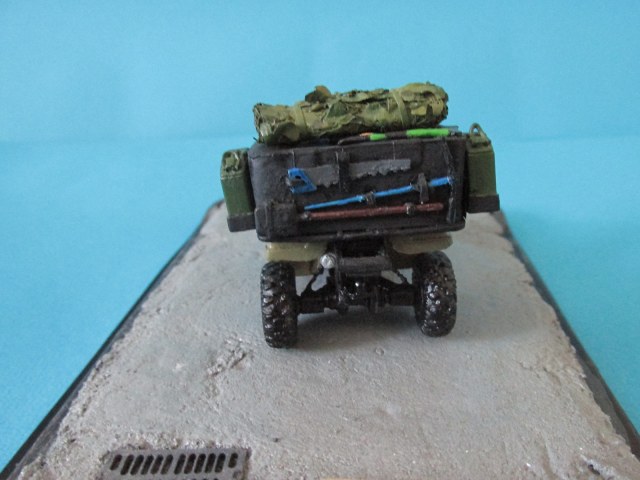 Кофр самодел без привязки к конкретной модели. Кирка, ножовка, топор, массеть, спинка седенья, грузовая стяжка, огнетушитель, крепления для бутылки и сухпая, крюк и трос лебёдки также самодел. В пазы, где по идее должны быть фары вклеил фольгу, а сверху прозрачный пластик, заранее вырезанный по форме.